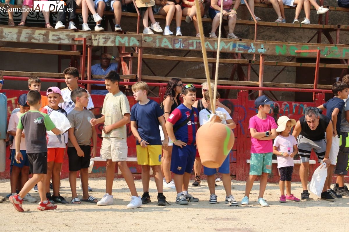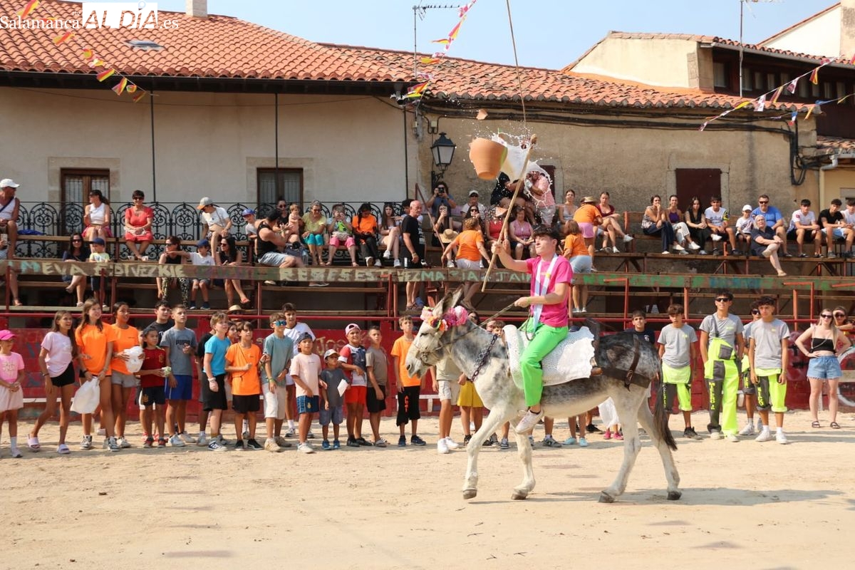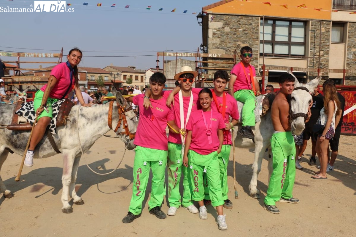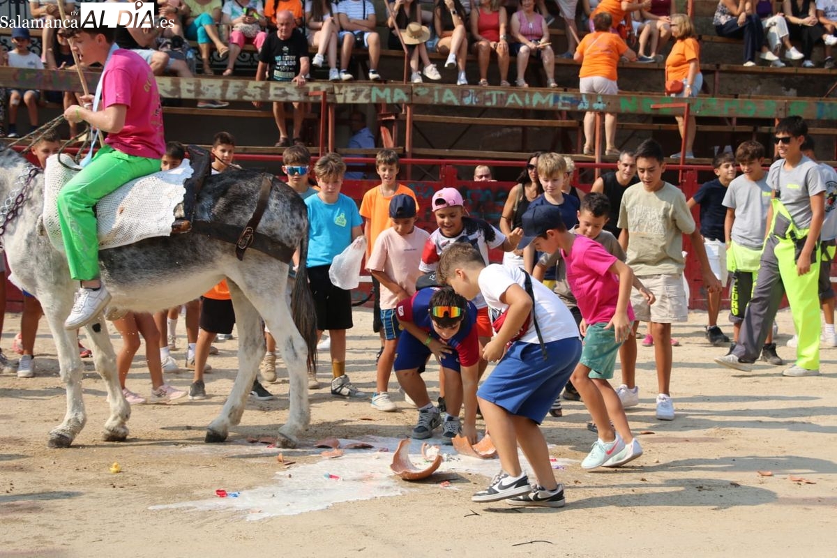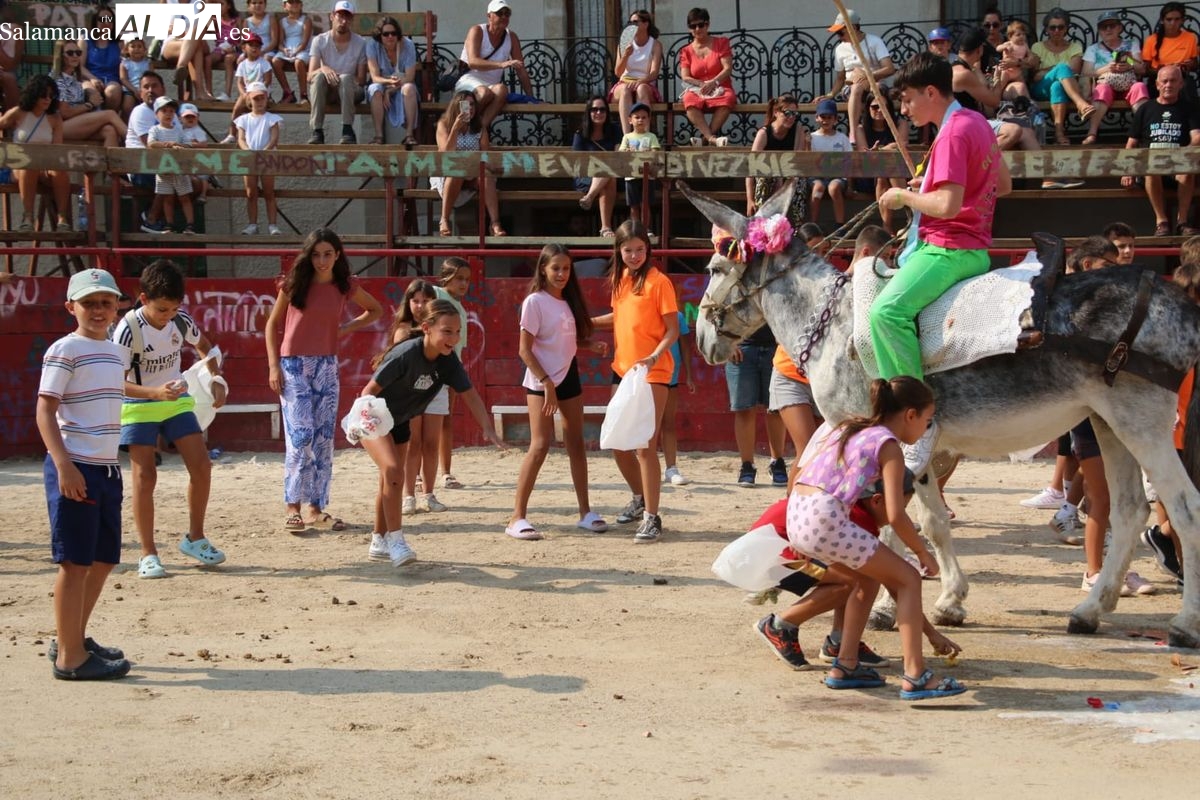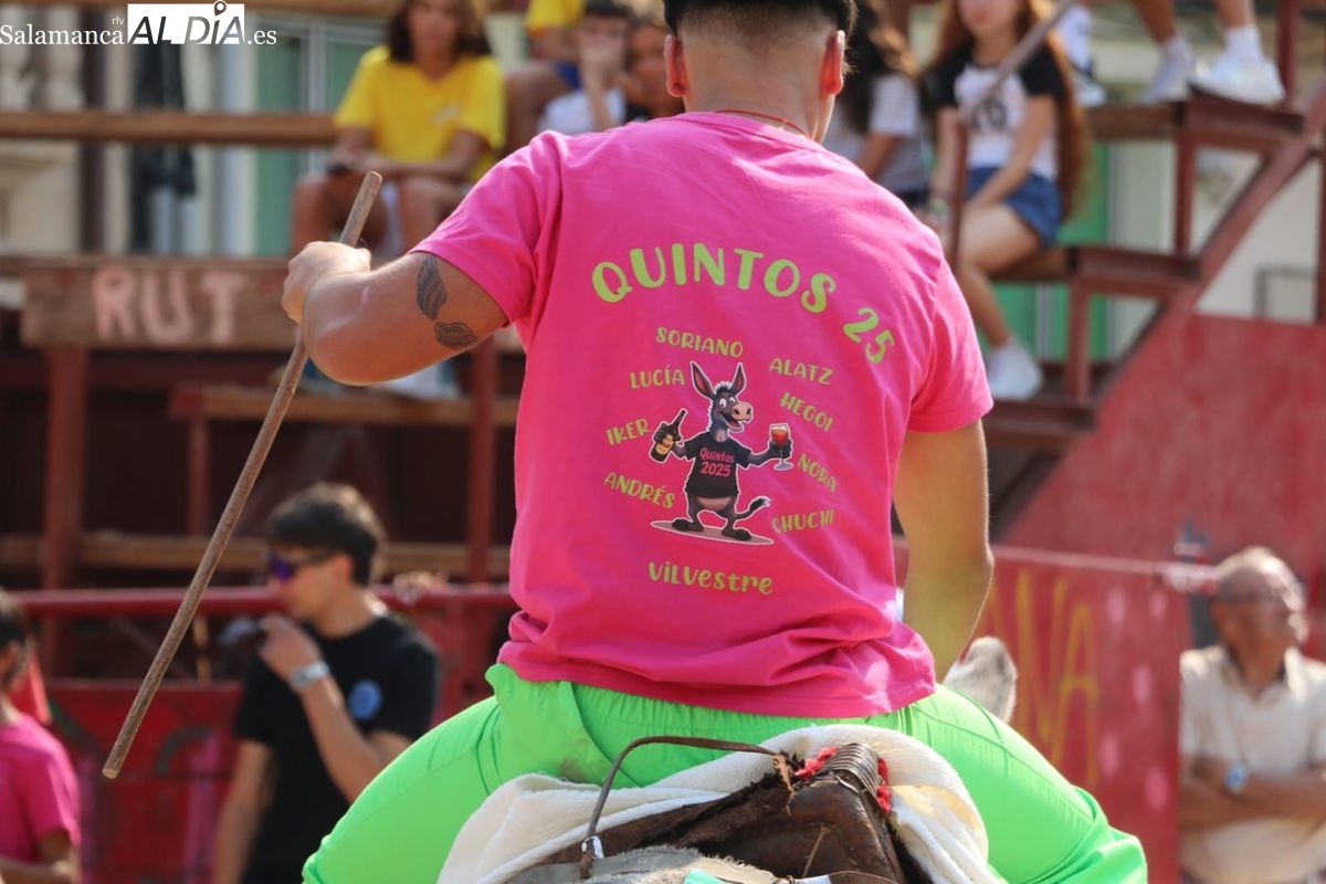 En esta tarde de quintos, este año ya metida en plenas Fiestas del Toro, los jóvenes se montaron a lomos de tres burros para protagonizar la tradicional cogida de cintas y rotura de cántaros, y descubrir así las sorpresas de su interior, todo ello ante la expectación de decenas de niños y niñas que aguardaban ansiosos por hacer acopio de lo que guardaban en su interior, aunque no solo de chucherías o caramelos estaban llenos, pues ante las risas del público aparecían también otras ‘lindezas’ menos agradables.