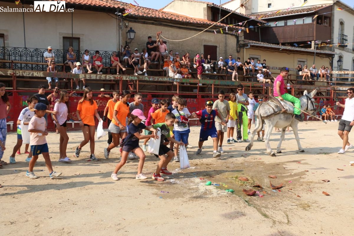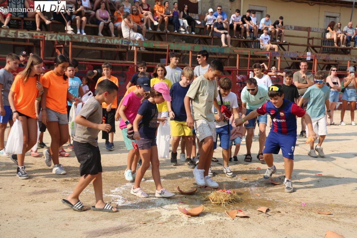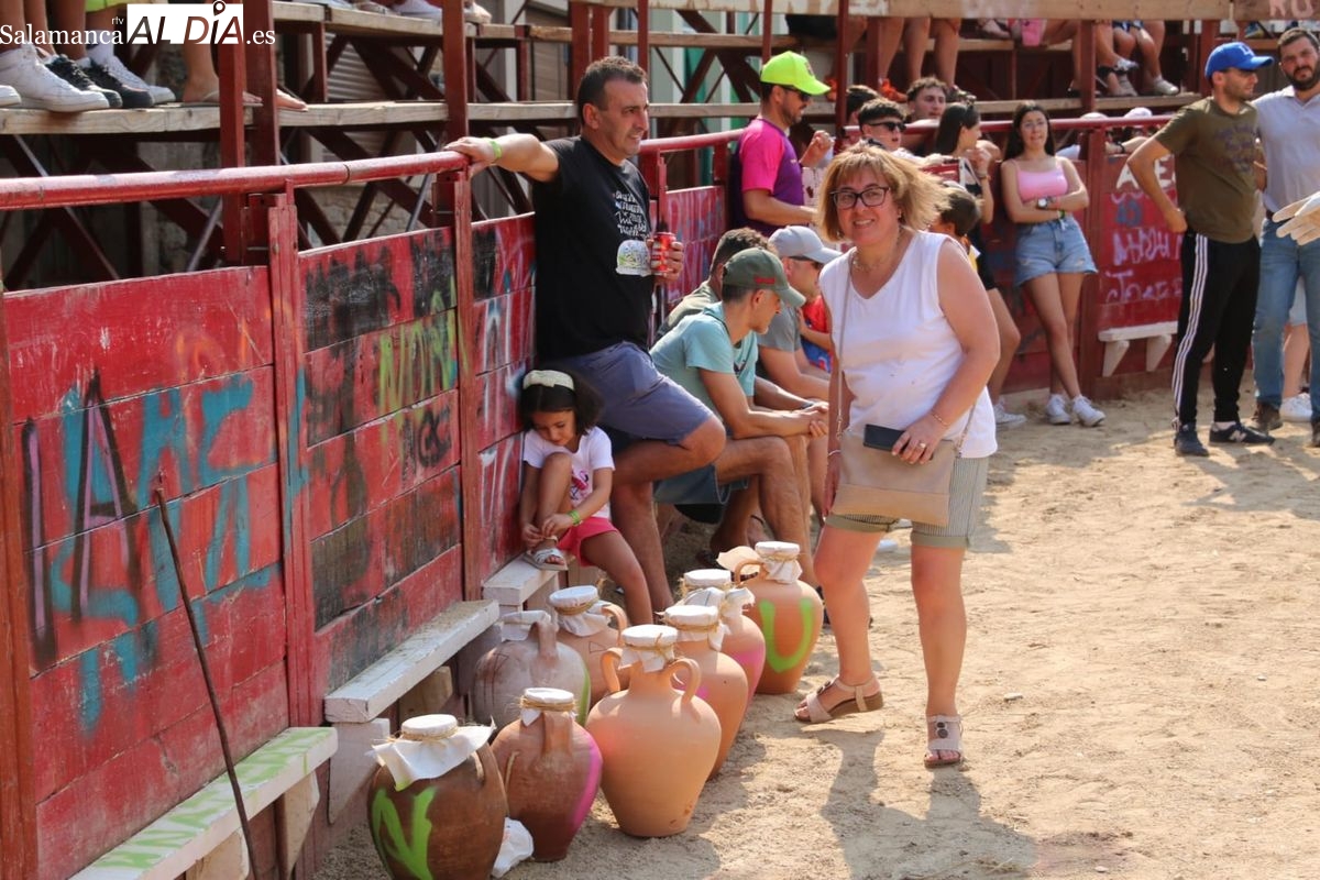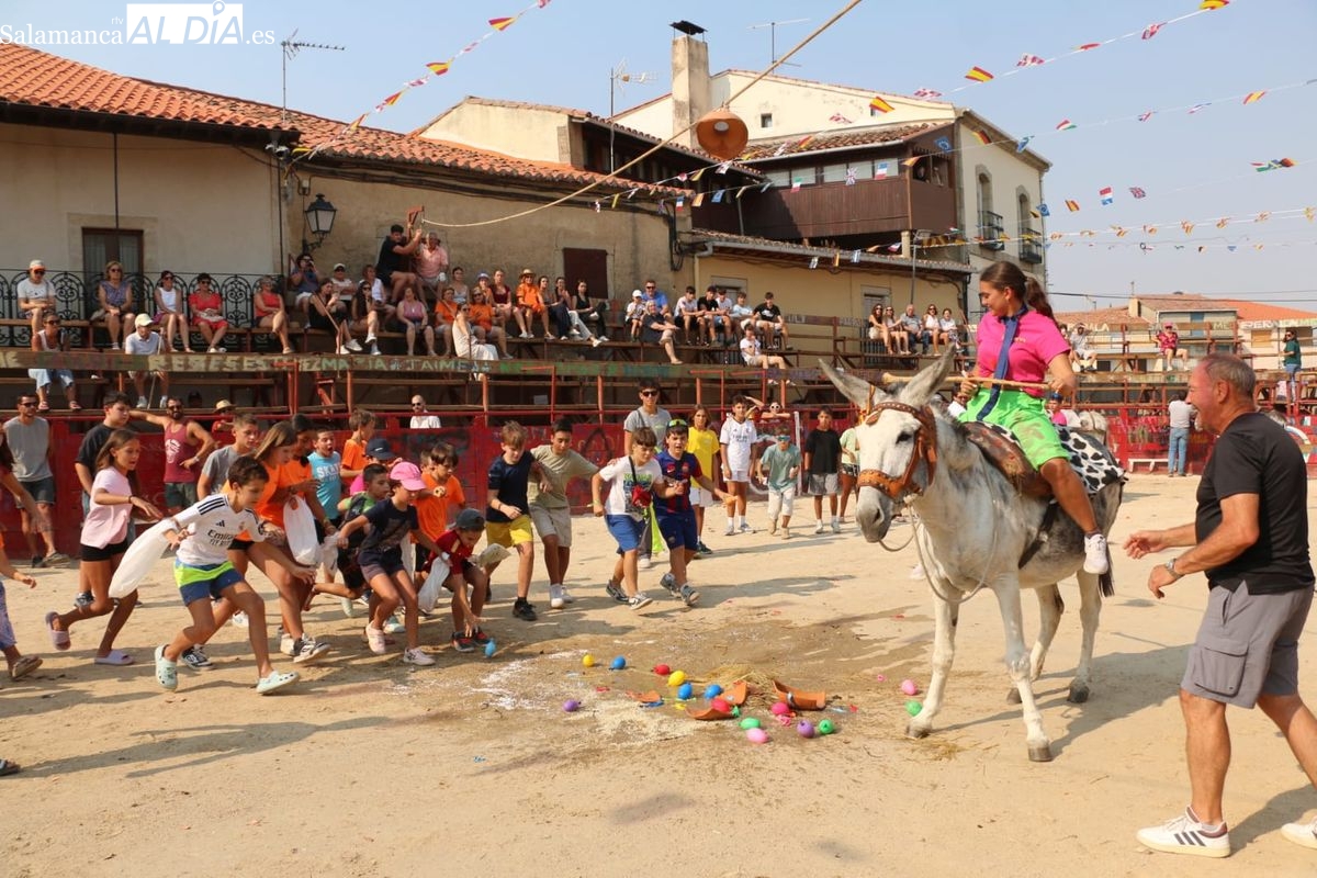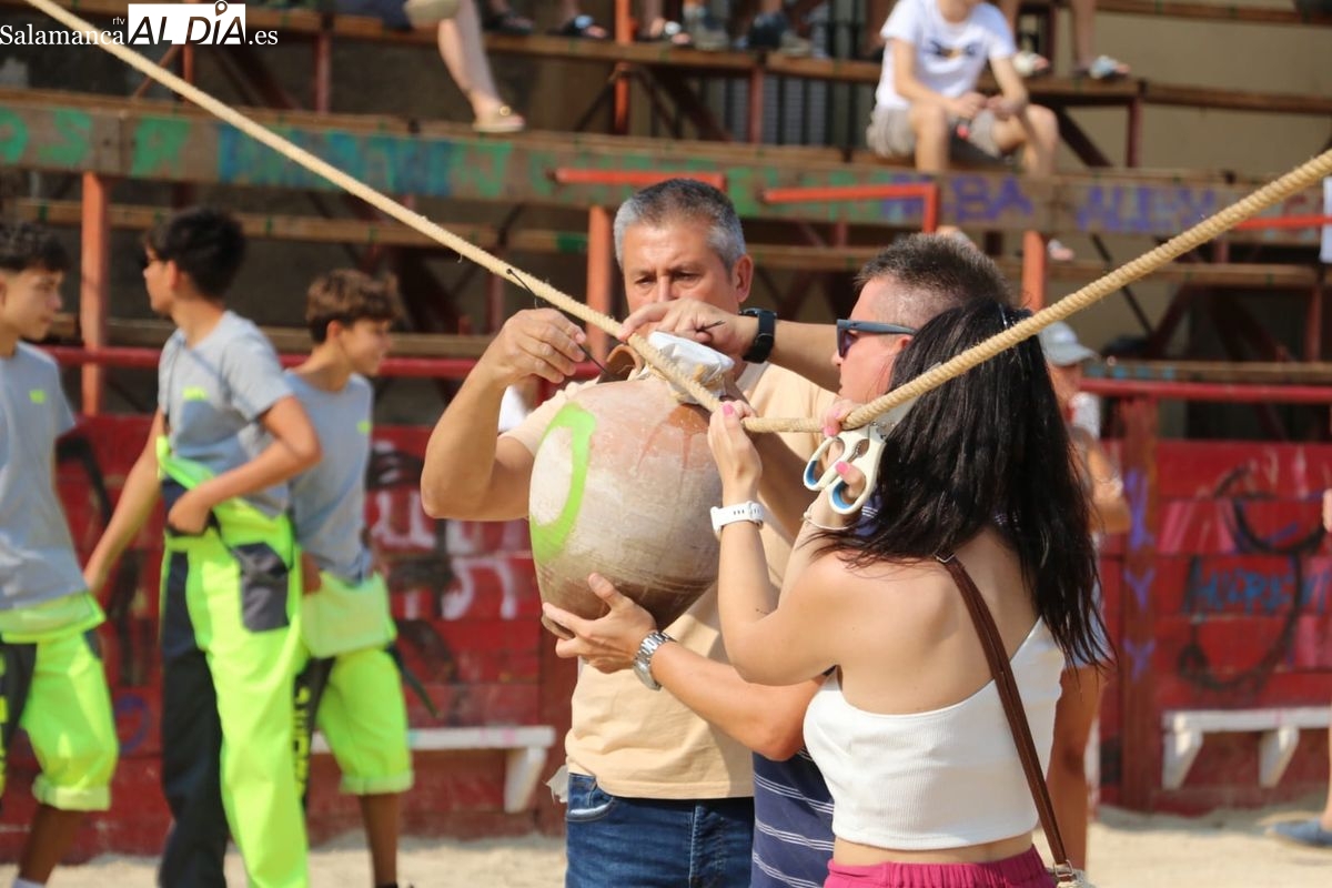 En esta tarde de quintos, este año ya metida en plenas Fiestas del Toro, los jóvenes se montaron a lomos de tres burros para protagonizar la tradicional cogida de cintas y rotura de cántaros, y descubrir así las sorpresas de su interior, todo ello ante la expectación de decenas de niños y niñas que aguardaban ansiosos por hacer acopio de lo que guardaban en su interior, aunque no solo de chucherías o caramelos estaban llenos, pues ante las risas del público aparecían también otras ‘lindezas’ menos agradables.