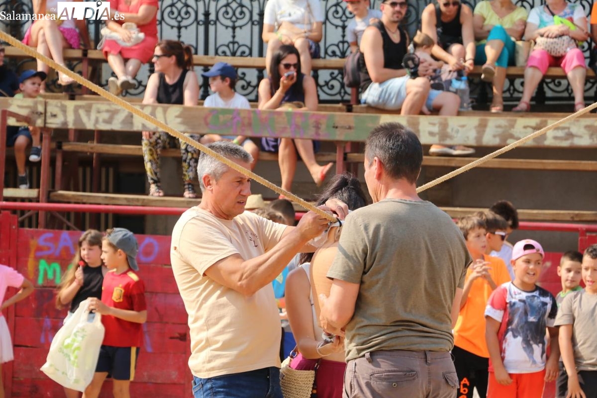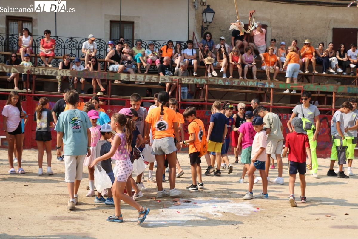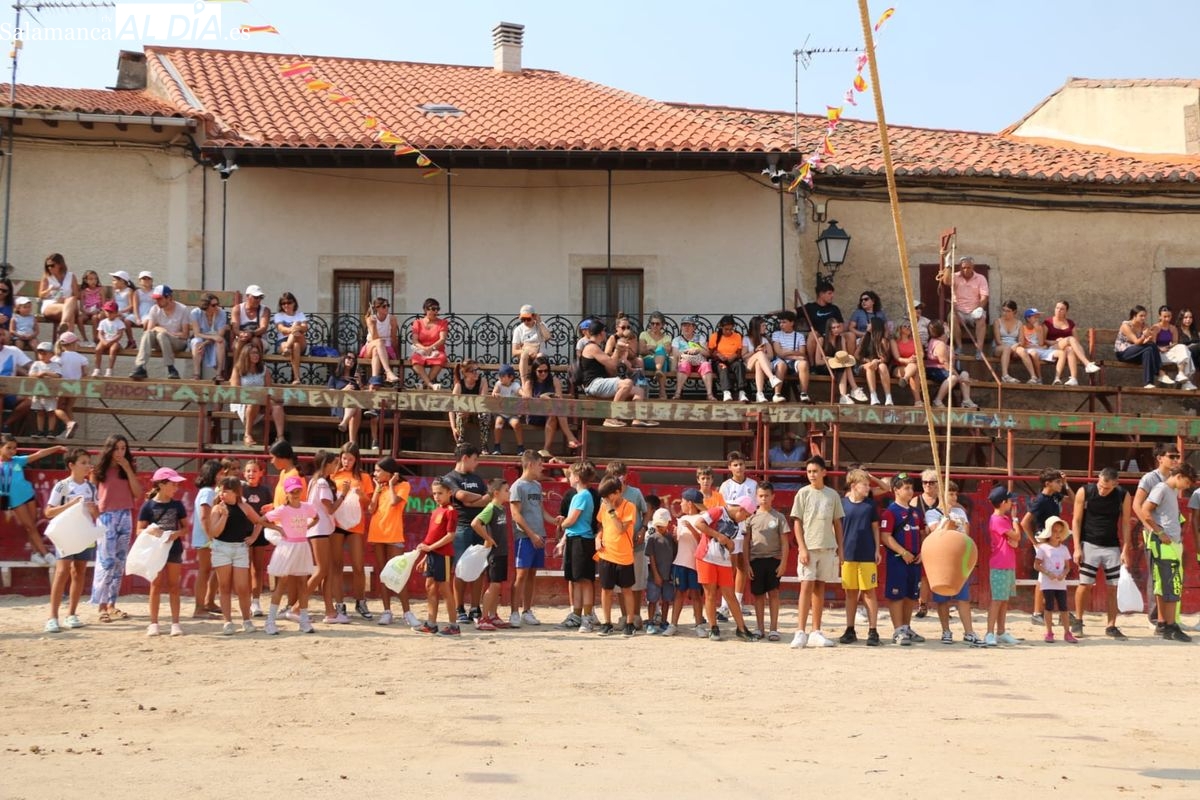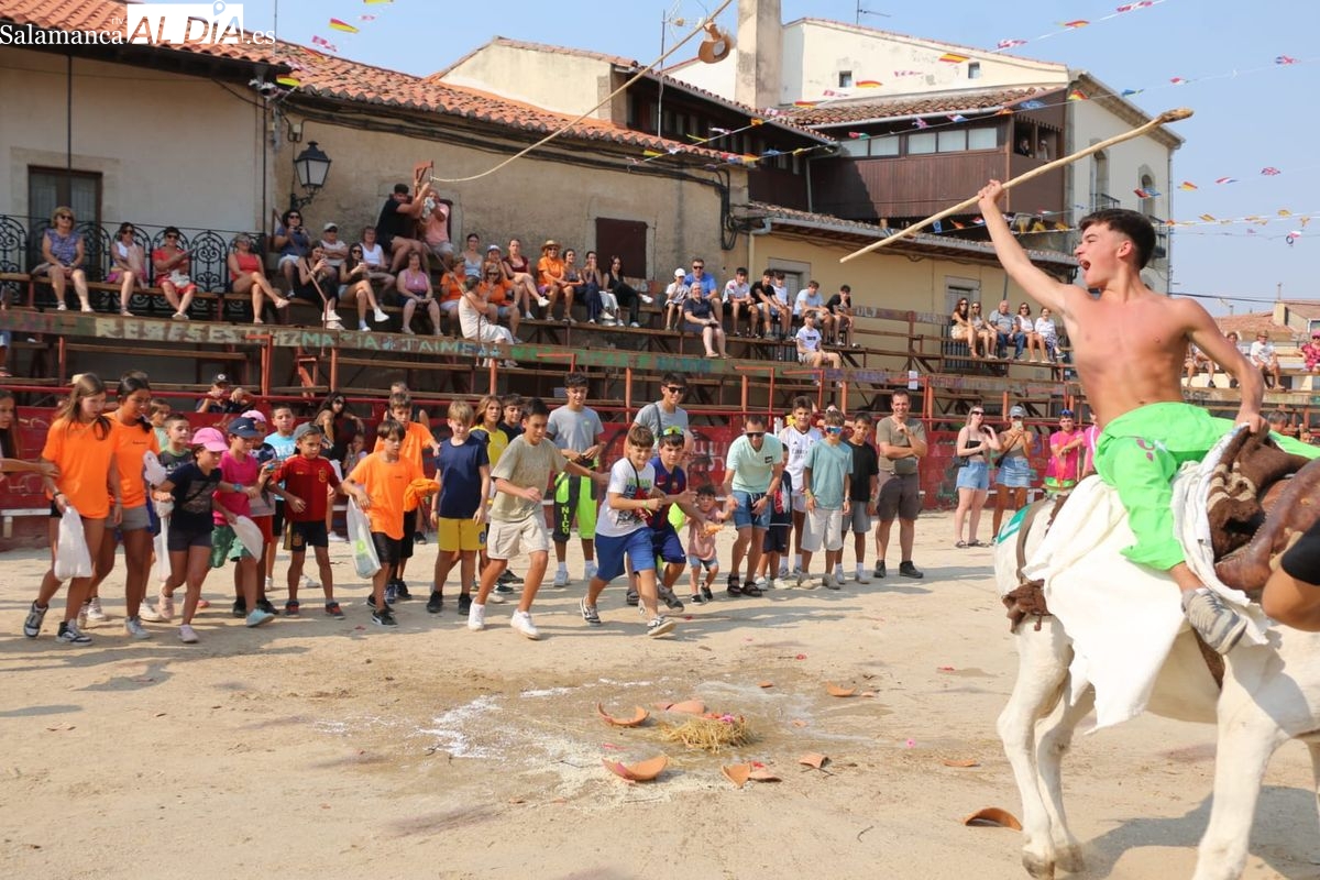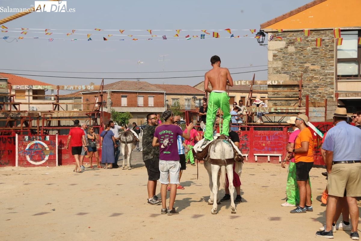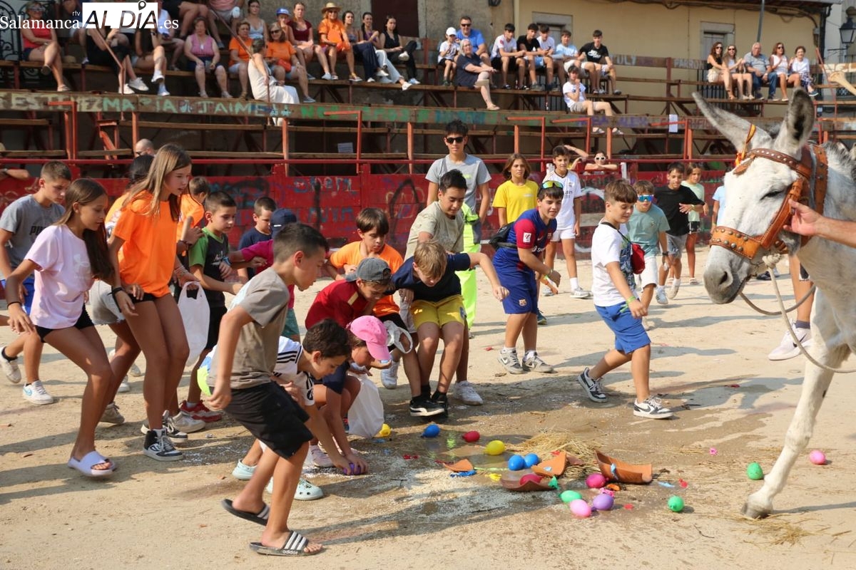 En esta tarde de quintos, este año ya metida en plenas Fiestas del Toro, los jóvenes se montaron a lomos de tres burros para protagonizar la tradicional cogida de cintas y rotura de cántaros, y descubrir así las sorpresas de su interior, todo ello ante la expectación de decenas de niños y niñas que aguardaban ansiosos por hacer acopio de lo que guardaban en su interior, aunque no solo de chucherías o caramelos estaban llenos, pues ante las risas del público aparecían también otras ‘lindezas’ menos agradables.