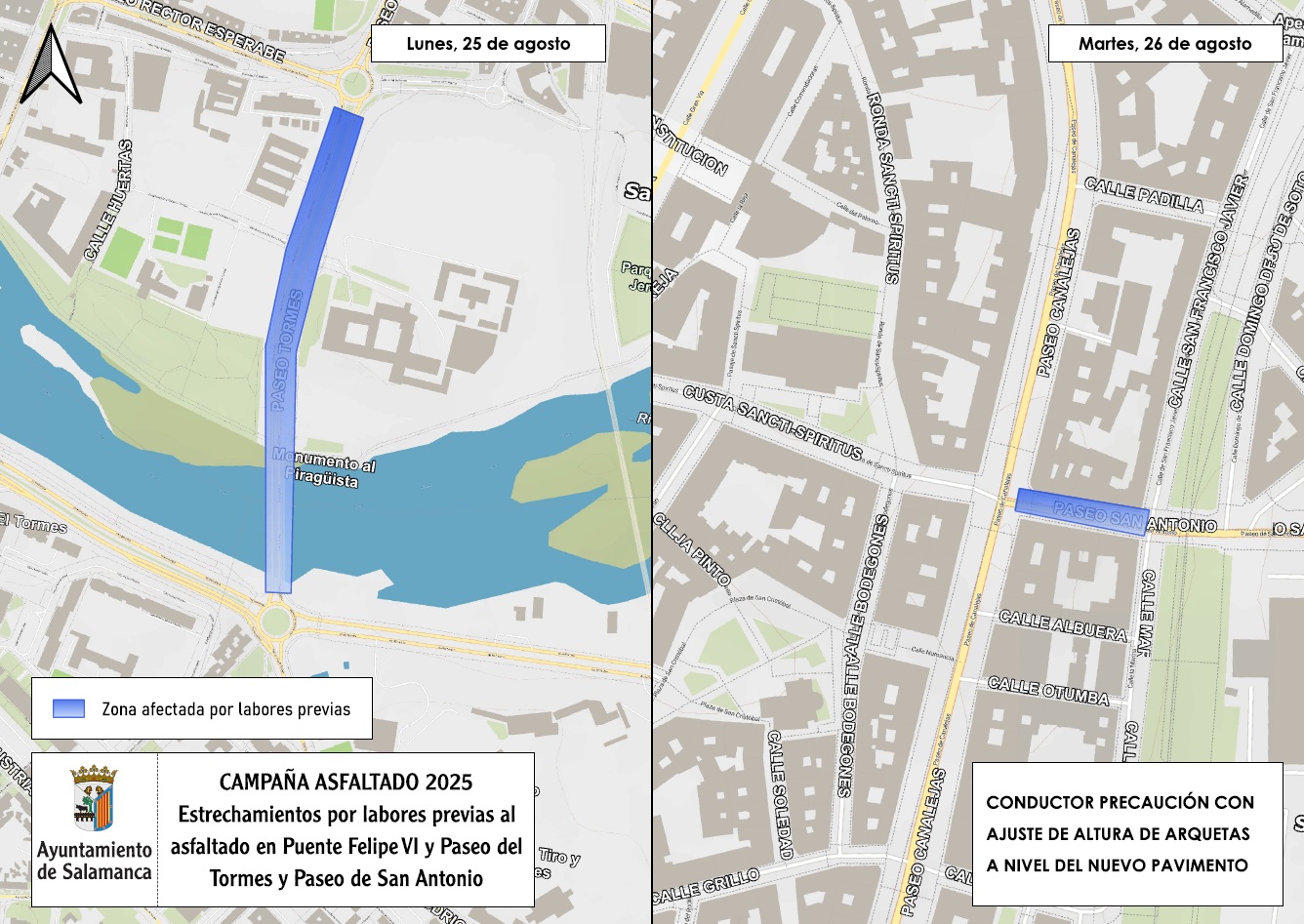 - Jueves 28 de agosto: Las obras de fresado se trasladarán al paseo del Doctor Torres Villarroel, afectando al tramo desde la Glorieta de Santiago Martín 'El Viti' hasta la Glorieta de la UDS, en sentido de entrada a la ciudad.