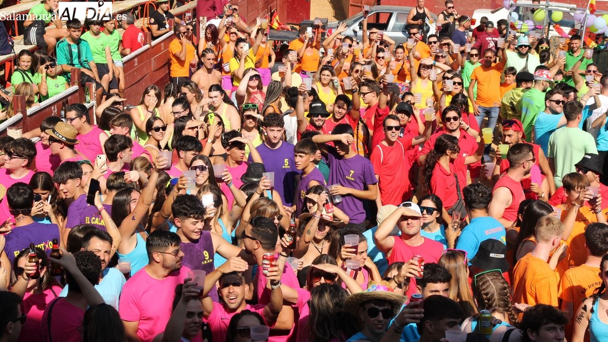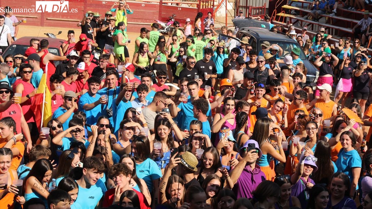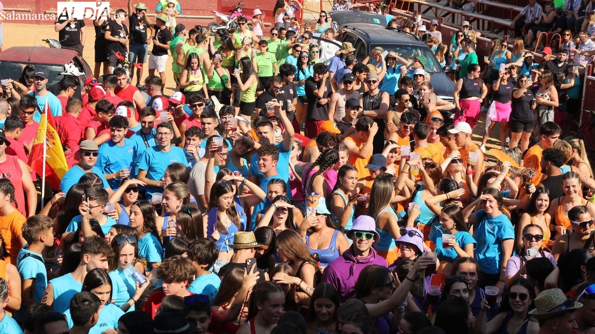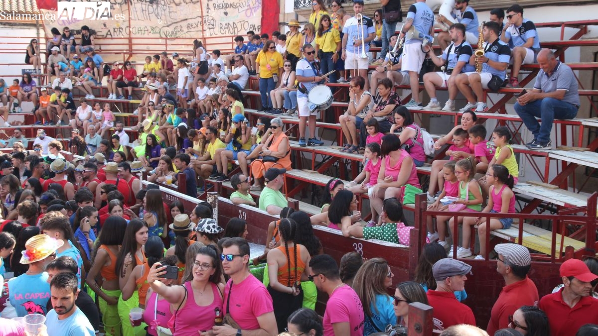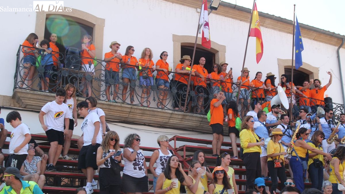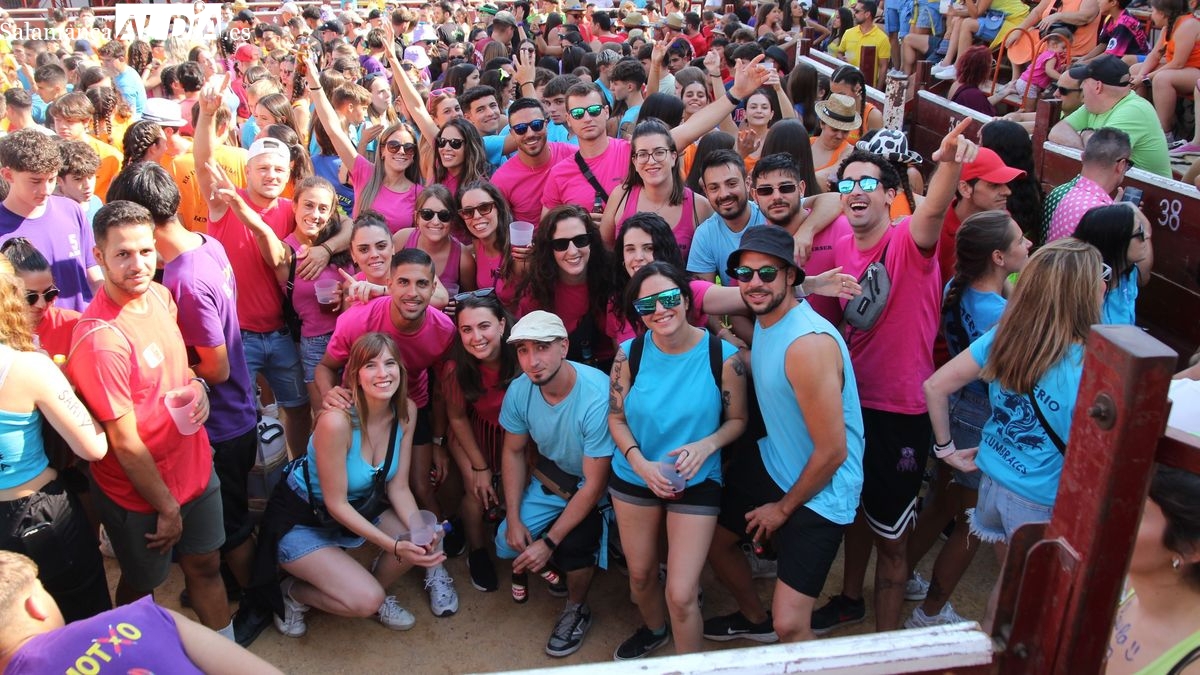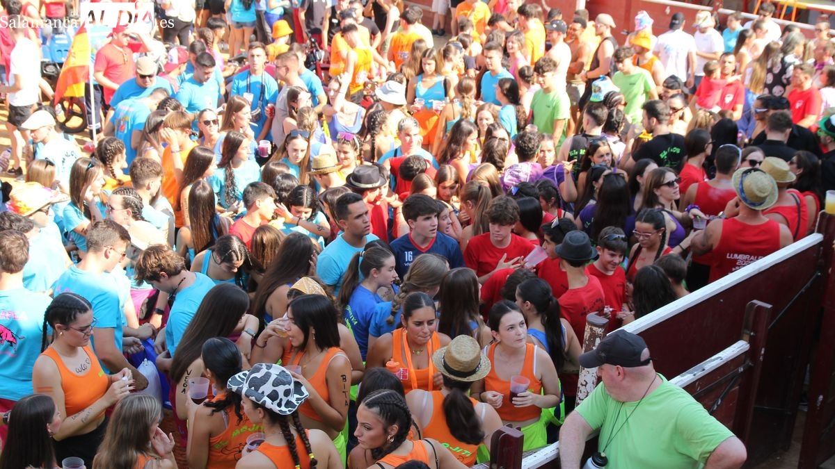 El coso taurino montado en la Plaza Mayor ha sido escenario esta tarde de un multitudinario, alegre y colorido encuentro de las Peñas de Lumbrales, el pregón de peñas y el chupinazo que marcan el inicio de 'Los Toros', los días grandes de las fiestas de Lumbrales que se celebran los días 23, 24, 25 y 26 de agosto.