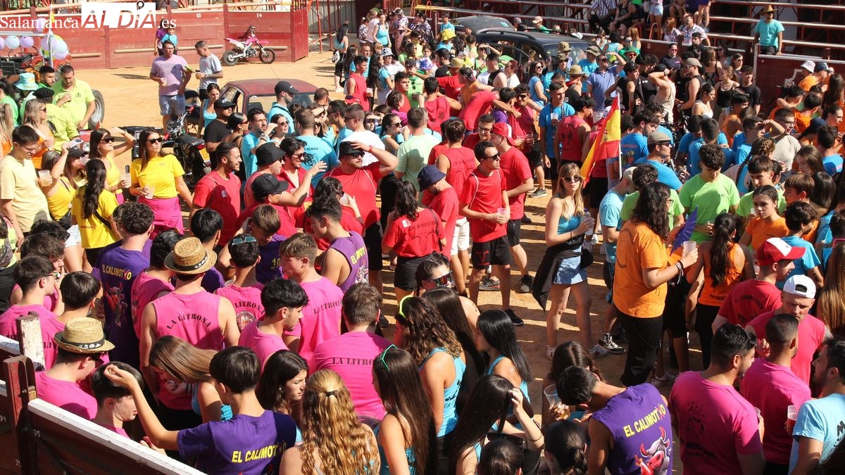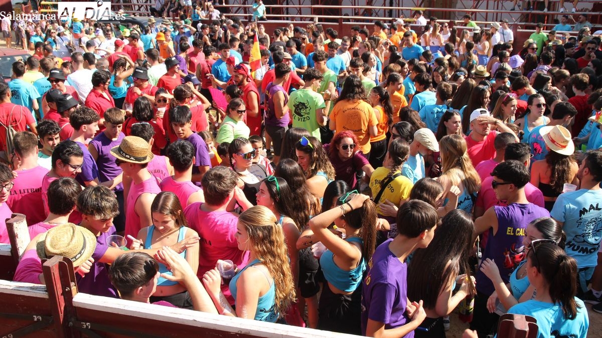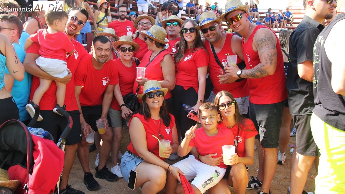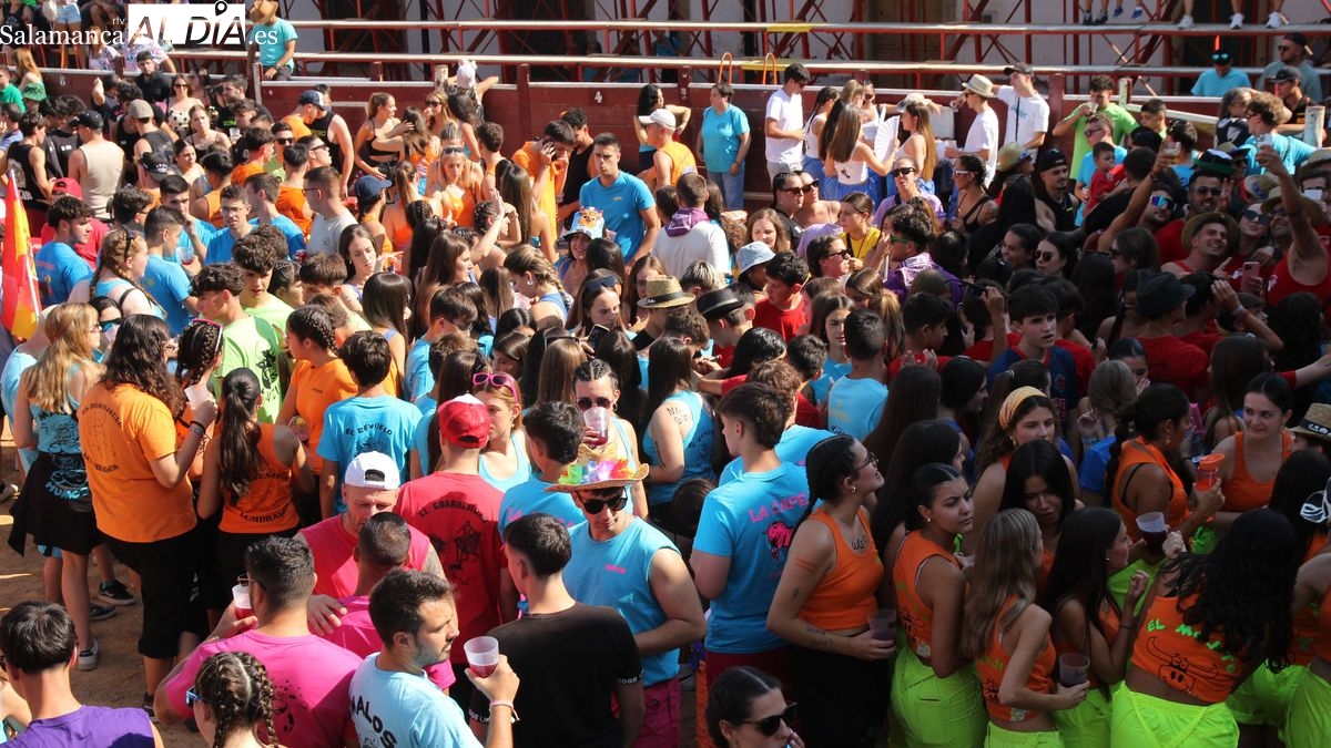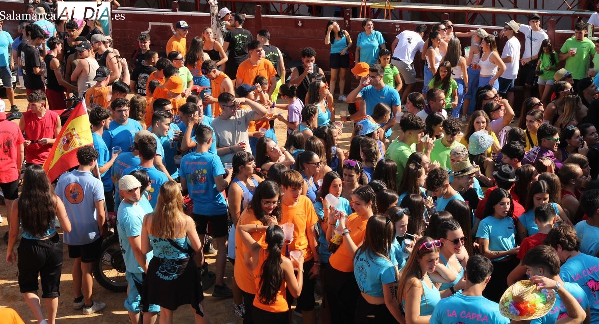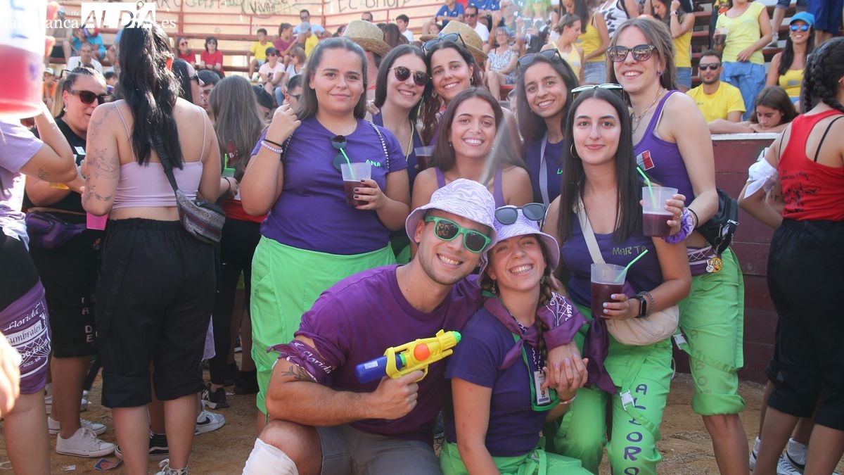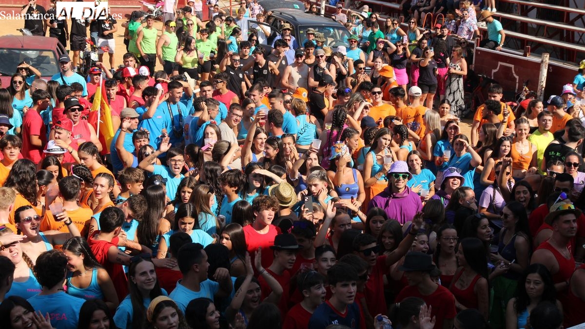 El coso taurino montado en la Plaza Mayor ha sido escenario esta tarde de un multitudinario, alegre y colorido encuentro de las Peñas de Lumbrales, el pregón de peñas y el chupinazo que marcan el inicio de 'Los Toros', los días grandes de las fiestas de Lumbrales que se celebran los días 23, 24, 25 y 26 de agosto.