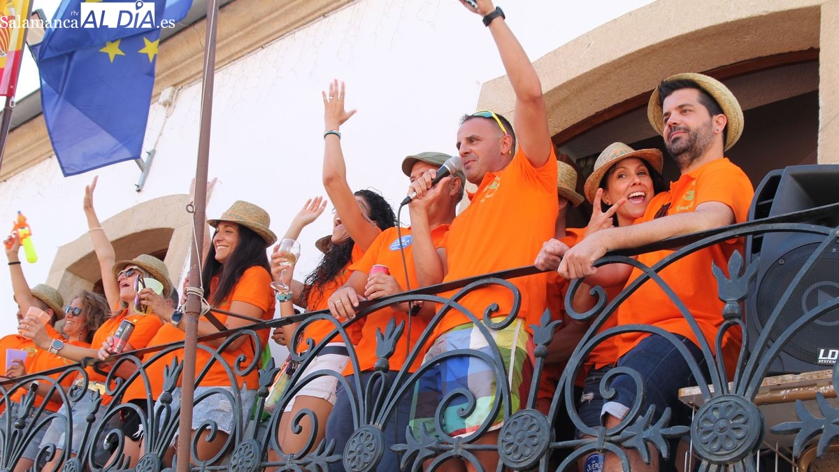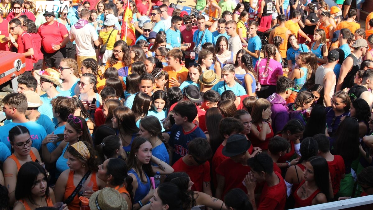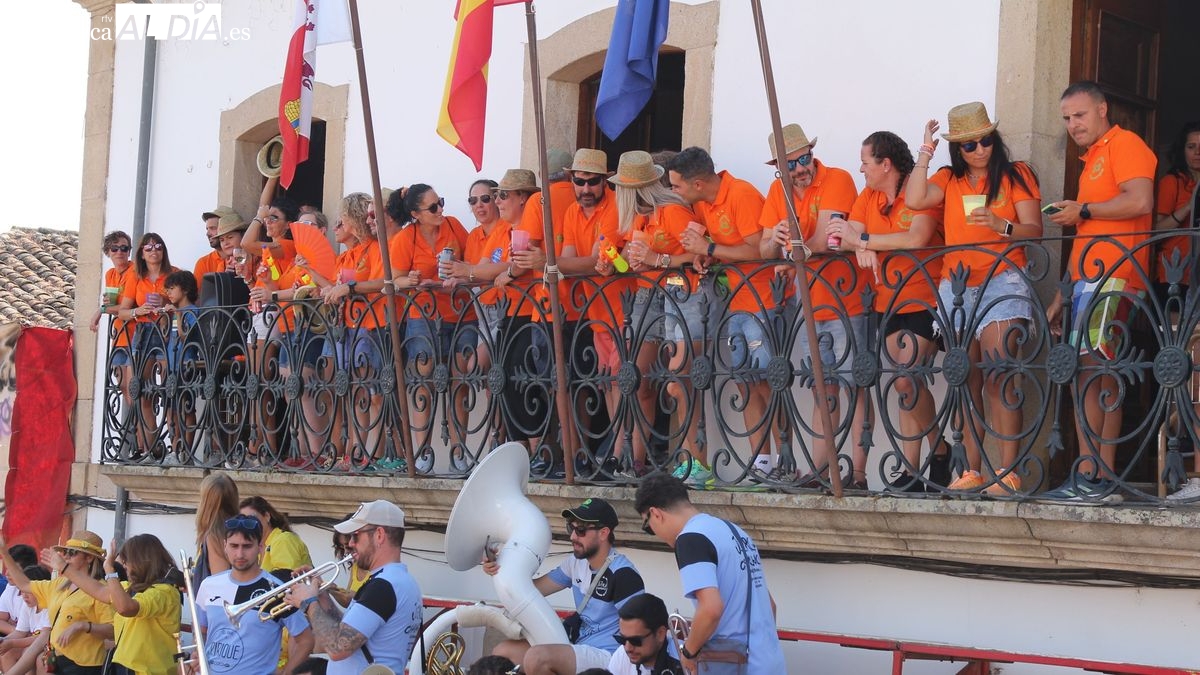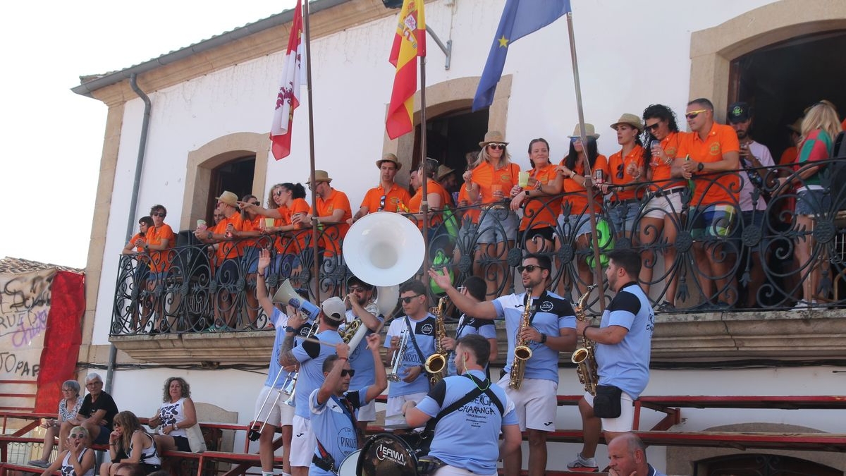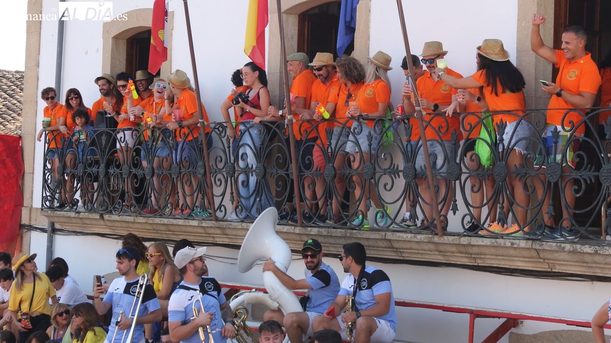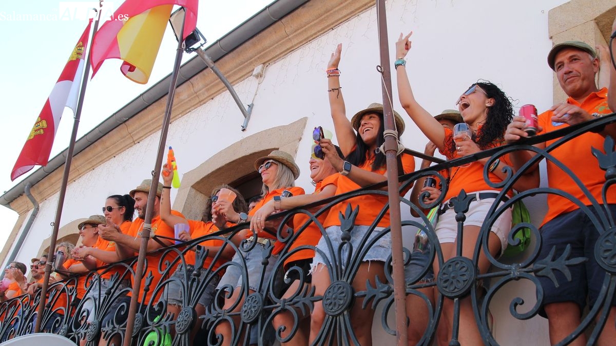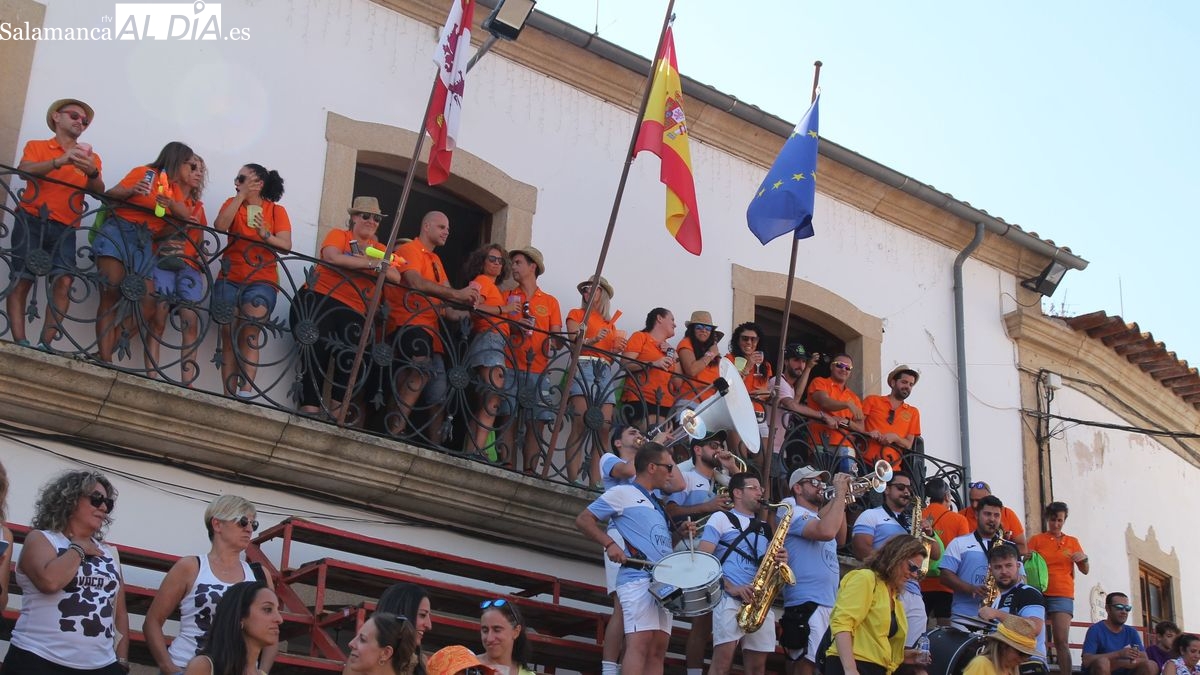 En este acto ha tenido un protagonismo destacado un peña especial, 'Los Quintos Plateros del 2025', un dinámico grupo de medio centenar de jóvenes, chicos y chicas nacidos en 1982, que han sido invitados por el Consistorio a pronunciar el pregón de las Peñas en el día que celebraban el 25 aniversario de su quinta. Desde el balcón del ayuntamiento, Javi Pérez, en nombre de los Plateros, animó a todos los presentes a disfrutar de las fiestas de Lumbrales "las mejores fiestas del mundo", unas fiestas que han marcado "la primera vez en nuestras vidas en muchas cosas: primeras peñas, primeras fiestas, primeros momentos de....". El pregonero invitó a los presentes a levantar el vaso y brindar por las fiestas de 2025, un brindis que provocó el estallido de la alegría, el bullicio y las animación en los cientos de jovenes reunidos en la arena de la plaza bajo un intenso calor. En sustitución del chupinazo (por la prohibición de utilizar material pirotécnico por el riesgo de incendio) los jóvenes participaron en la cuenta atrás, del del 10 al 0, que culminó con el arranque musical de la charanga.