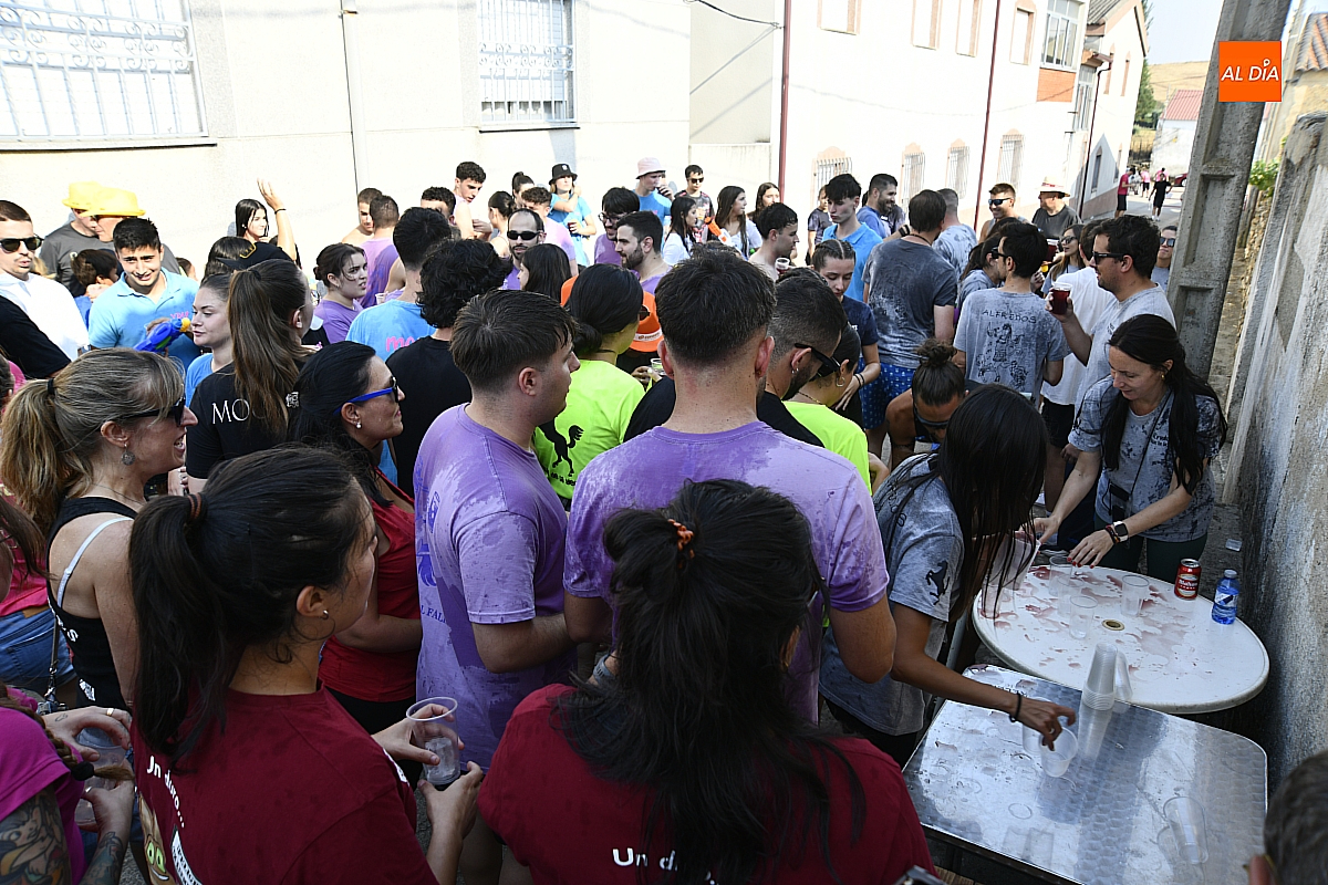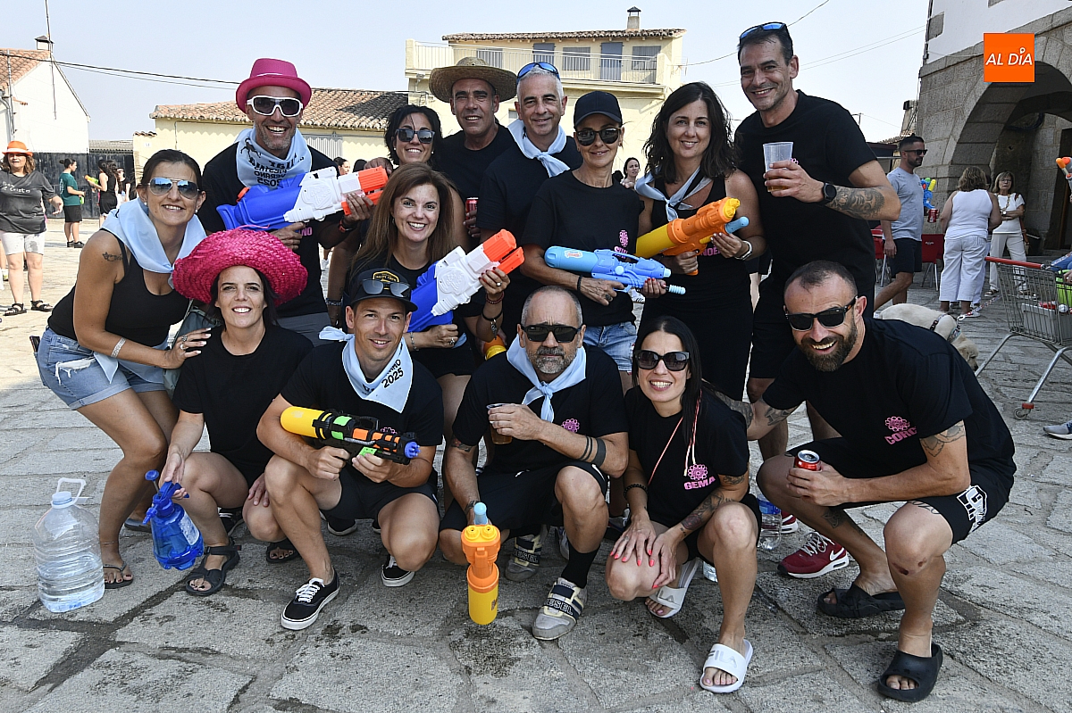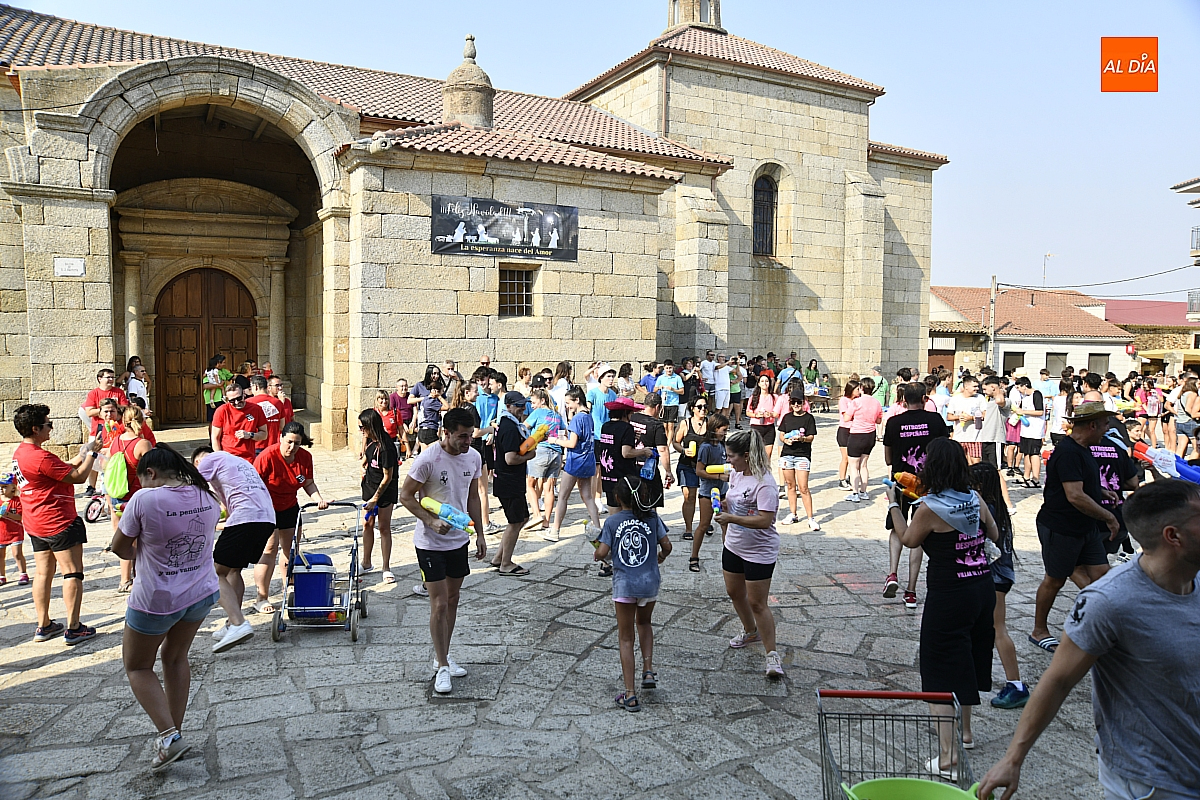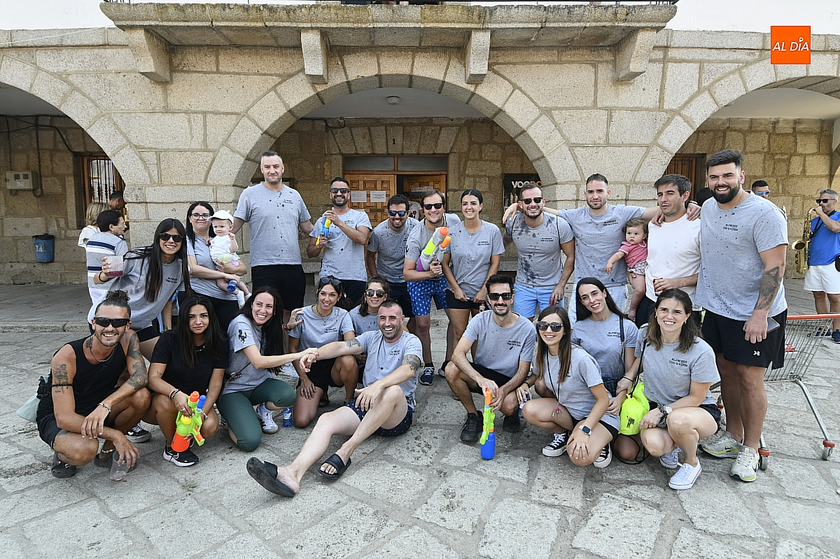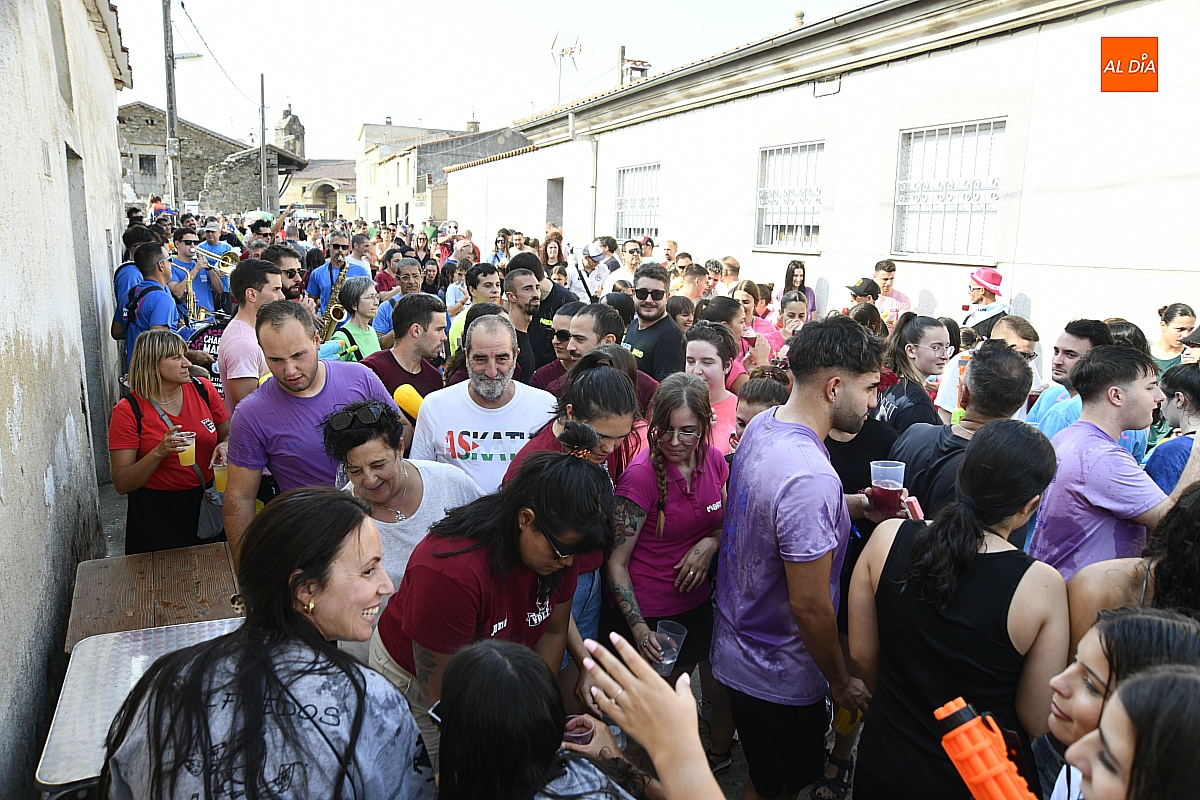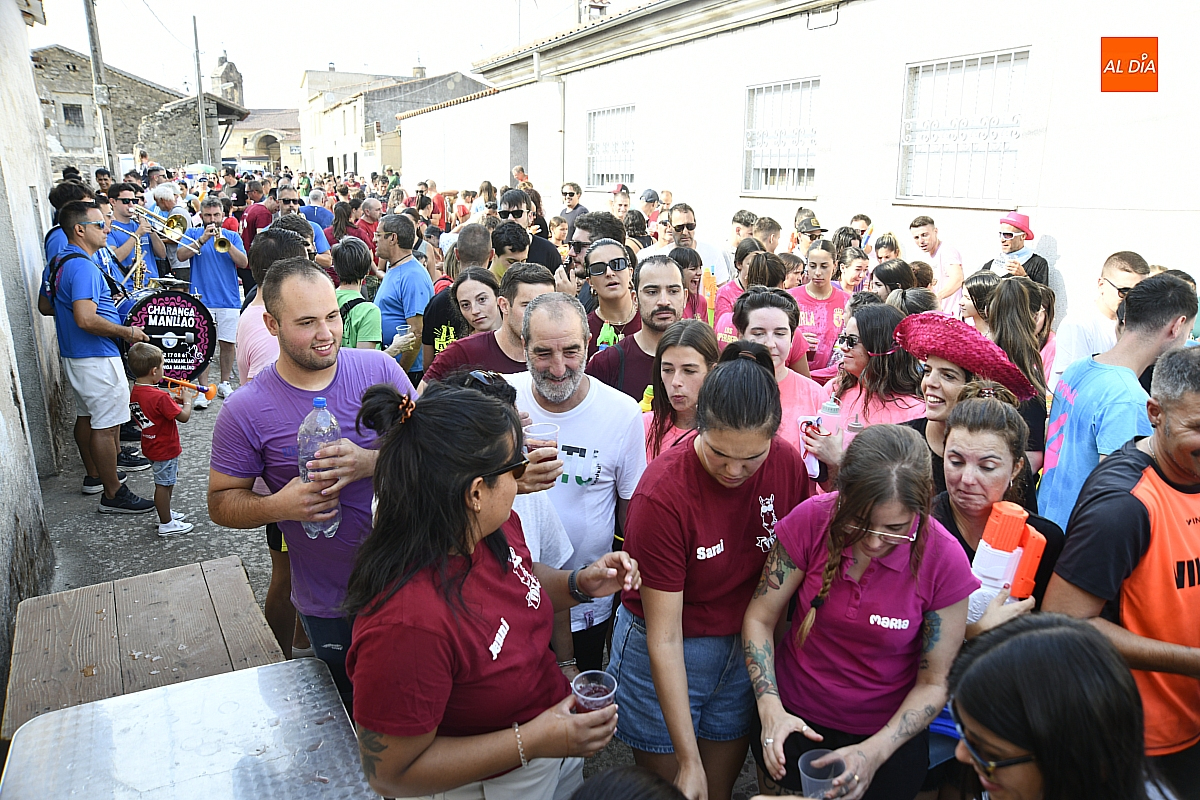 Mientras tanto, la Plaza Mayor se transformaba en un mosaico de colores. Cada peña lucía su camiseta distintiva, como si el pueblo entero se hubiera vestido de arcoíris para la ocasión. Separados por grupos, sí, pero unidos por una misma pasión: la convivencia festiva que late con fuerza en estos días. La charanga mirobrigense “Manliao“ puso la banda sonora a la tarde, acompañando con sus notas el bullicio de jóvenes y mayores. En medio de la música y las risas, estalló la inevitable “guerra de agua”: un estallido lúdico, refrescante y simbólico, que disolvió diferencias y reforzó la hermandad entre los llamados “potrosos”.