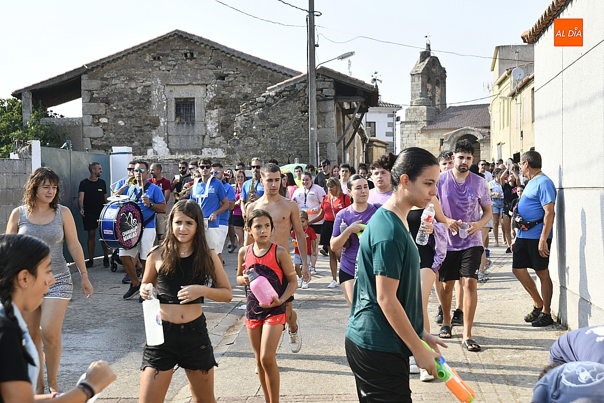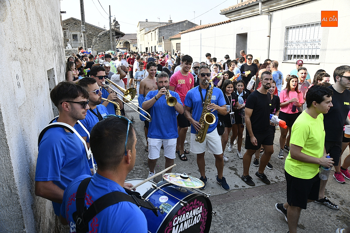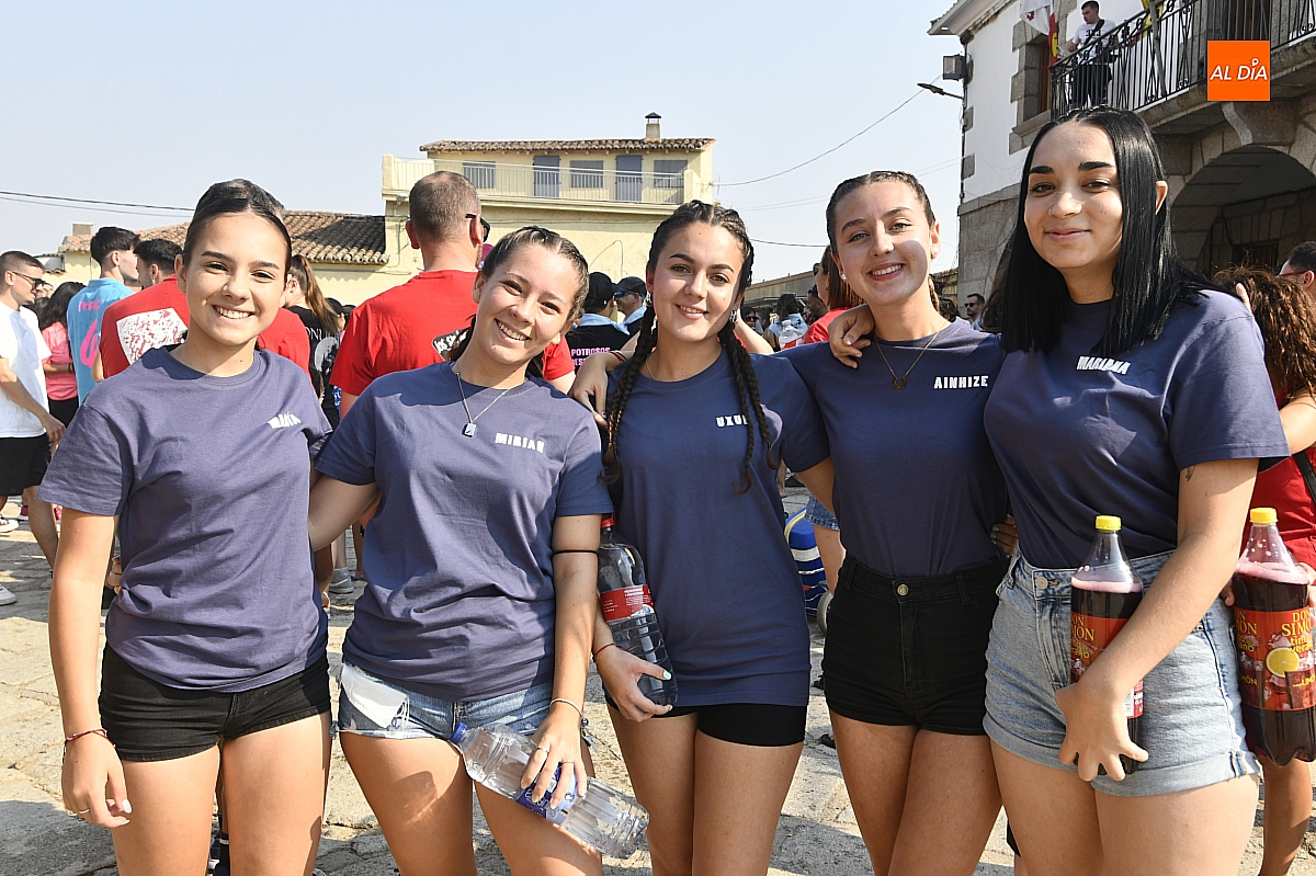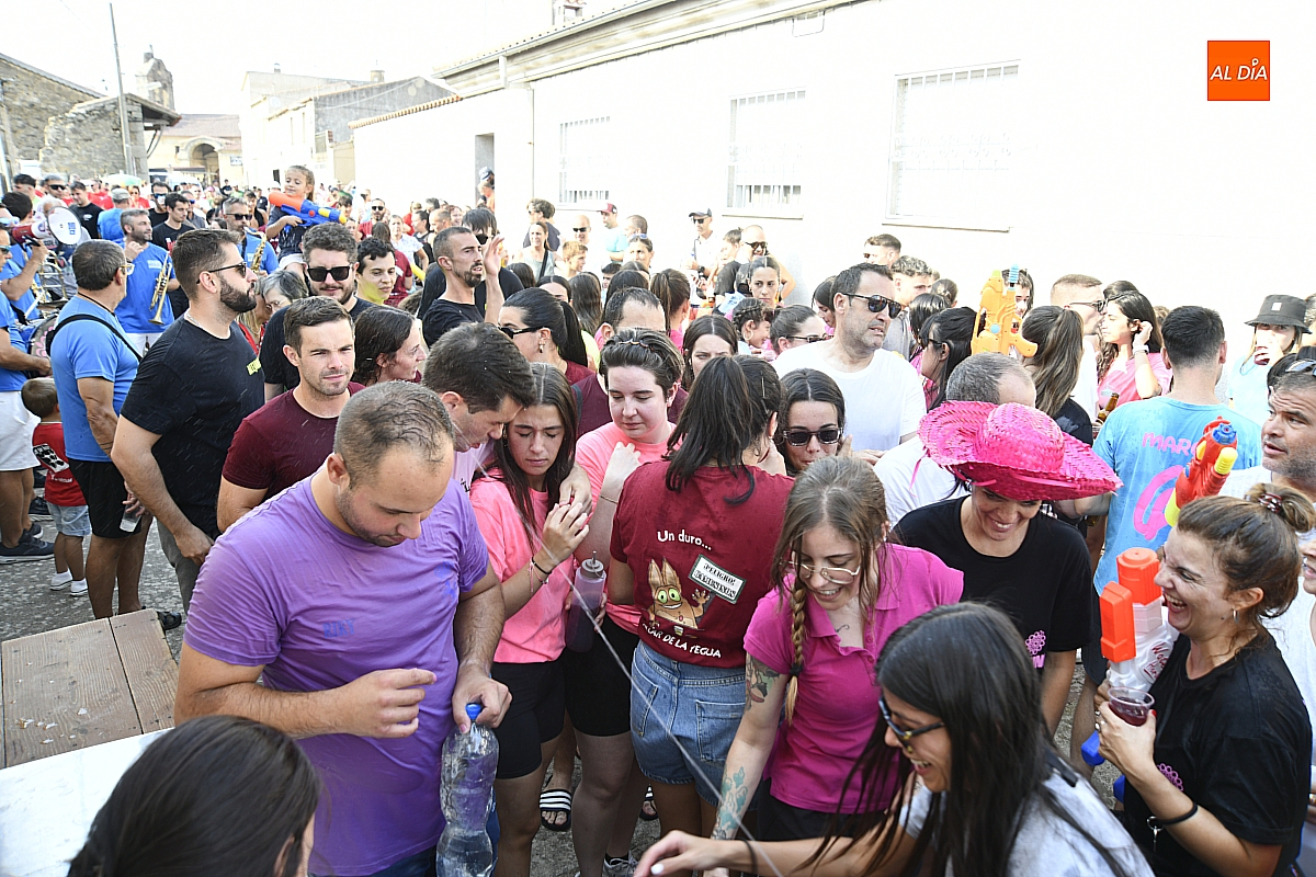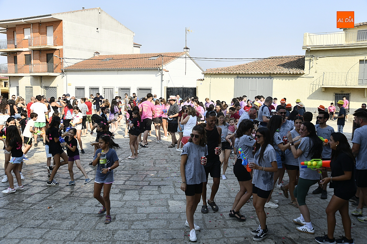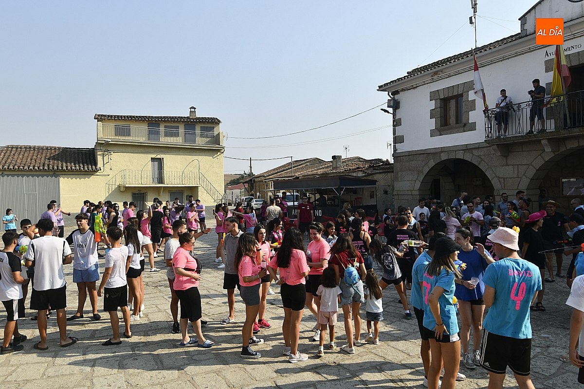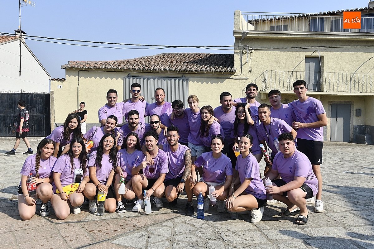 Mientras tanto, la Plaza Mayor se transformaba en un mosaico de colores. Cada peña lucía su camiseta distintiva, como si el pueblo entero se hubiera vestido de arcoíris para la ocasión. Separados por grupos, sí, pero unidos por una misma pasión: la convivencia festiva que late con fuerza en estos días. La charanga mirobrigense “Manliao“ puso la banda sonora a la tarde, acompañando con sus notas el bullicio de jóvenes y mayores. En medio de la música y las risas, estalló la inevitable “guerra de agua”: un estallido lúdico, refrescante y simbólico, que disolvió diferencias y reforzó la hermandad entre los llamados “potrosos”.