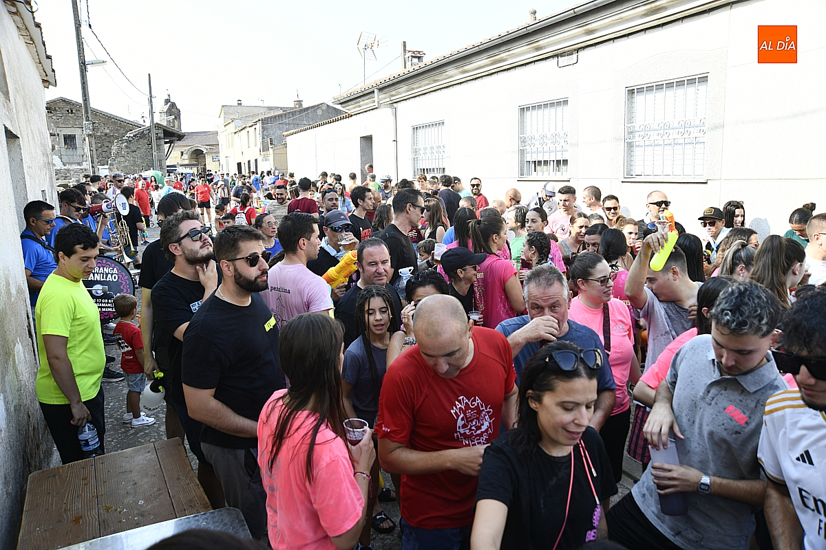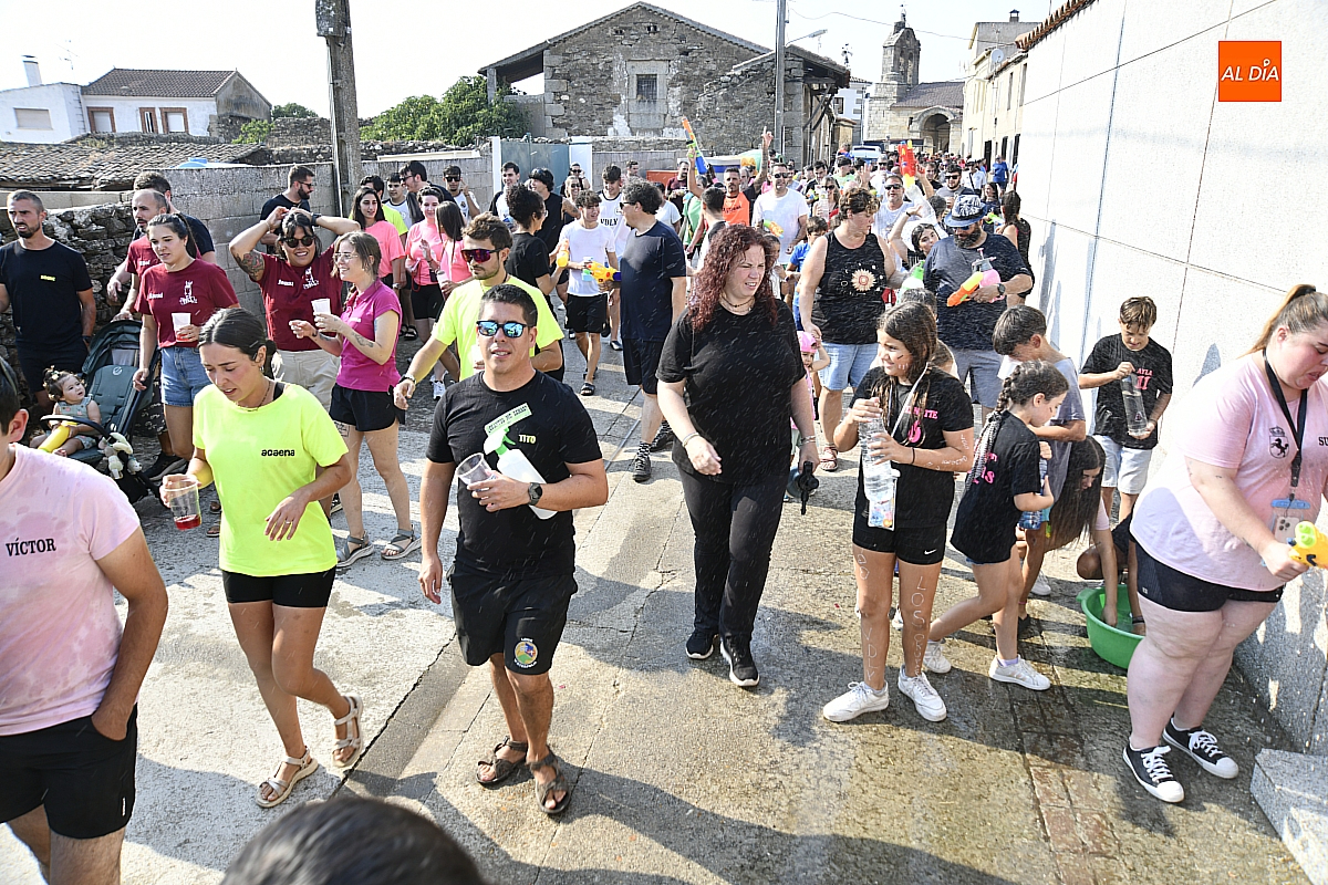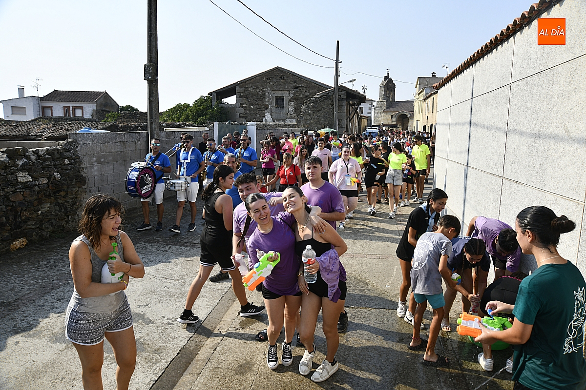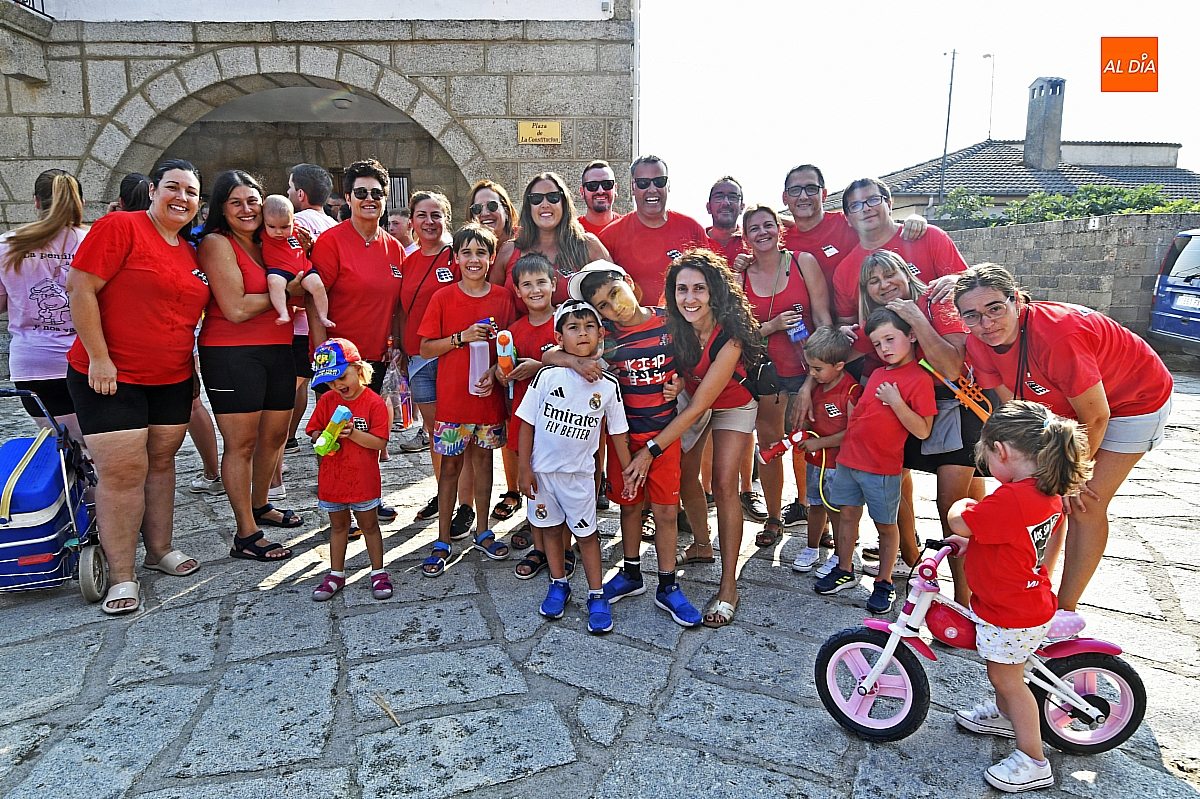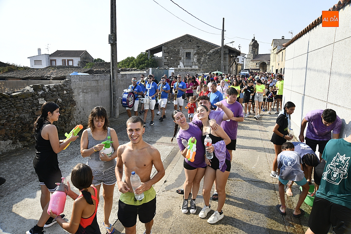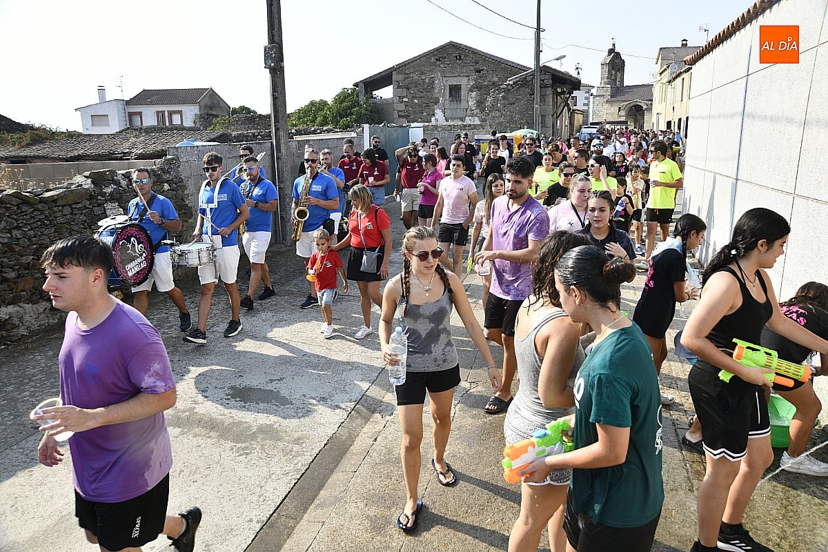 Mientras tanto, la Plaza Mayor se transformaba en un mosaico de colores. Cada peña lucía su camiseta distintiva, como si el pueblo entero se hubiera vestido de arcoíris para la ocasión. Separados por grupos, sí, pero unidos por una misma pasión: la convivencia festiva que late con fuerza en estos días. La charanga mirobrigense “Manliao“ puso la banda sonora a la tarde, acompañando con sus notas el bullicio de jóvenes y mayores. En medio de la música y las risas, estalló la inevitable “guerra de agua”: un estallido lúdico, refrescante y simbólico, que disolvió diferencias y reforzó la hermandad entre los llamados “potrosos”.