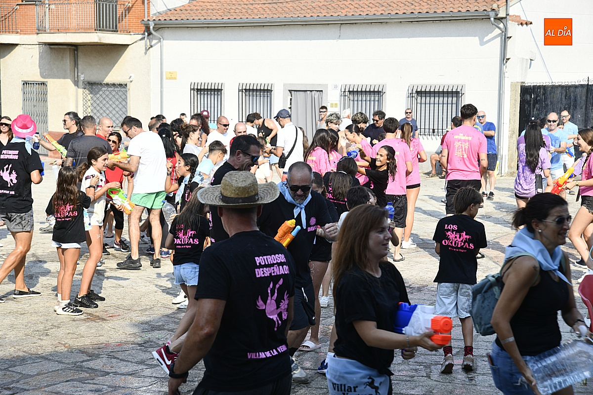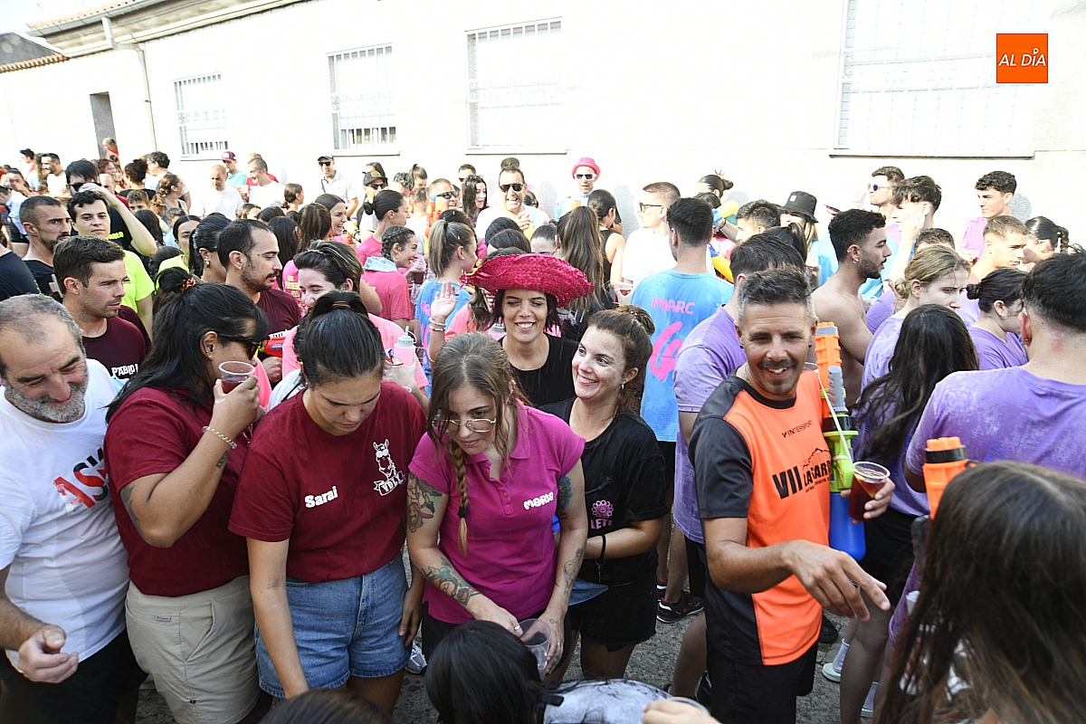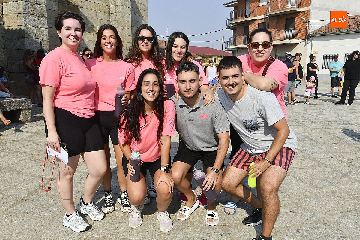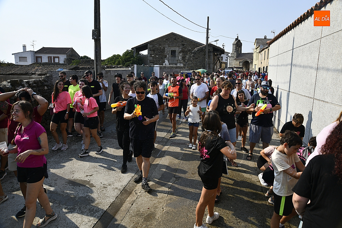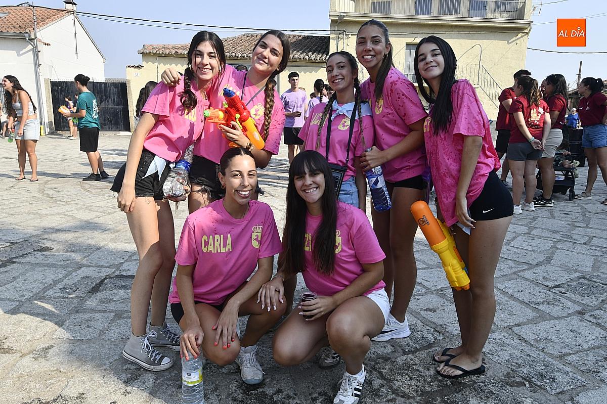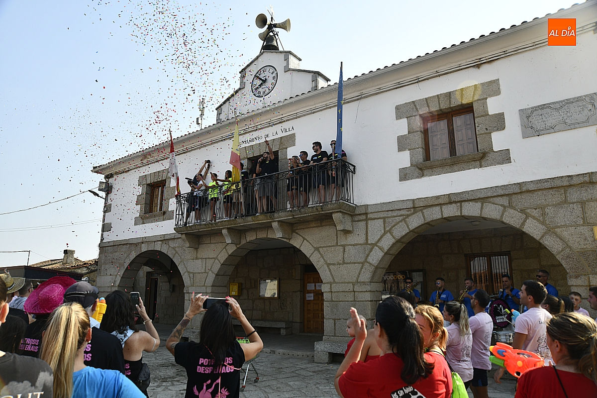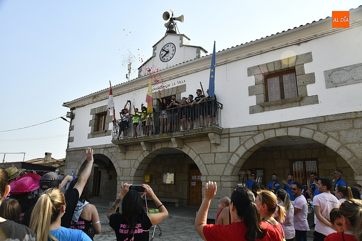 Mientras tanto, la Plaza Mayor se transformaba en un mosaico de colores. Cada peña lucía su camiseta distintiva, como si el pueblo entero se hubiera vestido de arcoíris para la ocasión. Separados por grupos, sí, pero unidos por una misma pasión: la convivencia festiva que late con fuerza en estos días. La charanga mirobrigense “Manliao“ puso la banda sonora a la tarde, acompañando con sus notas el bullicio de jóvenes y mayores. En medio de la música y las risas, estalló la inevitable “guerra de agua”: un estallido lúdico, refrescante y simbólico, que disolvió diferencias y reforzó la hermandad entre los llamados “potrosos”.
