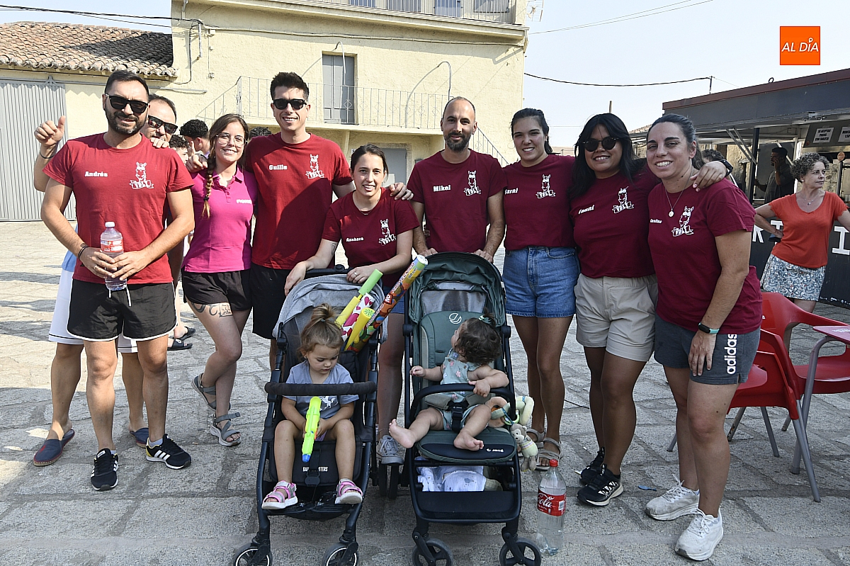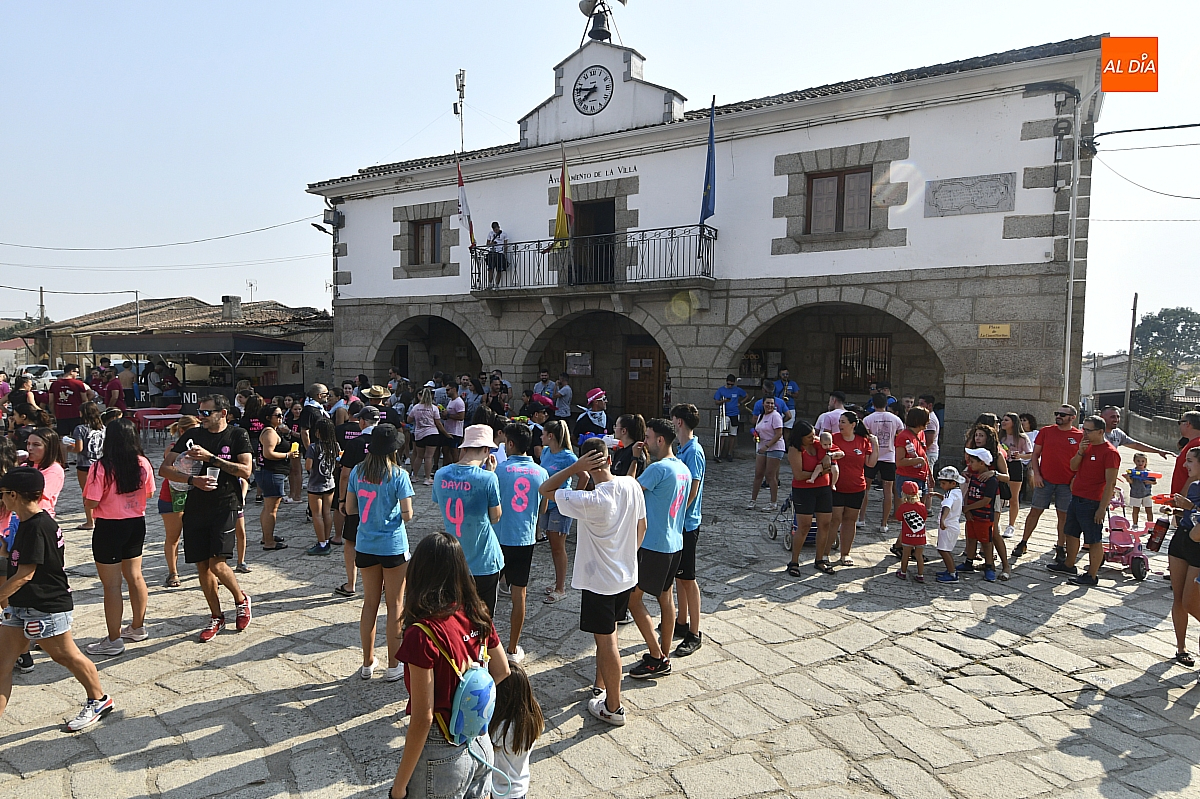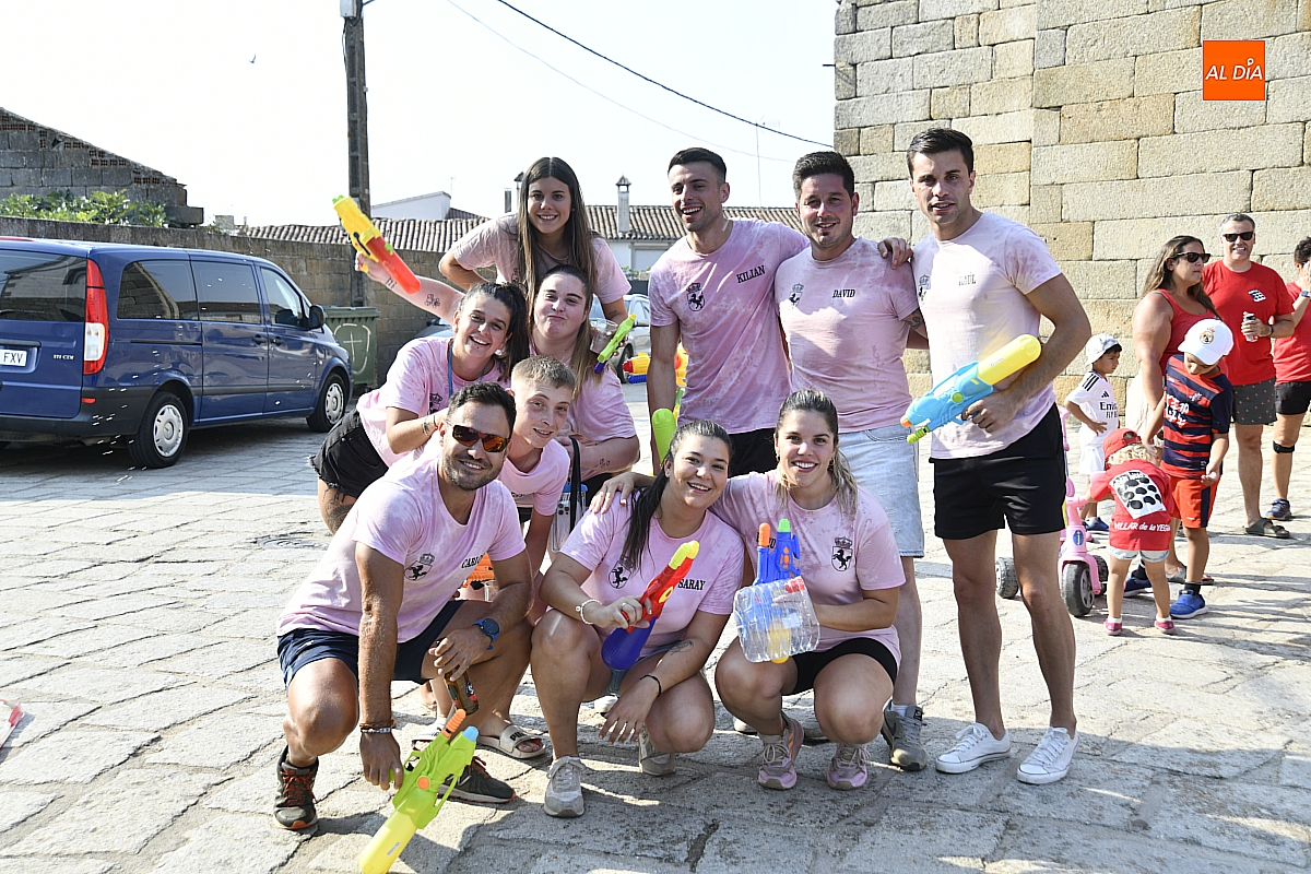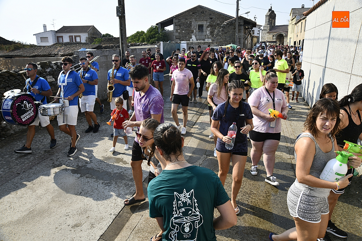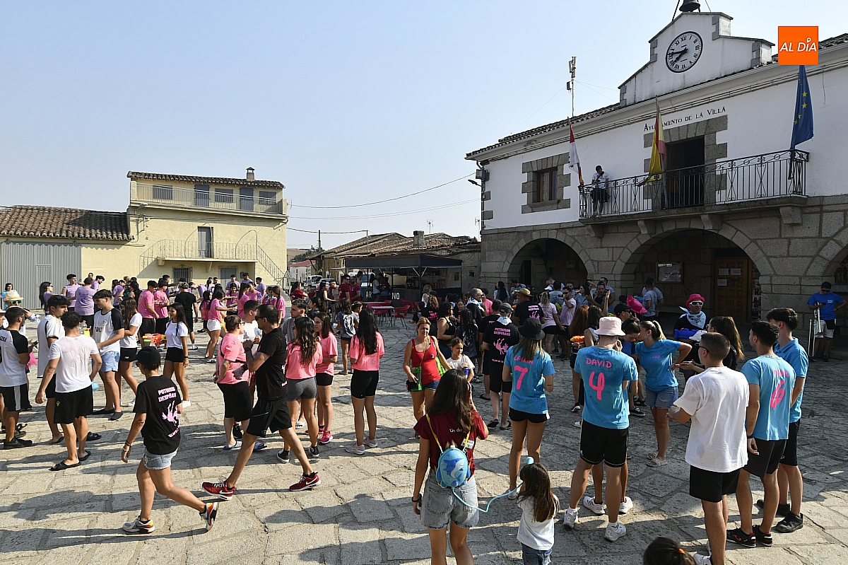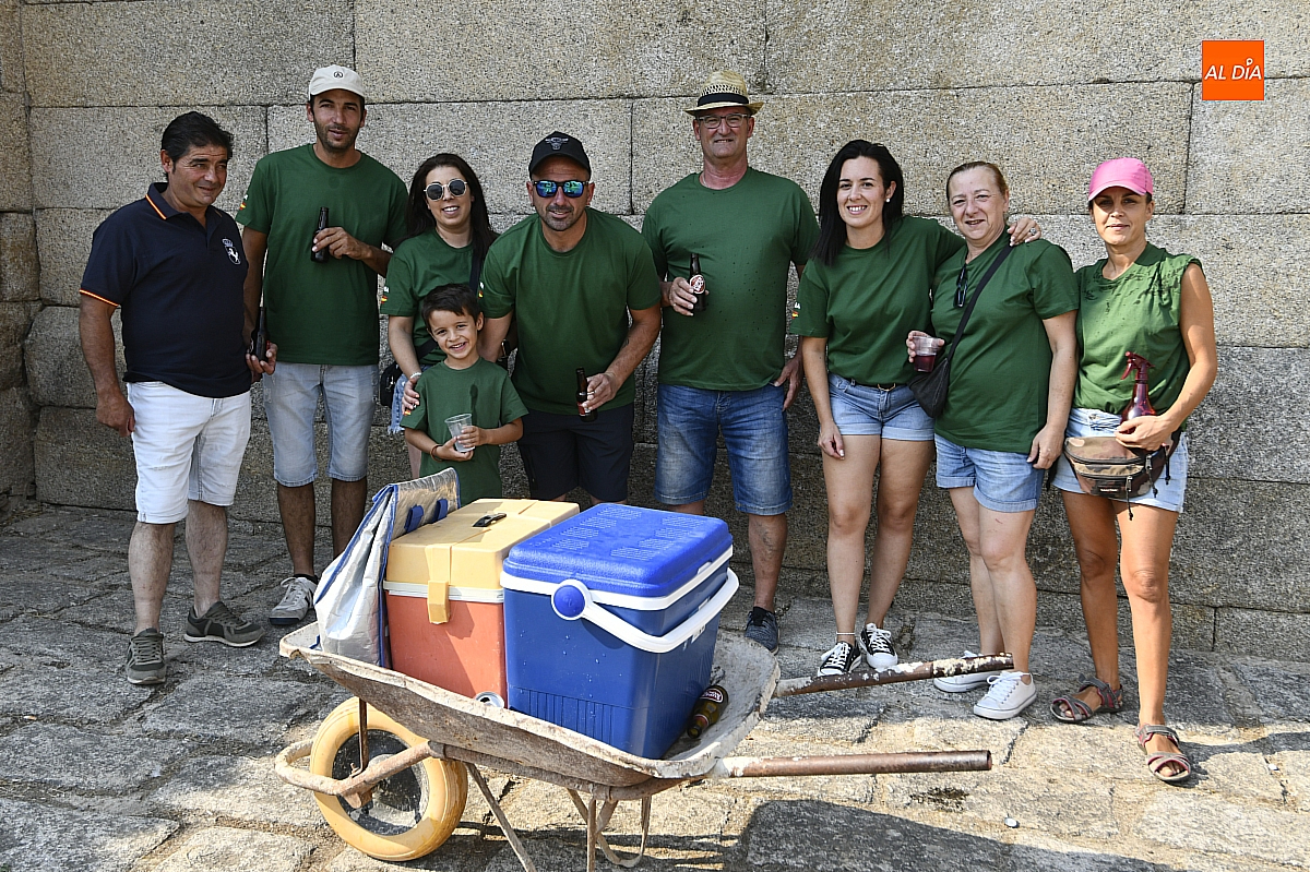 Mientras tanto, la Plaza Mayor se transformaba en un mosaico de colores. Cada peña lucía su camiseta distintiva, como si el pueblo entero se hubiera vestido de arcoíris para la ocasión. Separados por grupos, sí, pero unidos por una misma pasión: la convivencia festiva que late con fuerza en estos días. La charanga mirobrigense “Manliao“ puso la banda sonora a la tarde, acompañando con sus notas el bullicio de jóvenes y mayores. En medio de la música y las risas, estalló la inevitable “guerra de agua”: un estallido lúdico, refrescante y simbólico, que disolvió diferencias y reforzó la hermandad entre los llamados “potrosos”.