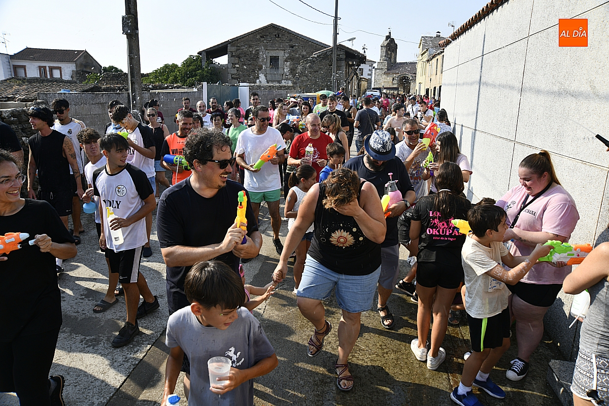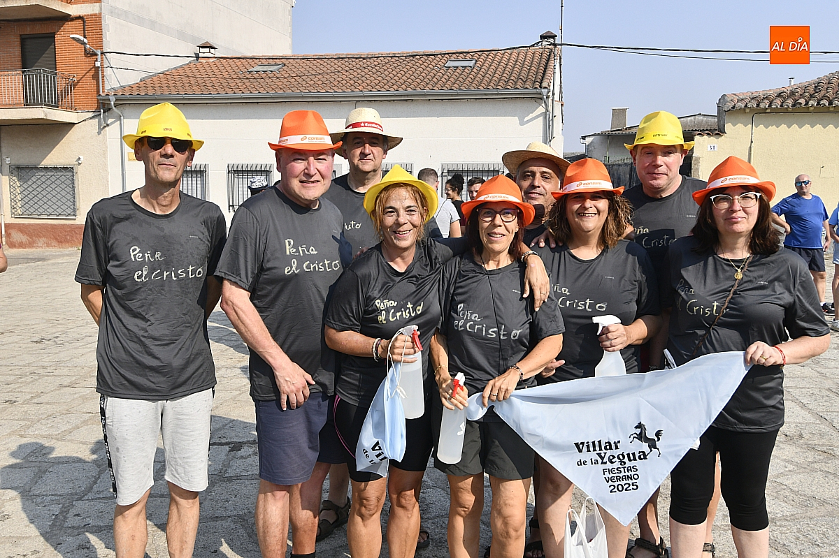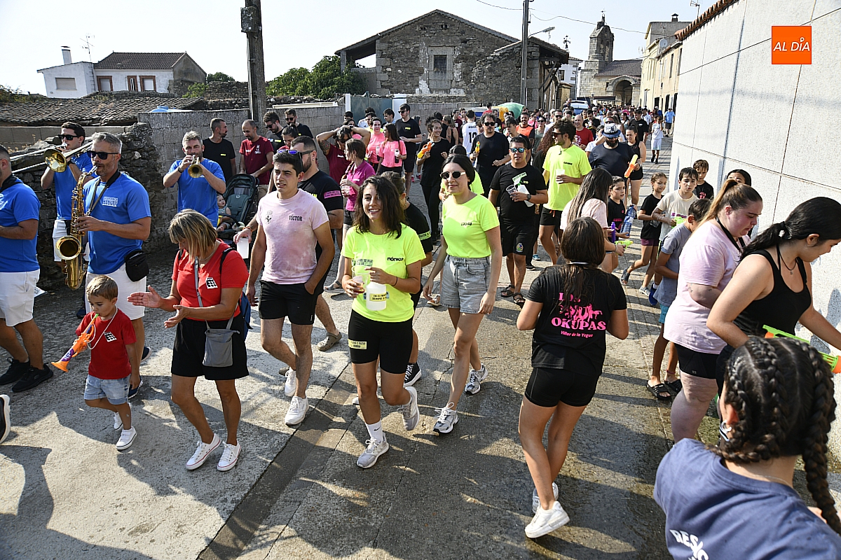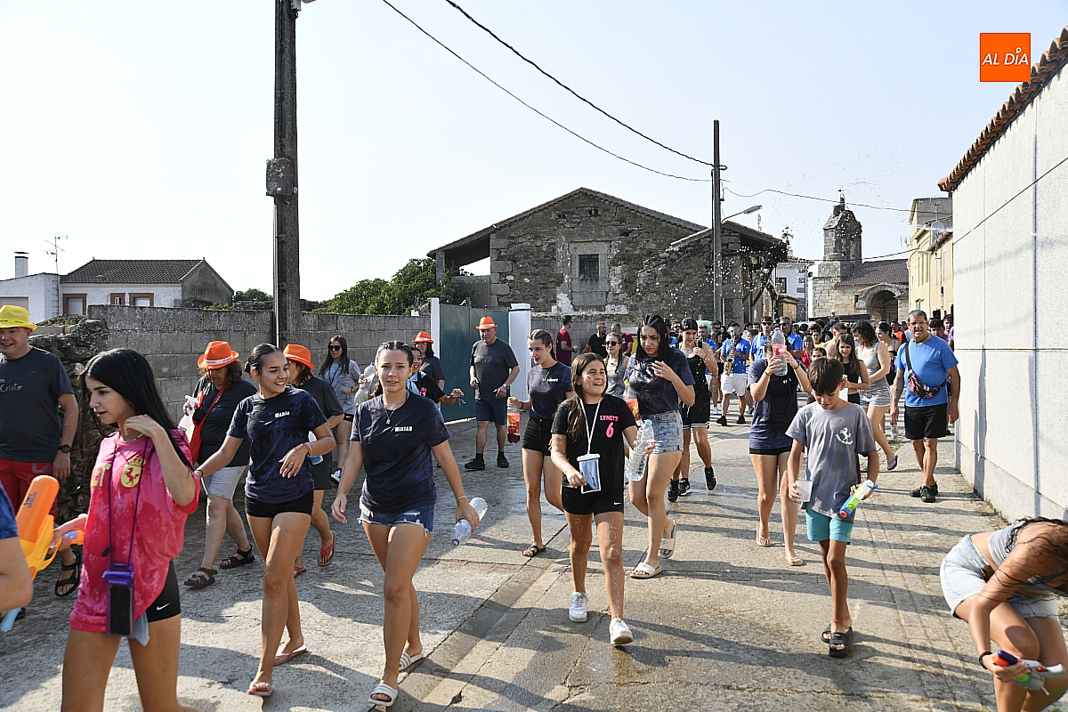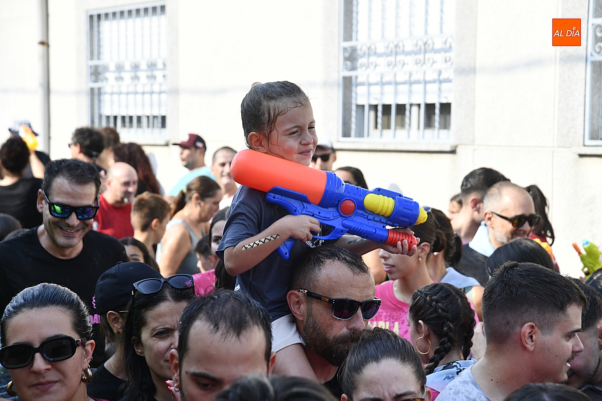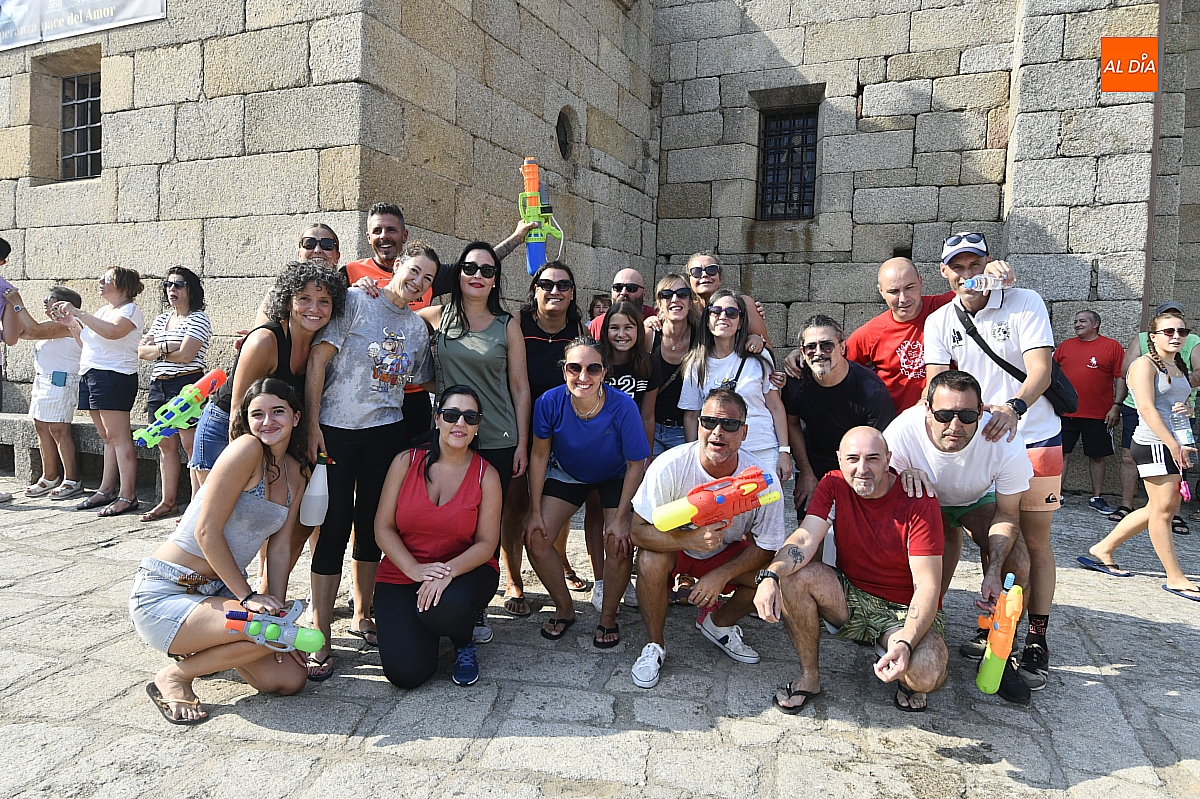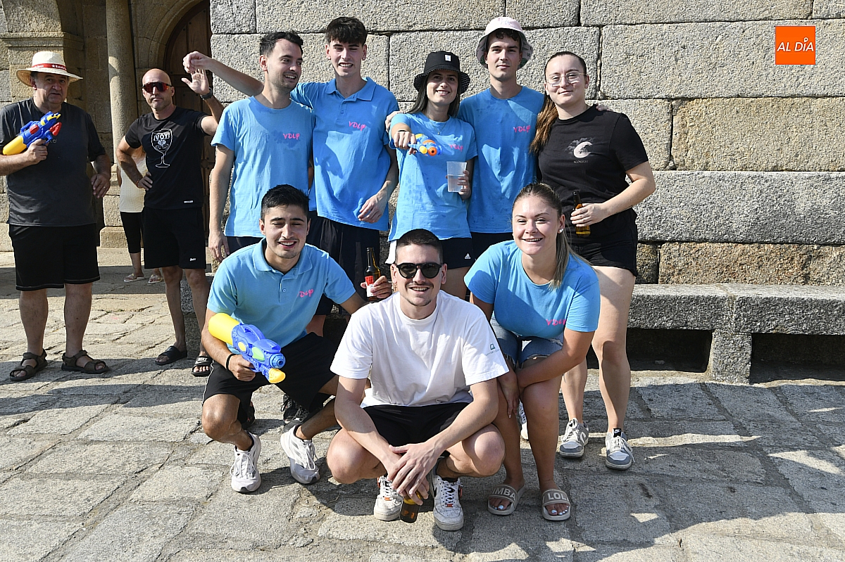 Mientras tanto, la Plaza Mayor se transformaba en un mosaico de colores. Cada peña lucía su camiseta distintiva, como si el pueblo entero se hubiera vestido de arcoíris para la ocasión. Separados por grupos, sí, pero unidos por una misma pasión: la convivencia festiva que late con fuerza en estos días. La charanga mirobrigense “Manliao“ puso la banda sonora a la tarde, acompañando con sus notas el bullicio de jóvenes y mayores. En medio de la música y las risas, estalló la inevitable “guerra de agua”: un estallido lúdico, refrescante y simbólico, que disolvió diferencias y reforzó la hermandad entre los llamados “potrosos”.