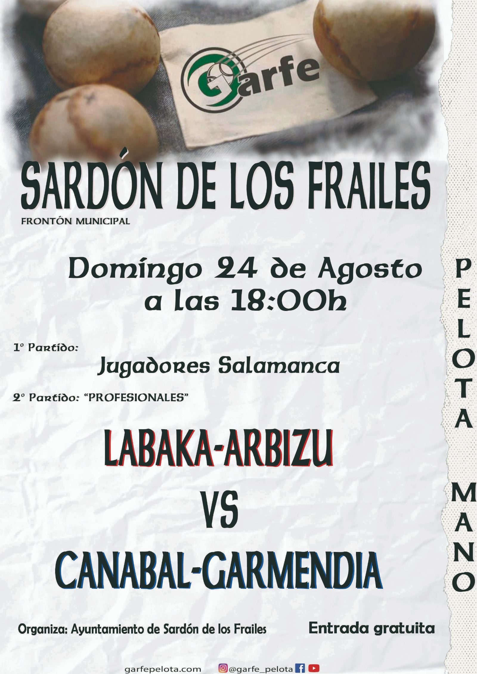 Las celebraciones en Sardón de los Frailes no terminan aquí, ya que se prolongarán hasta el lunes, con una jornada de domingo dedicada a la tradición con la Santa Misa y dos emocionantes partidos de pelota a mano que harán las delicias de los aficionados a este deporte. El primero de los partidos será de Aficionados de 1ª División y en el segundo se enfrentarán las parejas de profesioanles formadas por Labaka – Arbizu y Canabal - Garmendia.