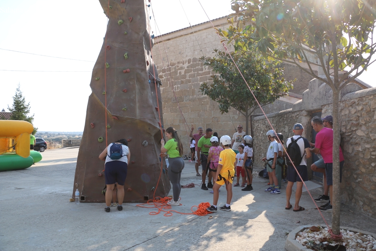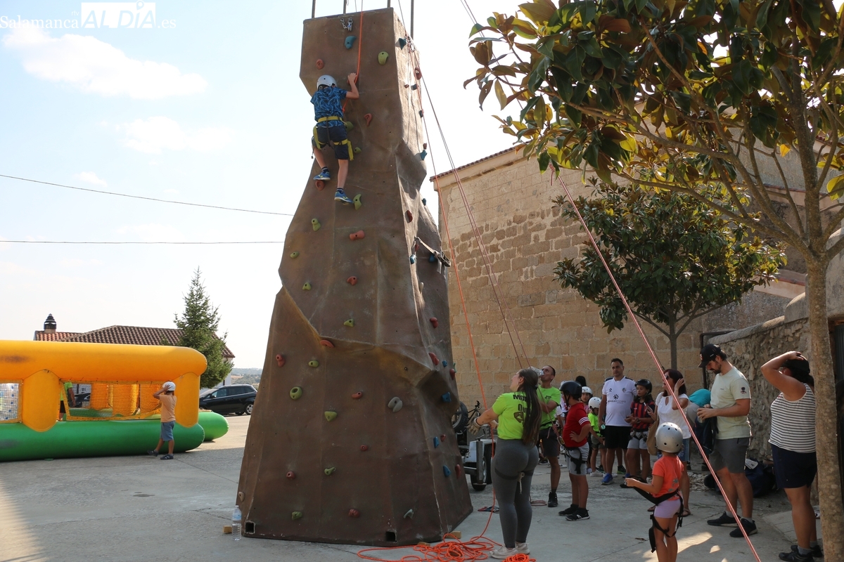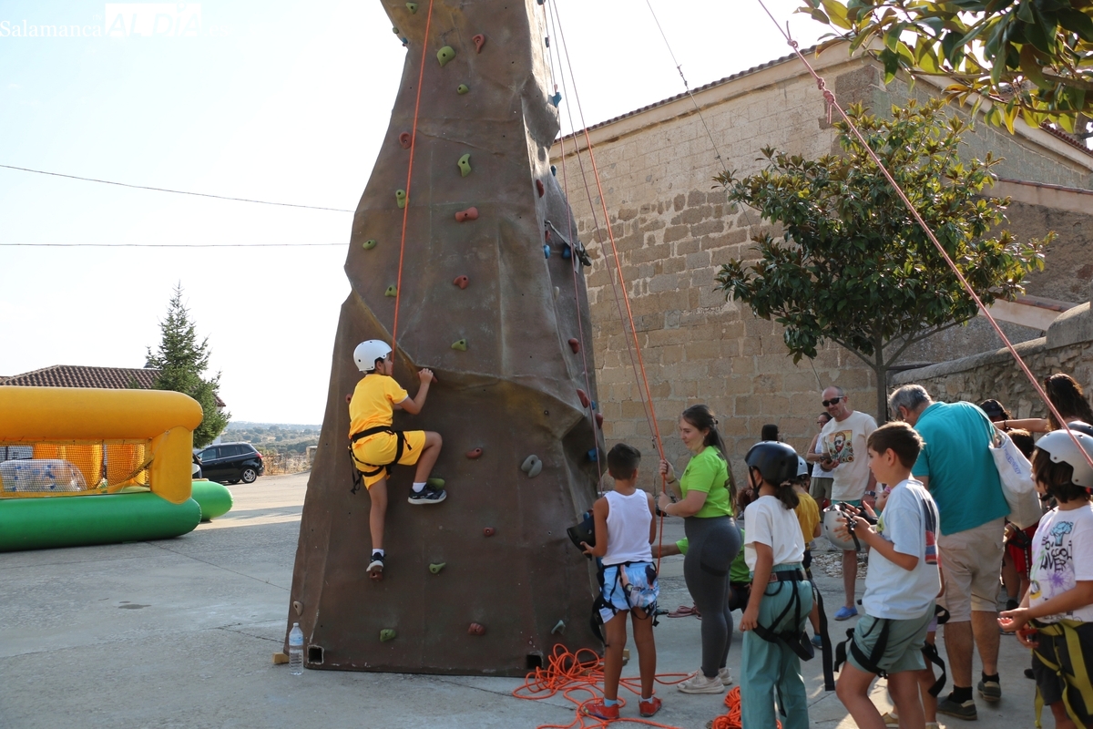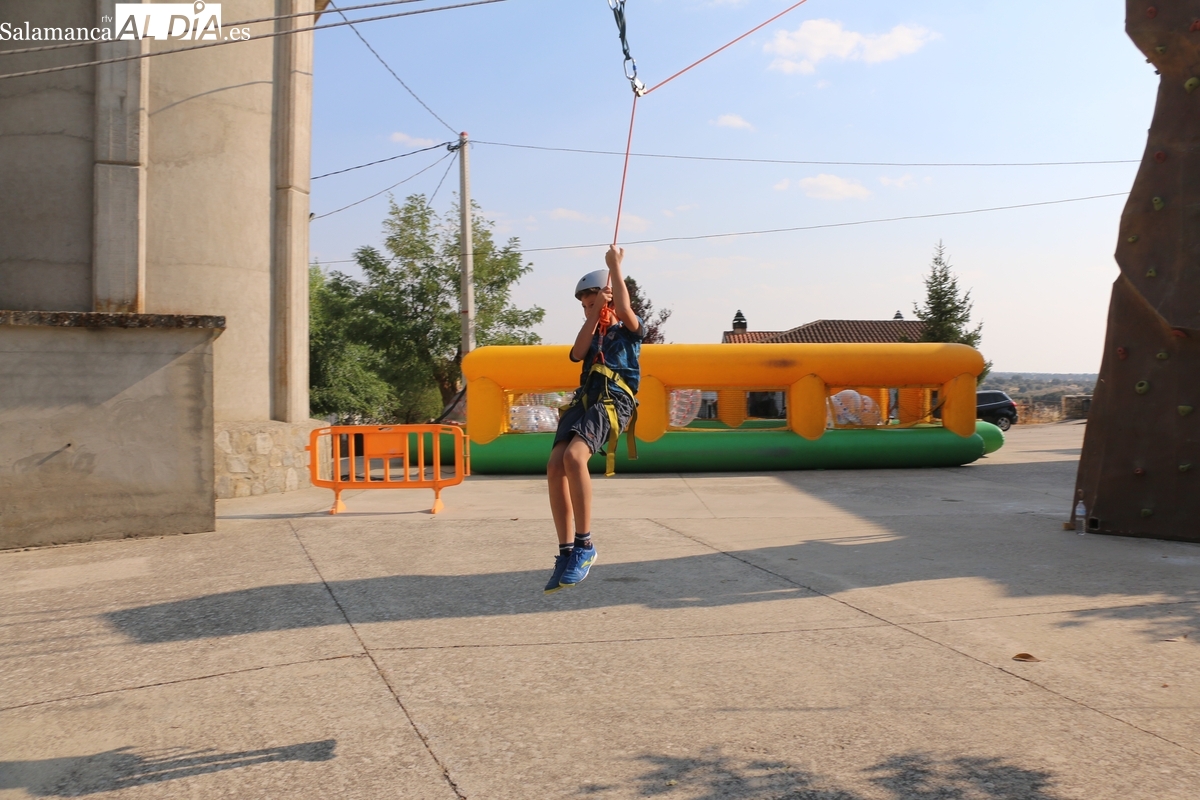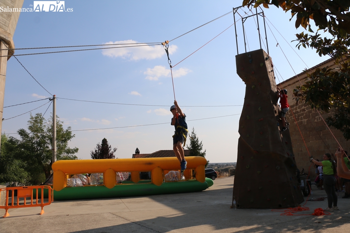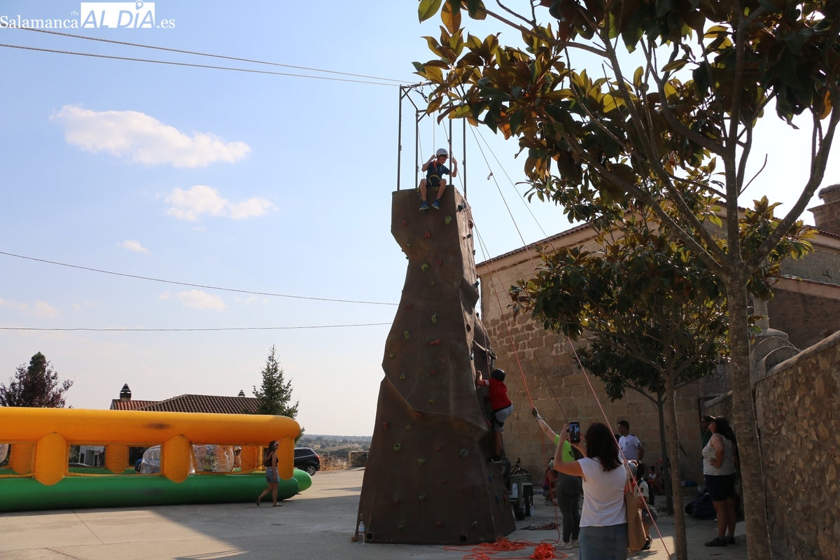 La jornada de este sábado, 23 de agosto, ha tenido como uno de sus platos fuertes el espectacular Parque multiaventura instalado junto a la iglesia. Desde primera hora de la tarde, la adrenalina y la diversión han sido las protagonistas en una cita en la que no faltaron el rocódromo, la tirolina, el tiro con arco y diversos juegos de variantes. Incluso los más metidos en años se atrevieron con el divertido fútbol de burbujas, generando momentos de gran diversión y camaradería entre los participantes.