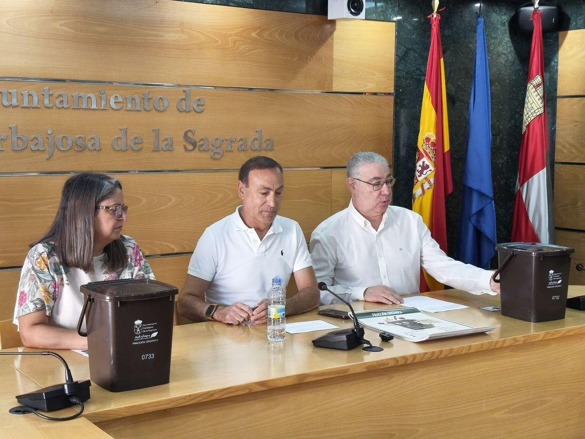 El alcalde de Carbajosa de la Sagrada, Pedro Samuel Martín, el concejal de Limpieza, Angel Jerónimo Manso, y la responsable de la empresa Resuival, Elena María Borrego Pérez, han presentado este lunes ante los medios su campaña conjunta 'Carbajosa selecciona, la orgánica se aprovecha' para iniciar la recogida de la fracción orgánica en Carbajosa a principios de septiembre.