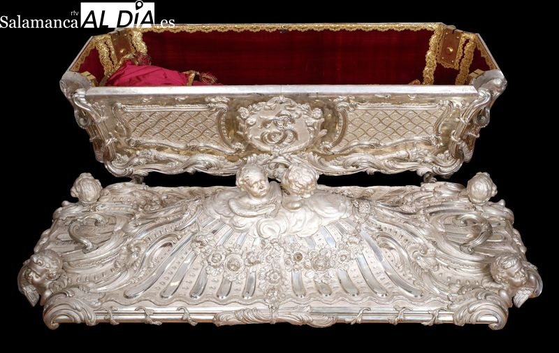 La obra reproduce con rigor la urna que albergó el cuerpo incorrupto de Santa Teresa desde 1616, poco después de su beatificación, hasta 1760, cuando se trasladó al sepulcro actual de plata. Para su elaboración, Romera se ha basado en la detallada descripción recogida en un acta notarial de 1750 encontrada junto al cuerpo de la Santa en agosto de 2024. El documento, firmado por fray Francisco de San Antonio, describe con precisión los materiales, adornos y textos bíblicos que decoraban la urna, así como las quintillas poéticas dedicadas a la fundadora del Carmelo Descalzo.