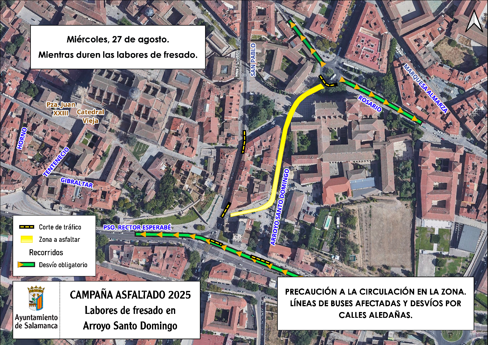 Por su parte, el corte total de Arroyo de Santo Domingo motiva un cambio en el recorrido de las líneas de autobús 1, 3, 4, 8 y 9 a través del paseo de Canalejas, Cuesta de Sancti Spíritus y Gran Vía para retomar sus recorridos habituales.