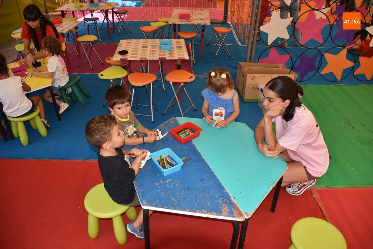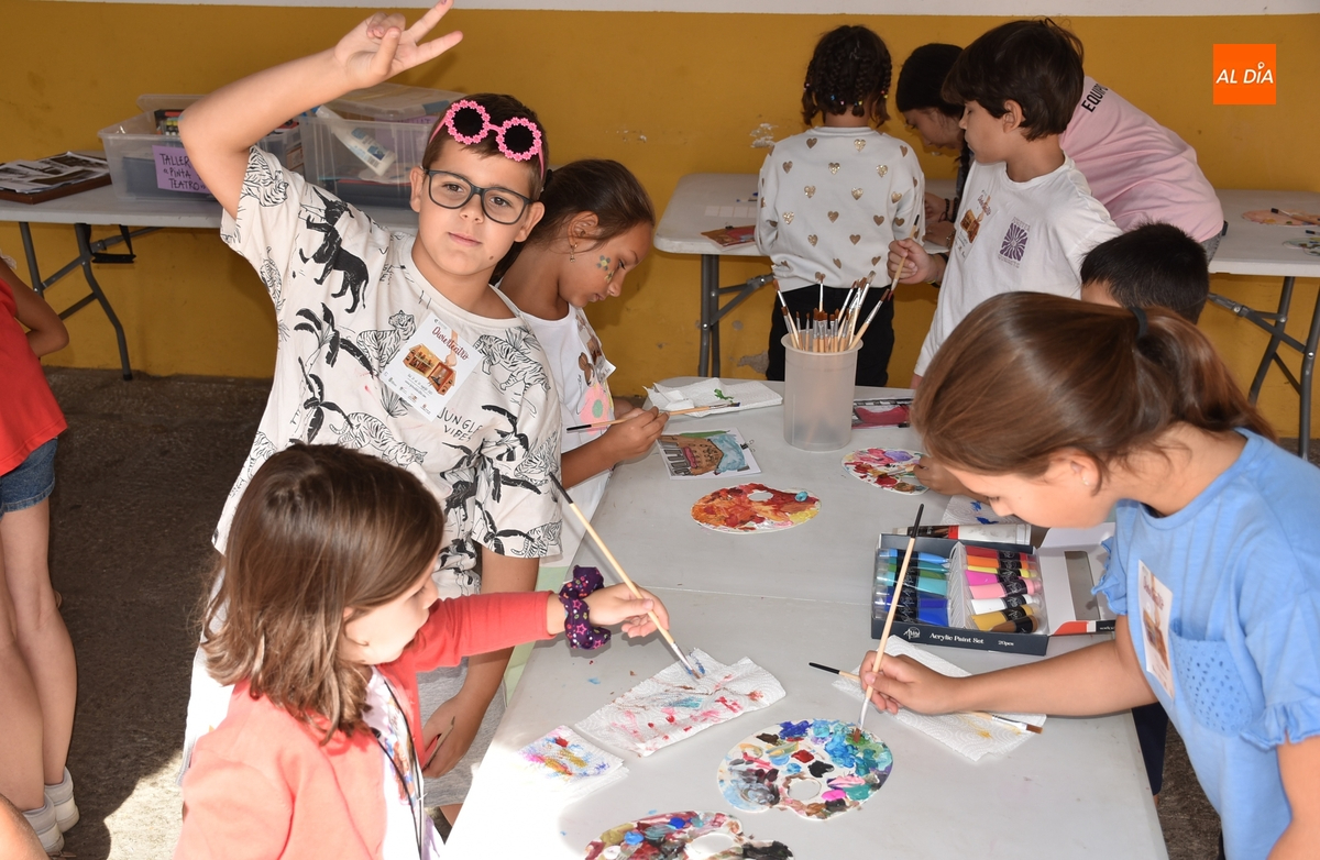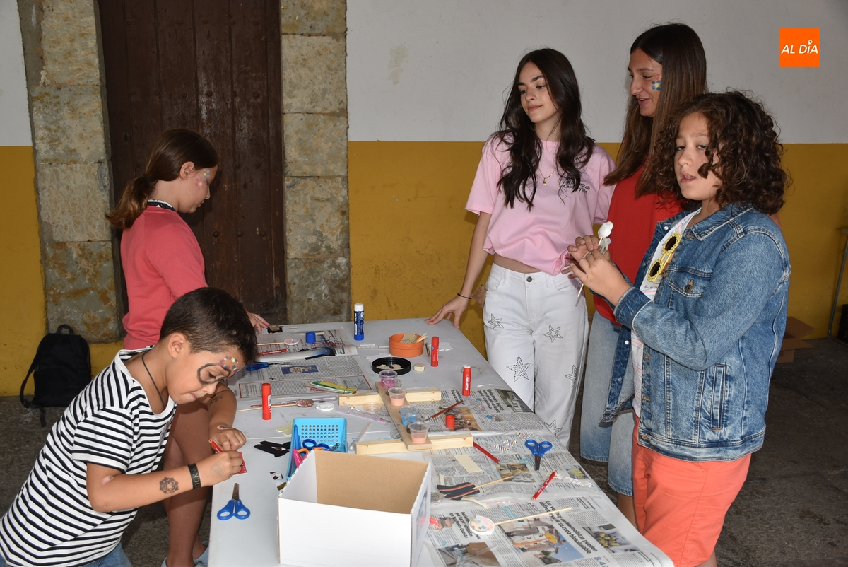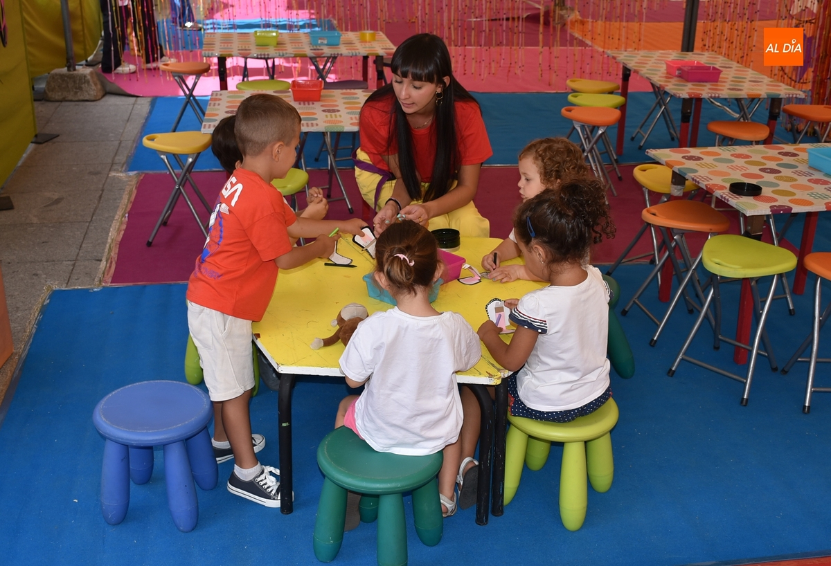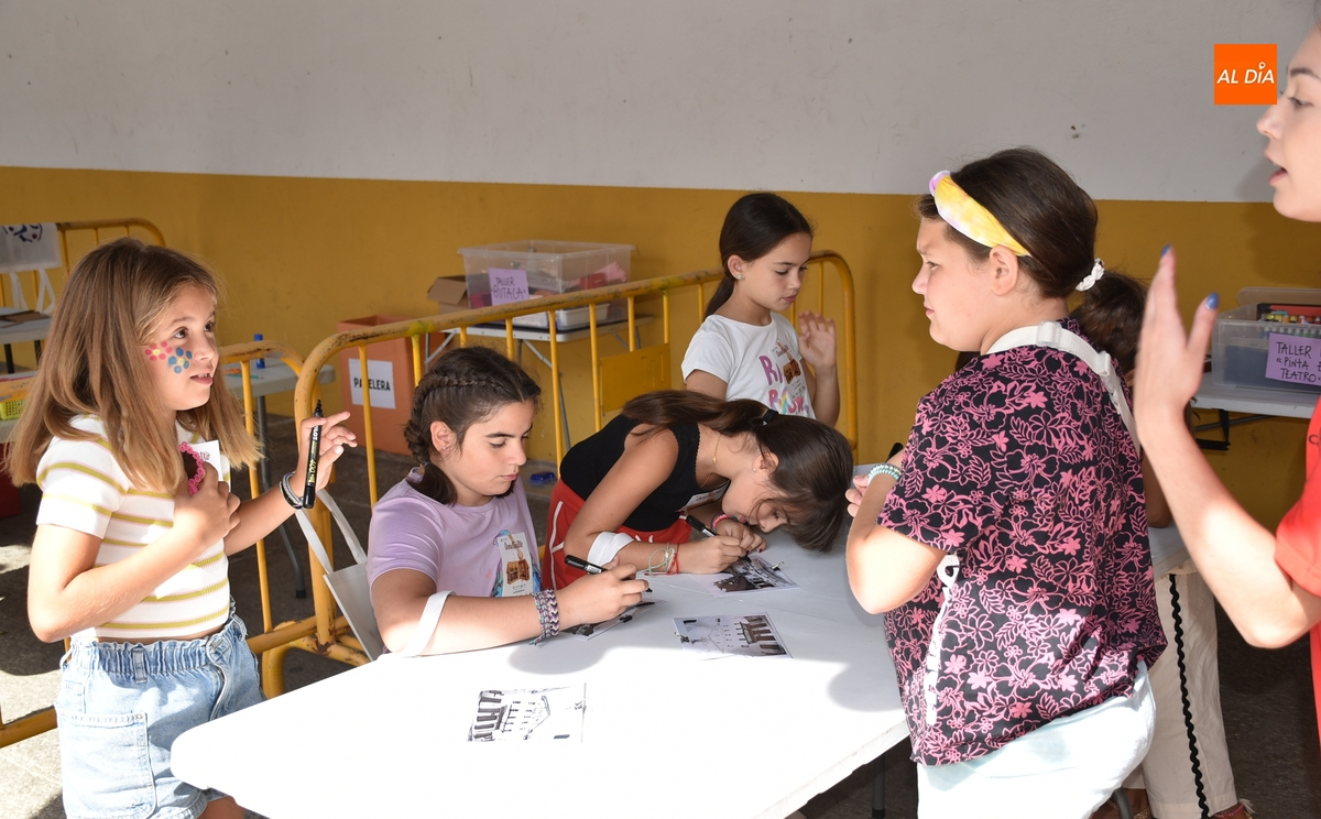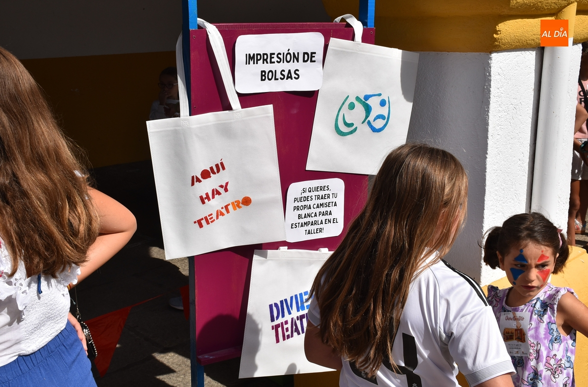 Después de que el año pasado hubiese una distribución especial por continentes, este año el Divierteatro retorna a su configuración más habitual, estando así destinado el ala izquierda bajo los soportales a los distintos talleres, donde en la mañana del miércoles se estuvieron creando colgantes y títeres, y versiones de la fachada del Teatro Nuevo, además de pintarse totebags con distintos mensajes en torno al teatro. Por supuesto, en este área no falta el mítico taller de maquillaje.