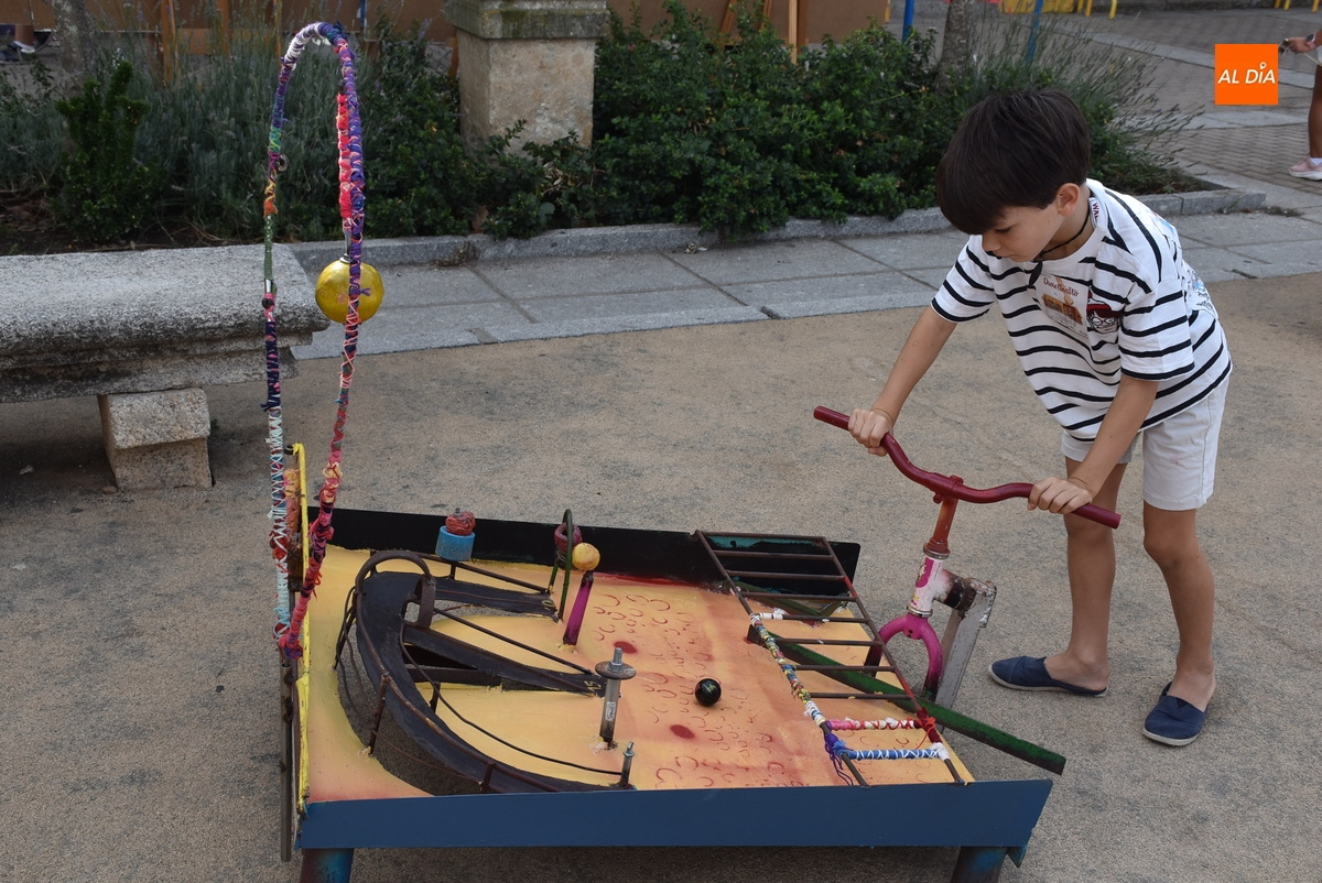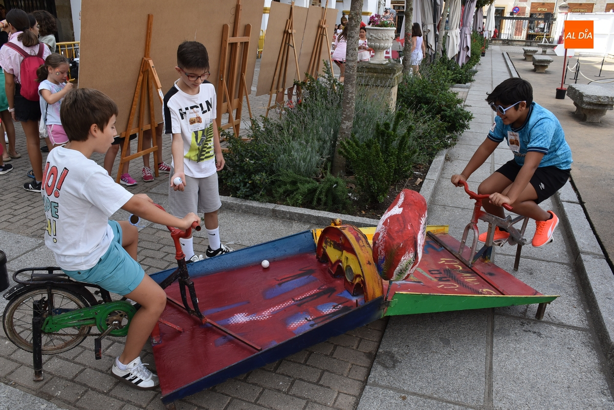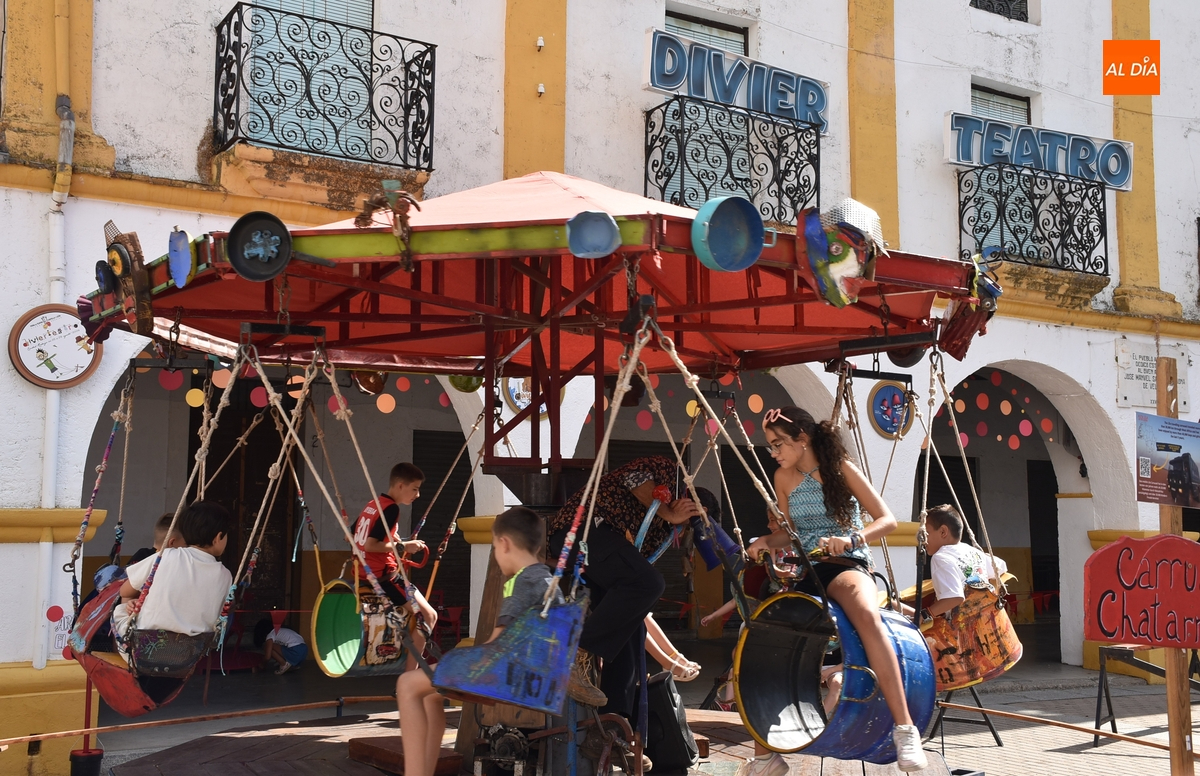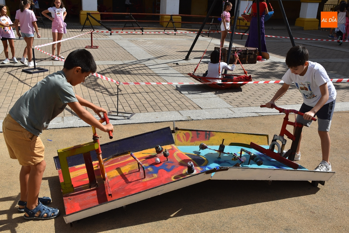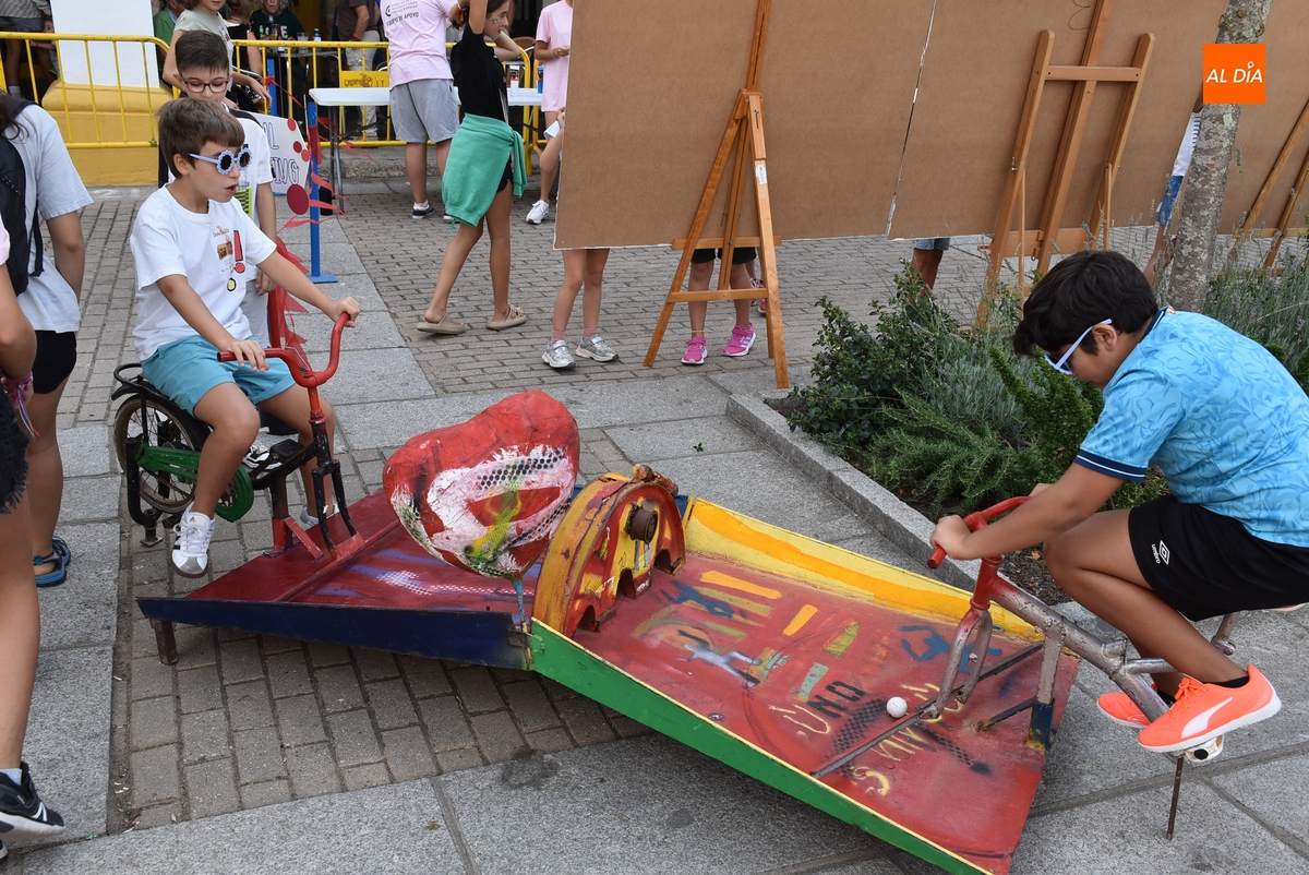 El Divierteatro de este año tiene dos grandes instalaciones en la Plazuela del Buen Alcalde. Por un lado, la compañía de las Islas Baleares Lîla Juegos reciclados y Circo ha repartido una amplia variedad de juegos hechos con material reciclado (bidones, ollas, paellas y todo tipo de hierros), en la mayoría de los cuales se puede jugar libremente, pero también hay dos ‘atracciones’ -hechas asimismo con material reciclado- que causaron sensación en la mañana del miércoles, teniendo cola para montar casi de forma constante.