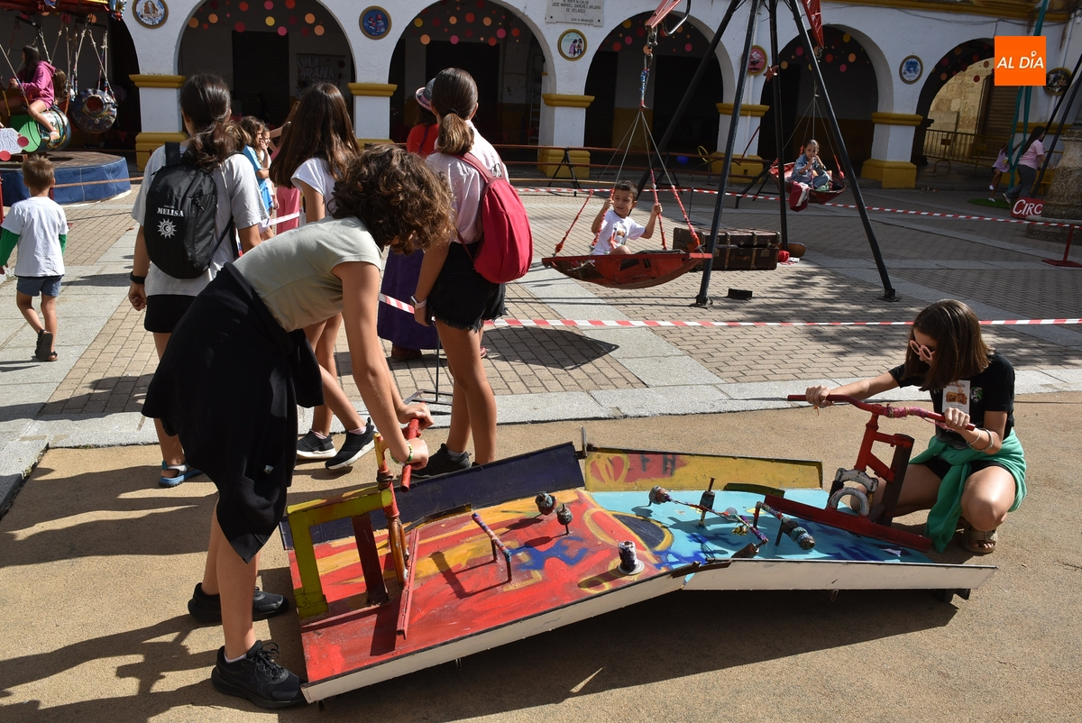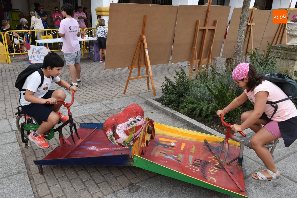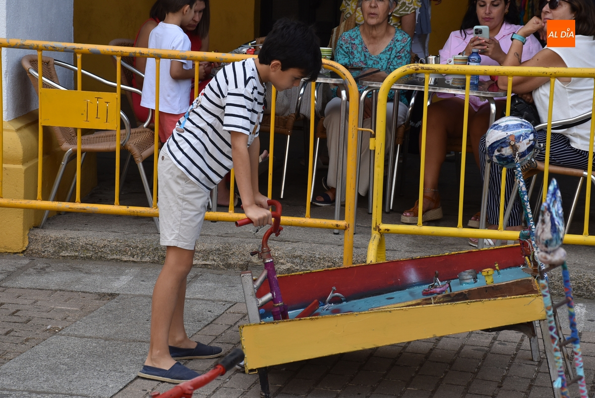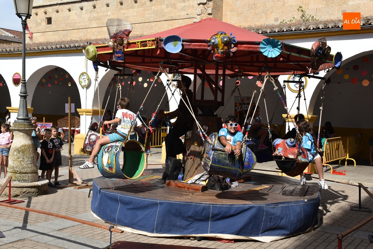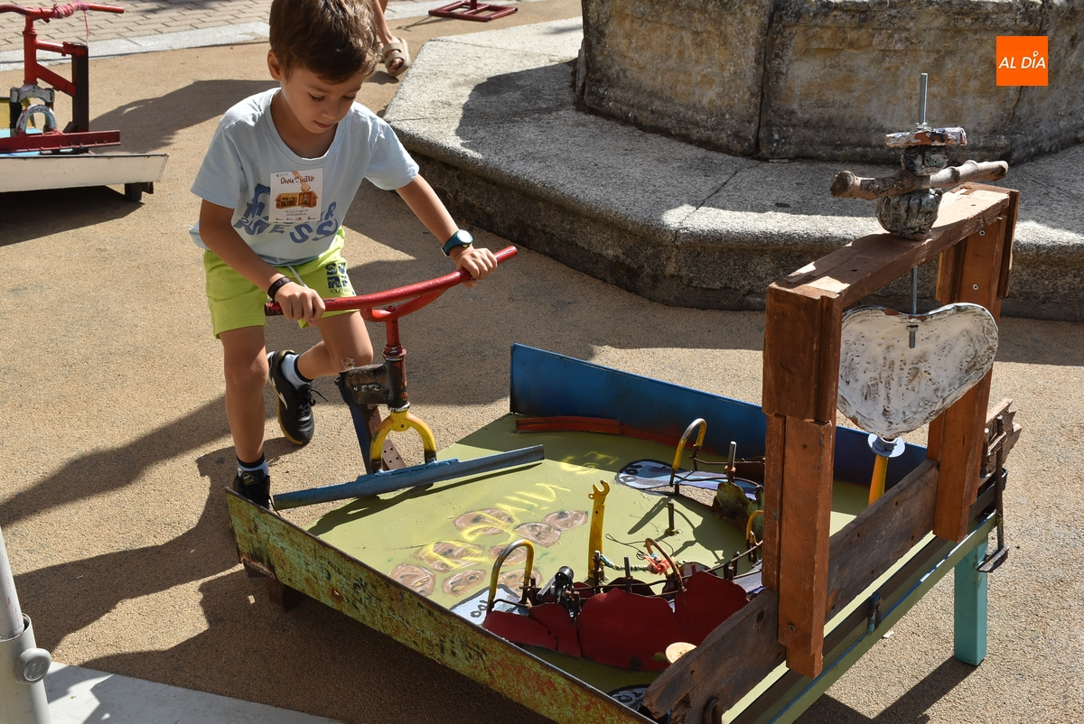 El Divierteatro de este año tiene dos grandes instalaciones en la Plazuela del Buen Alcalde. Por un lado, la compañía de las Islas Baleares Lîla Juegos reciclados y Circo ha repartido una amplia variedad de juegos hechos con material reciclado (bidones, ollas, paellas y todo tipo de hierros), en la mayoría de los cuales se puede jugar libremente, pero también hay dos ‘atracciones’ -hechas asimismo con material reciclado- que causaron sensación en la mañana del miércoles, teniendo cola para montar casi de forma constante.