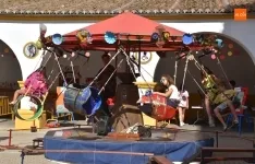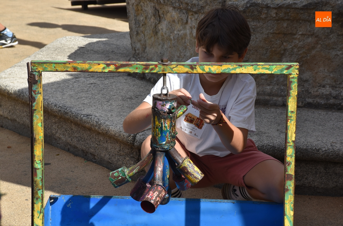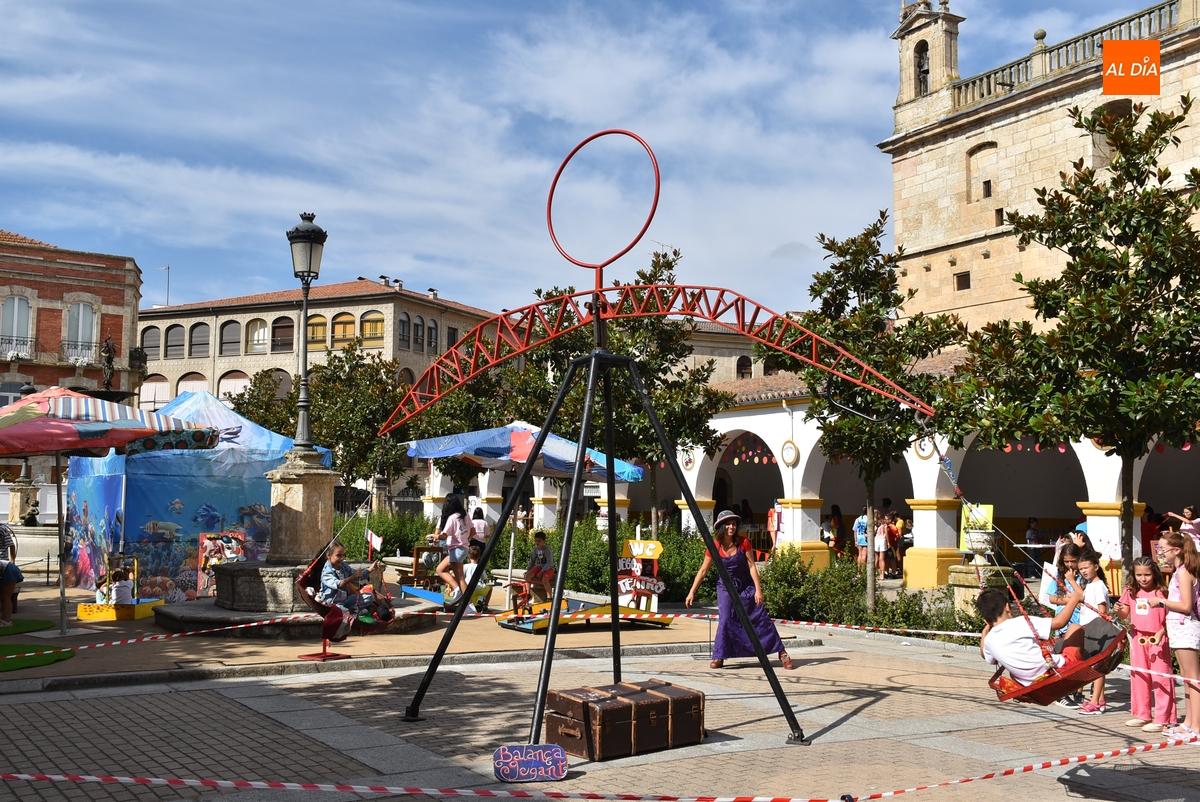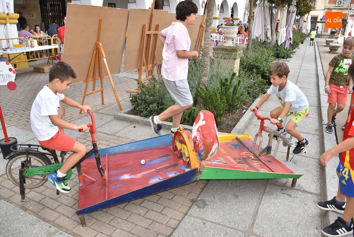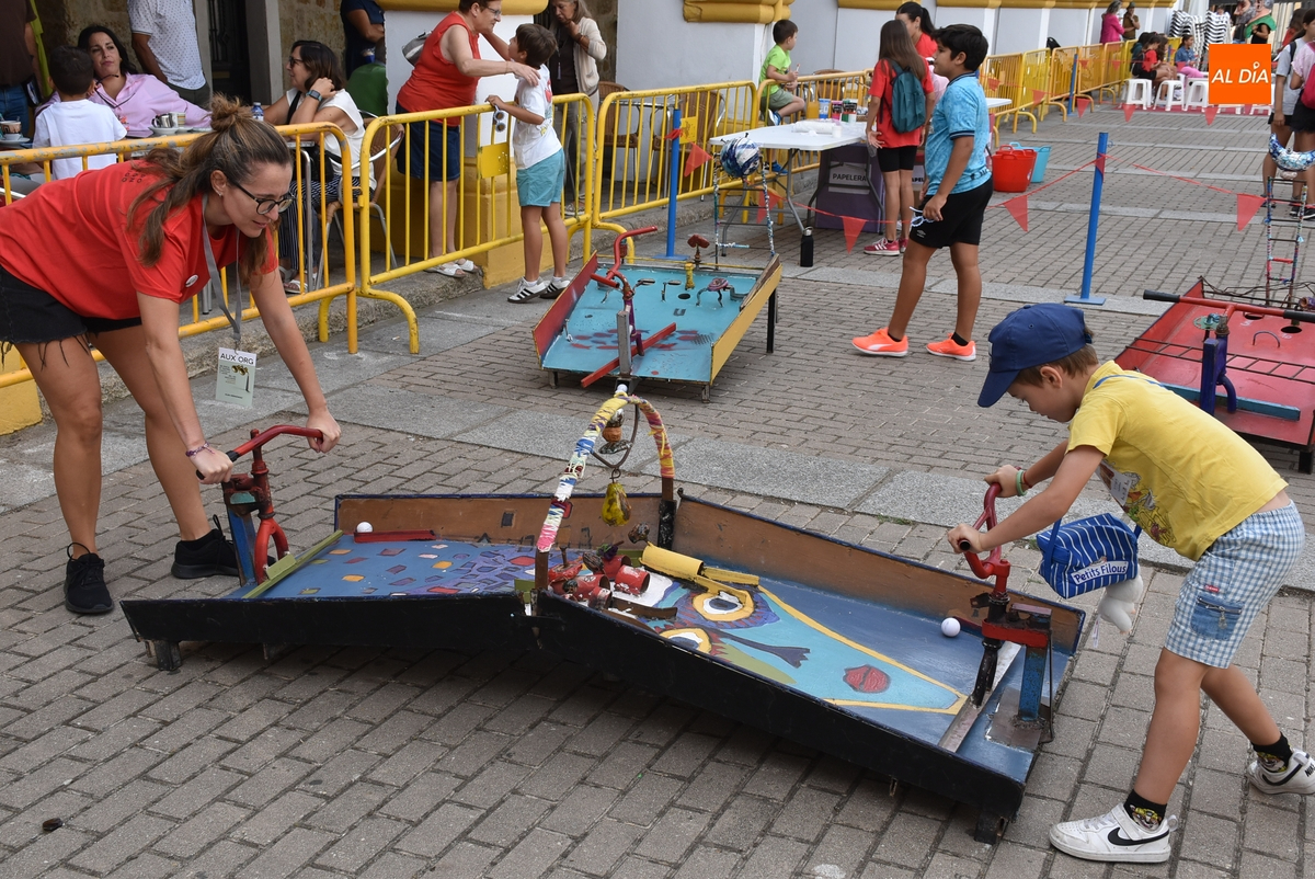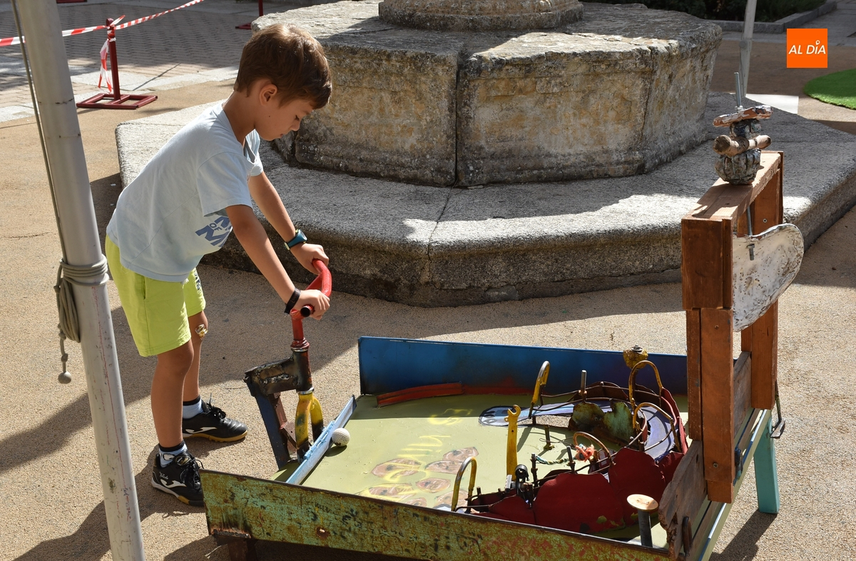 El Divierteatro de este año tiene dos grandes instalaciones en la Plazuela del Buen Alcalde. Por un lado, la compañía de las Islas Baleares Lîla Juegos reciclados y Circo ha repartido una amplia variedad de juegos hechos con material reciclado (bidones, ollas, paellas y todo tipo de hierros), en la mayoría de los cuales se puede jugar libremente, pero también hay dos ‘atracciones’ -hechas asimismo con material reciclado- que causaron sensación en la mañana del miércoles, teniendo cola para montar casi de forma constante.