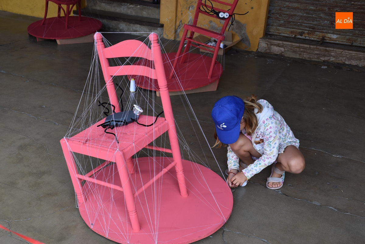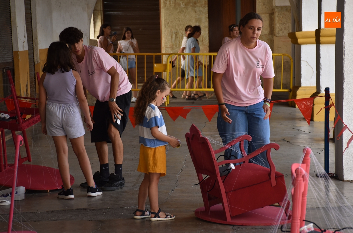 Continuando por los soportales, la parte frontal de la Plazuela alberga uno de los talleres colectivos de esta edición, denominado Una araña en el teatro, en el que se invita a los niños a ir cubriendo con hilo distintas sillas. El otro taller colectivo del Divierteatro 2025 es Pinta el Teatro, en el cual, a lo largo de estos días, se irá creando bajo la dirección de Adelia Vicente un mural colectivo en homenaje al 125 Aniversario.