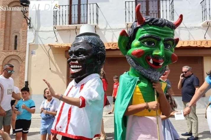 El último día de las fiestas de Alba de Tormes no podía quedarse sin una salida de cabezudos, que este miércoles a mediodía recorrieron la Plaza Mayor acompañados por la animada música de la charanga “Bombazo”.