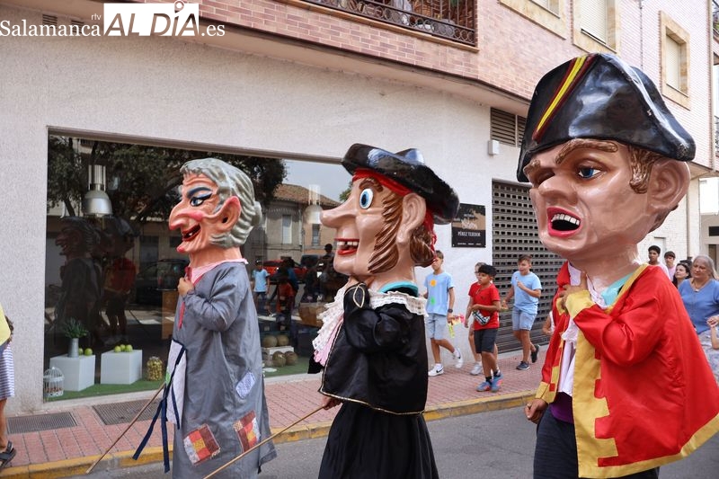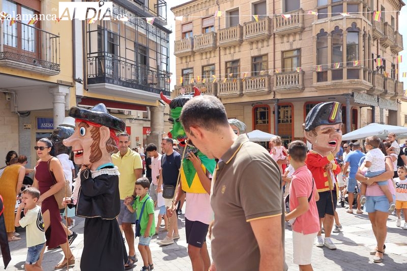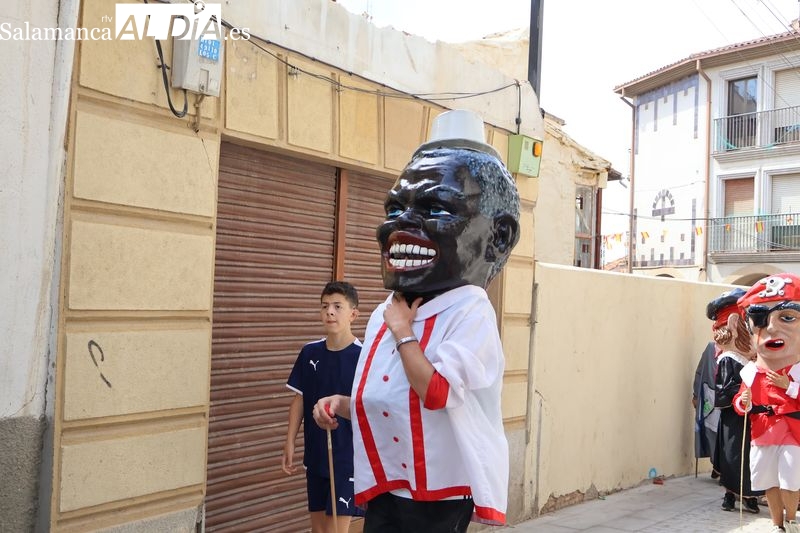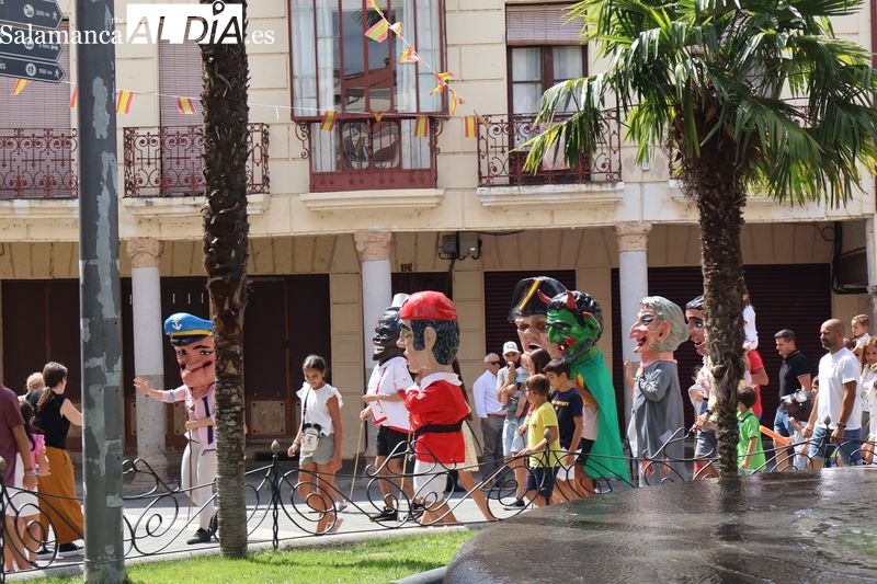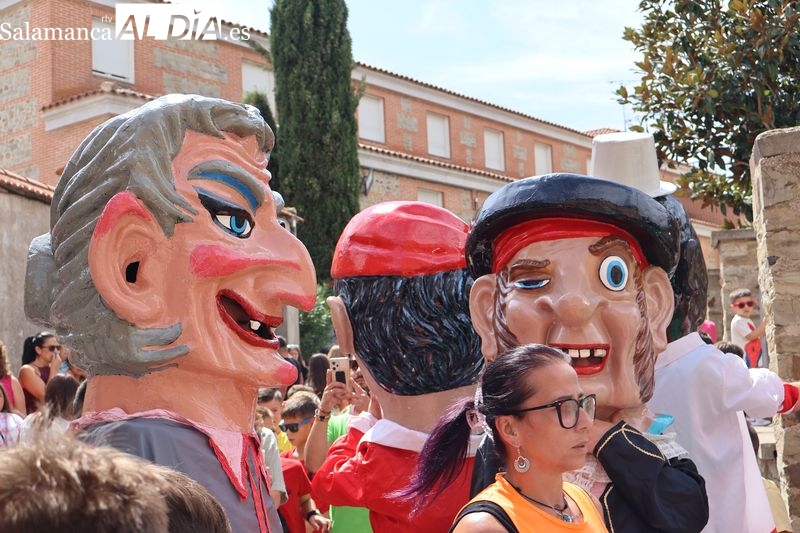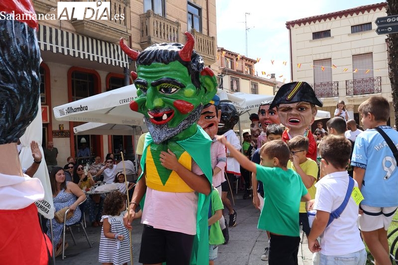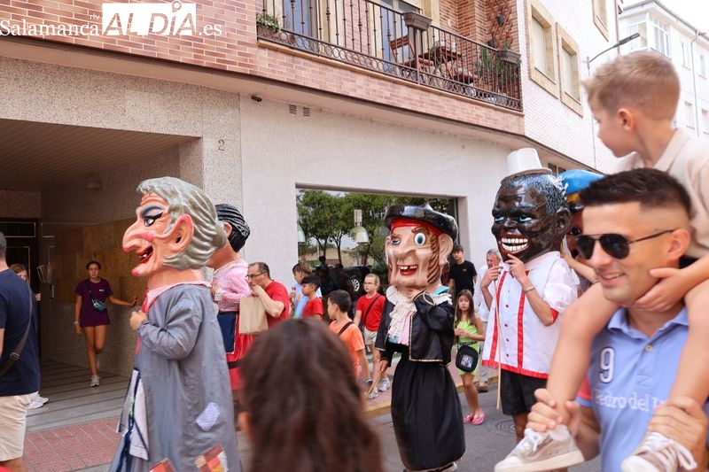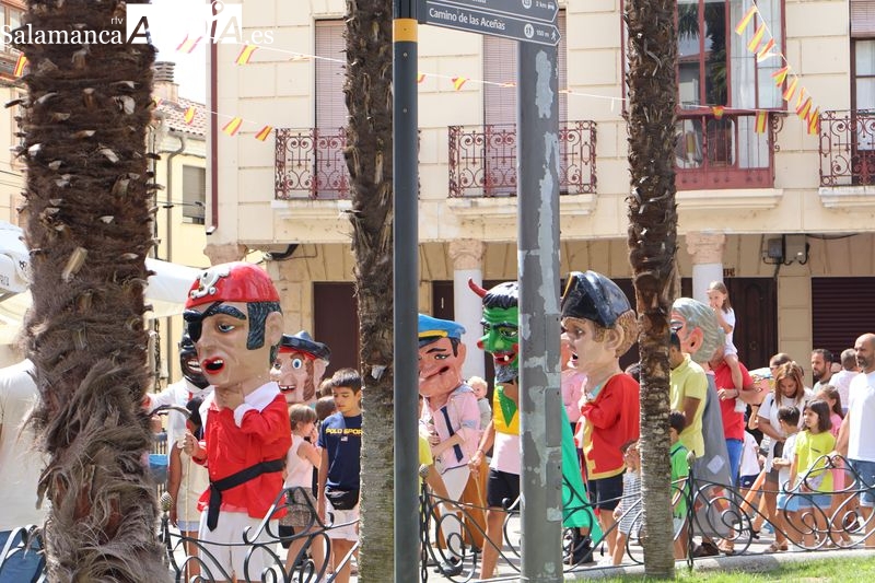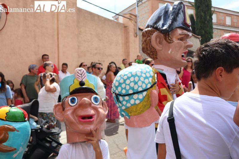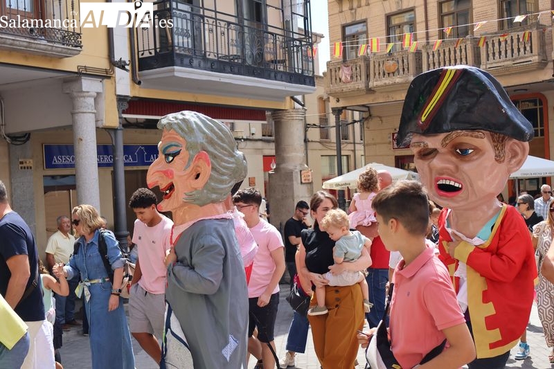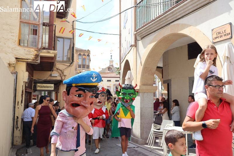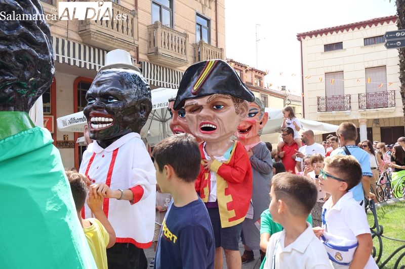 El último día de las fiestas de Alba de Tormes no podía quedarse sin una salida de cabezudos, que este miércoles a mediodía recorrieron la Plaza Mayor acompañados por la animada música de la charanga “Bombazo”.