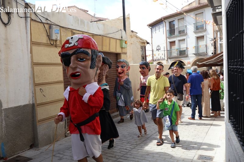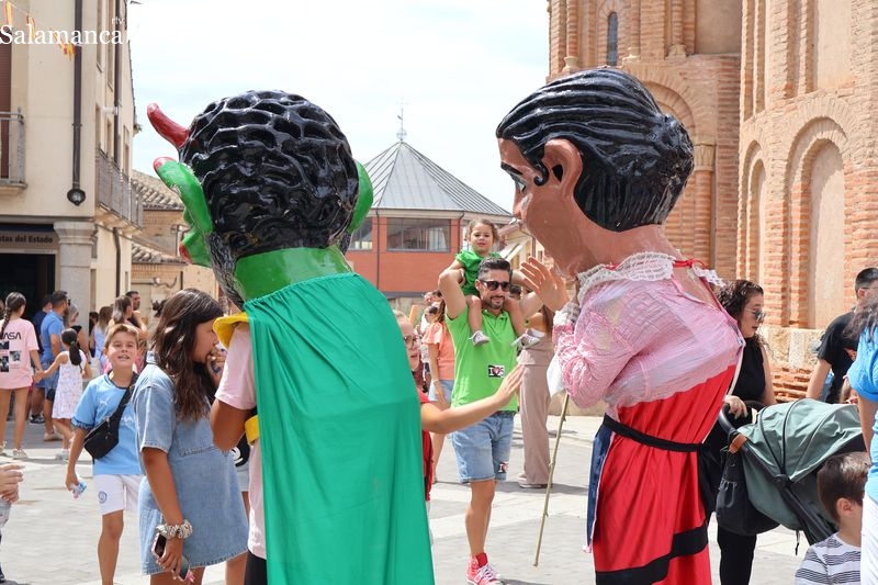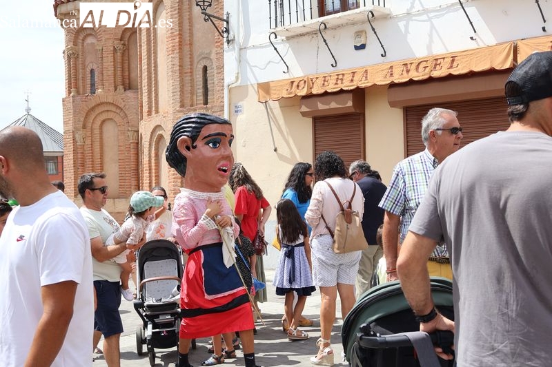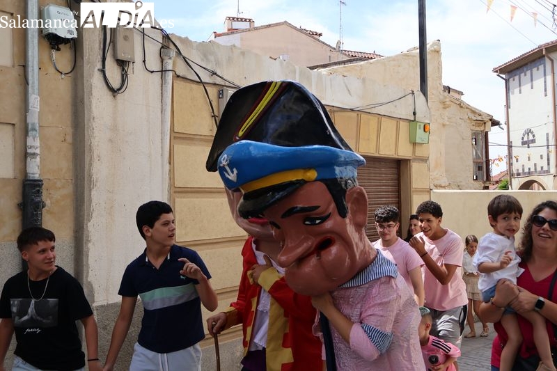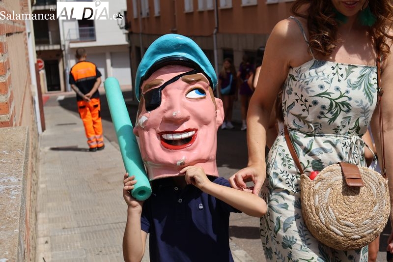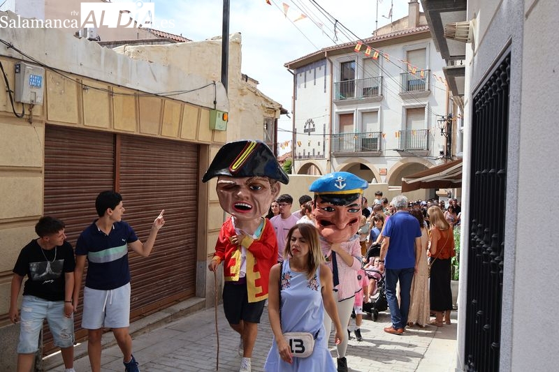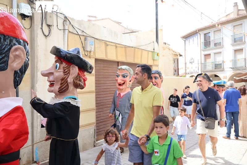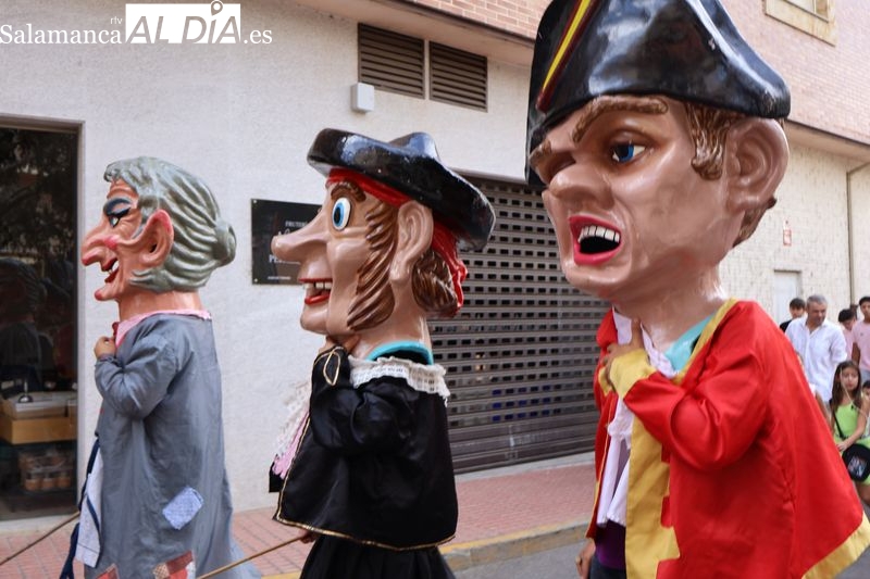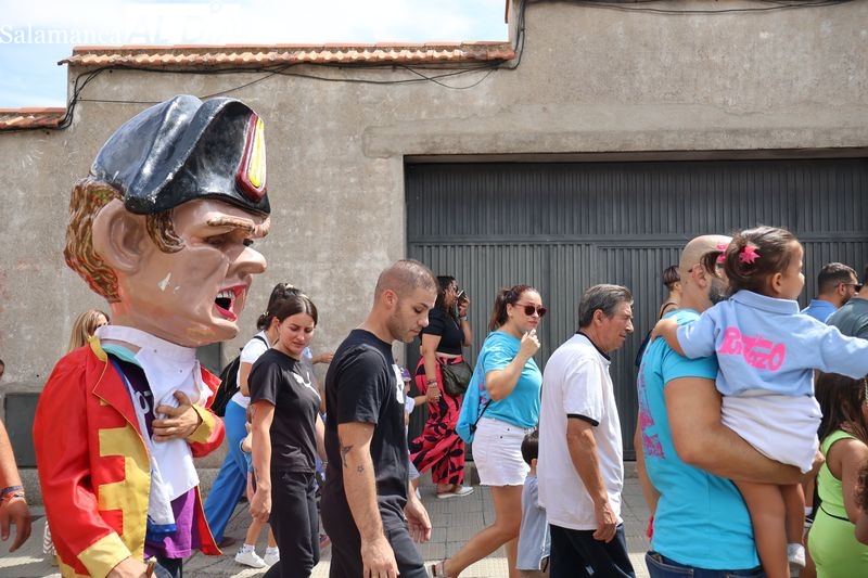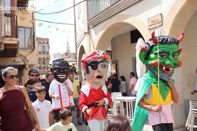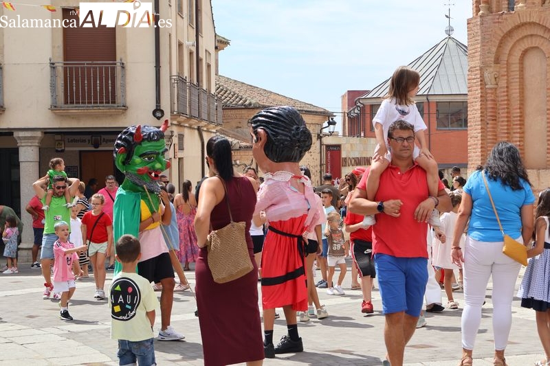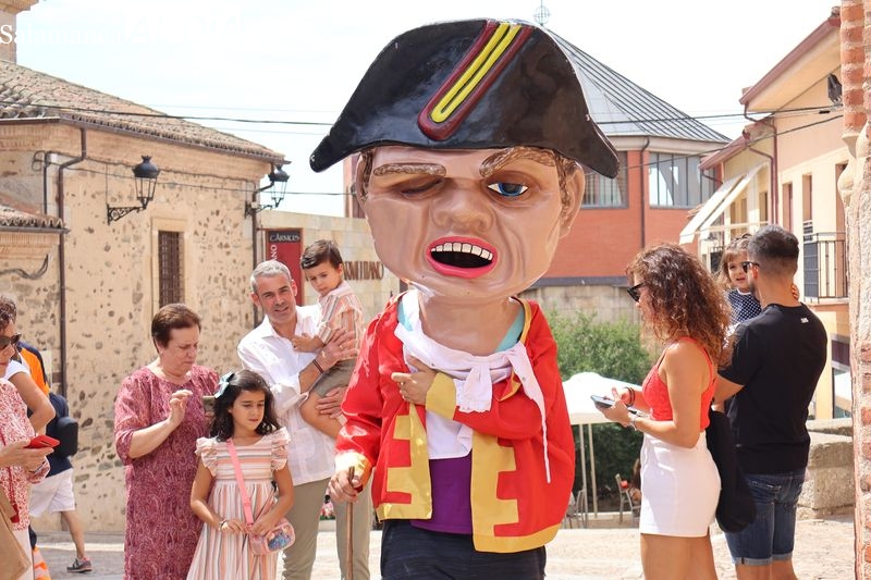 El último día de las fiestas de Alba de Tormes no podía quedarse sin una salida de cabezudos, que este miércoles a mediodía recorrieron la Plaza Mayor acompañados por la animada música de la charanga “Bombazo”.