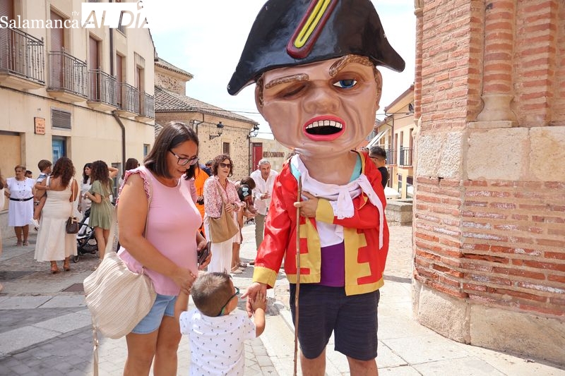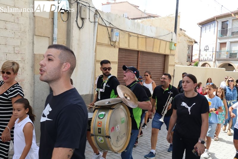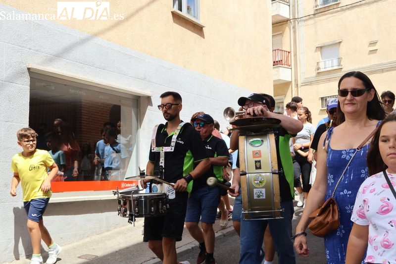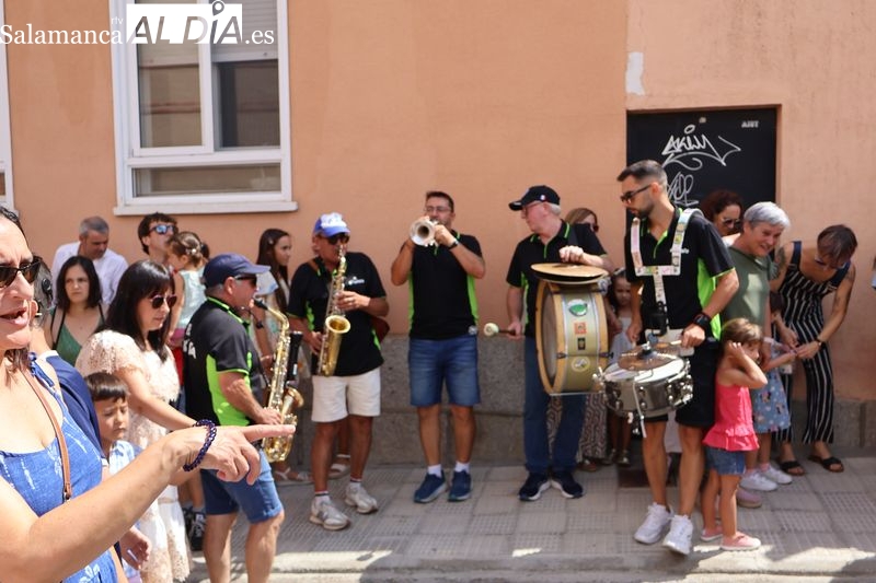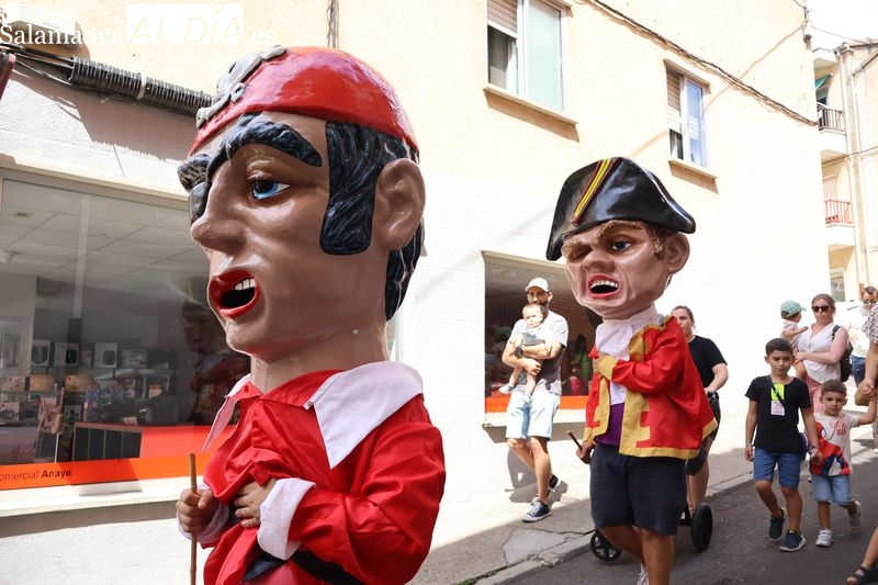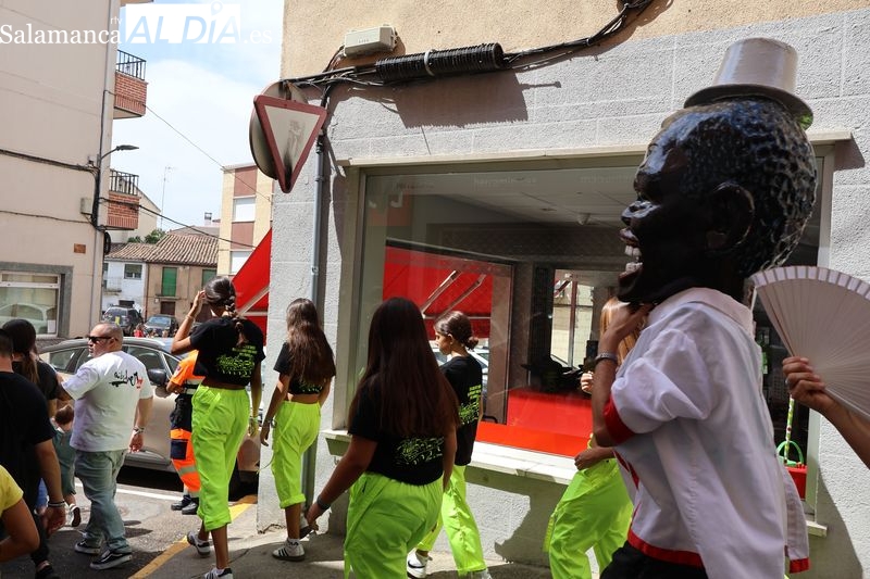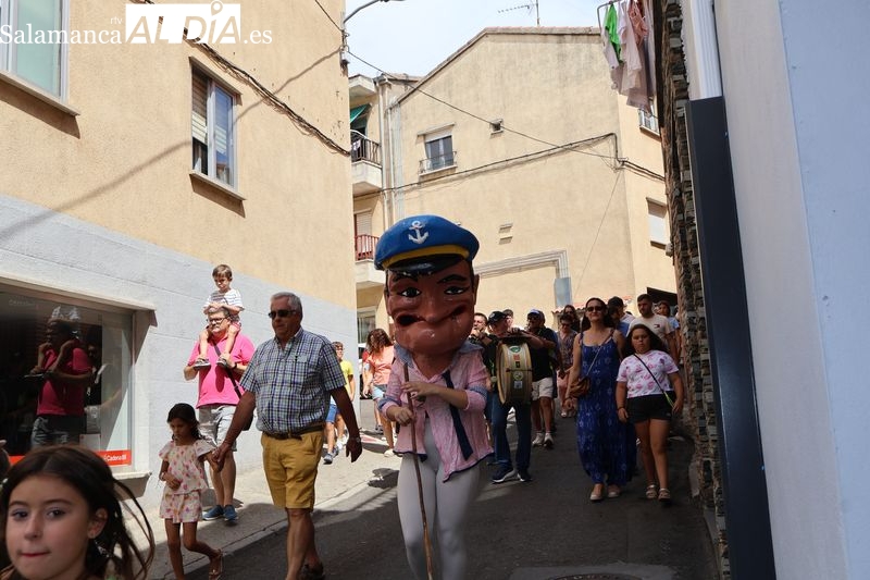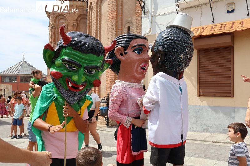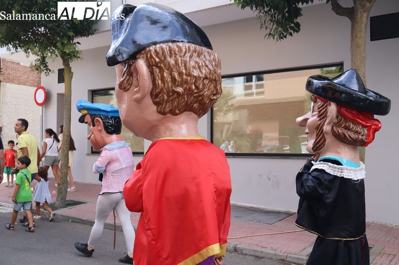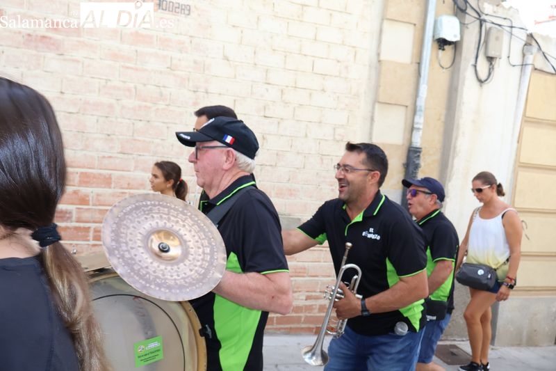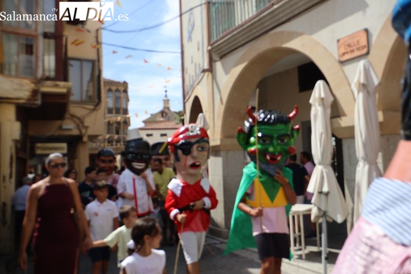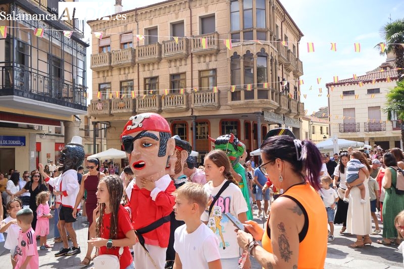 El último día de las fiestas de Alba de Tormes no podía quedarse sin una salida de cabezudos, que este miércoles a mediodía recorrieron la Plaza Mayor acompañados por la animada música de la charanga “Bombazo”.