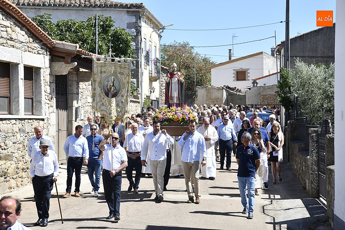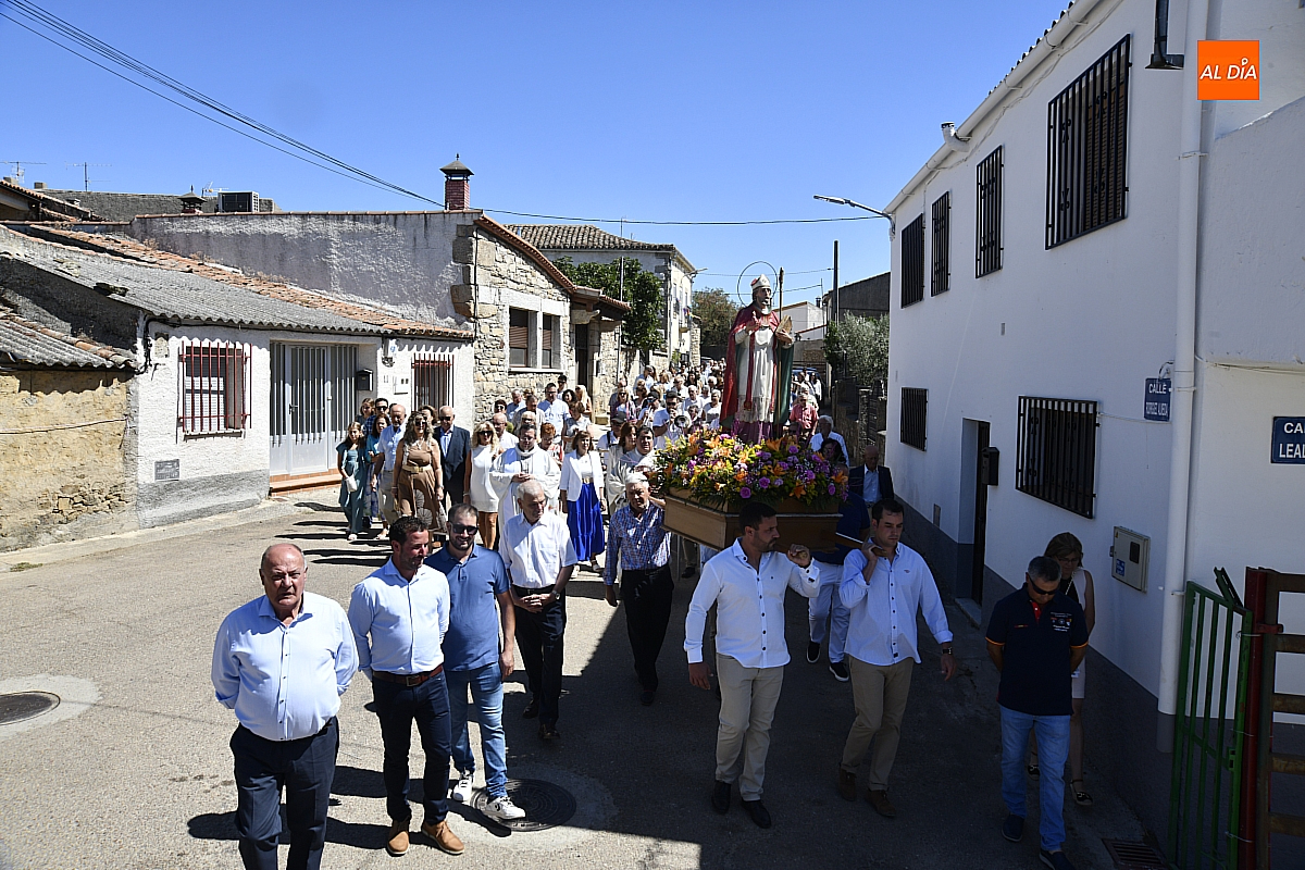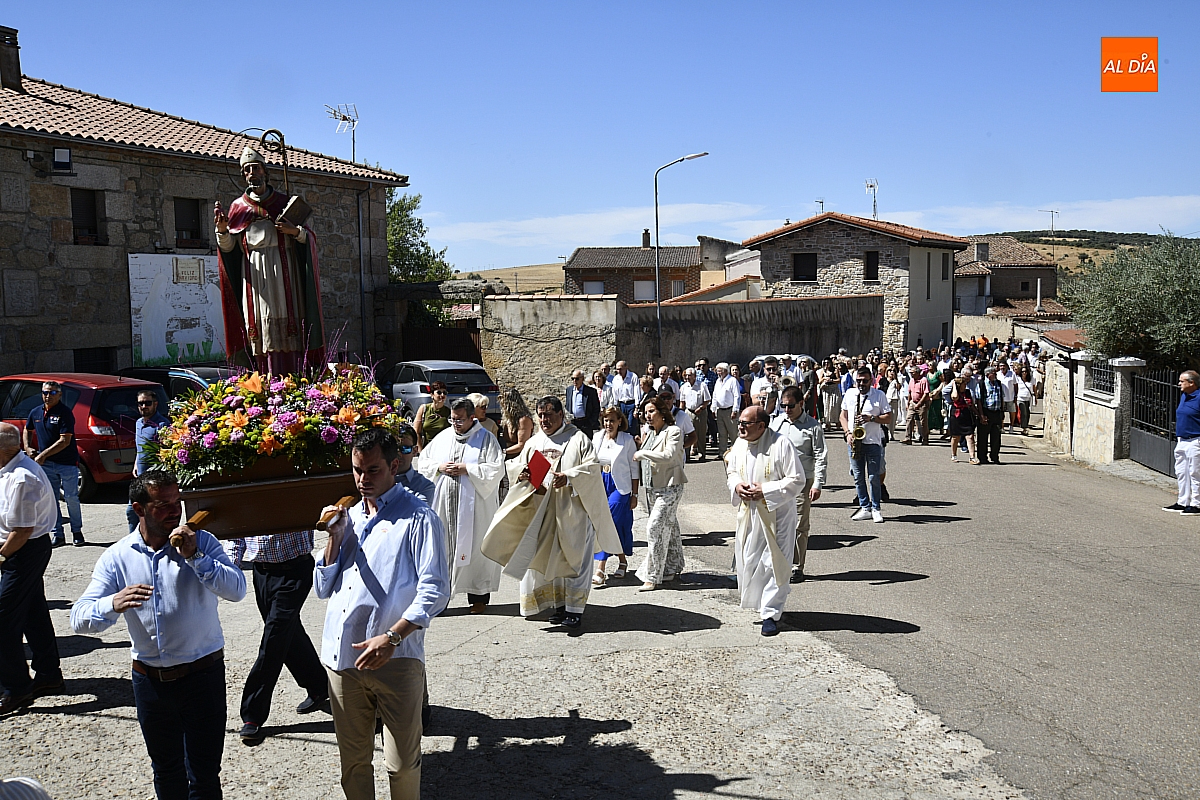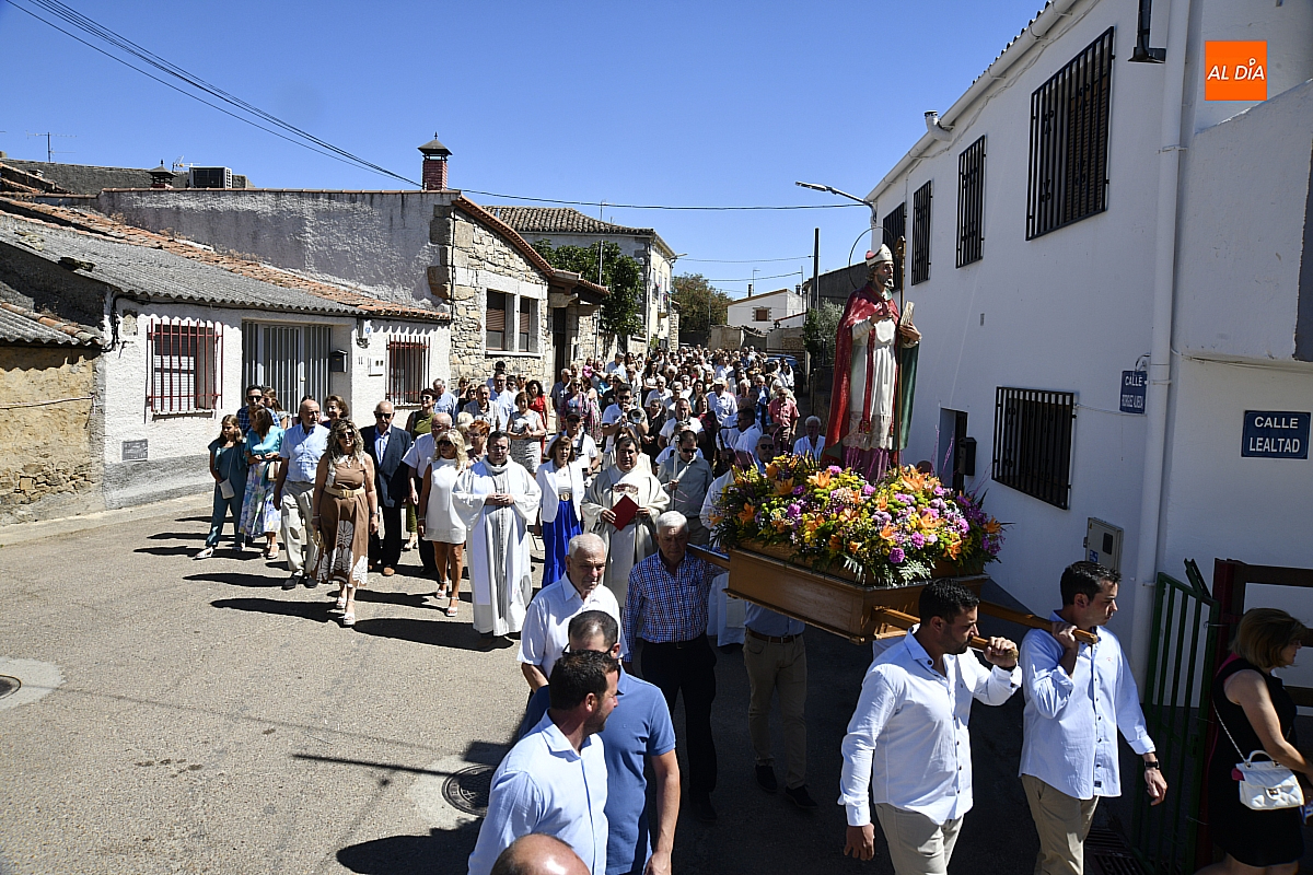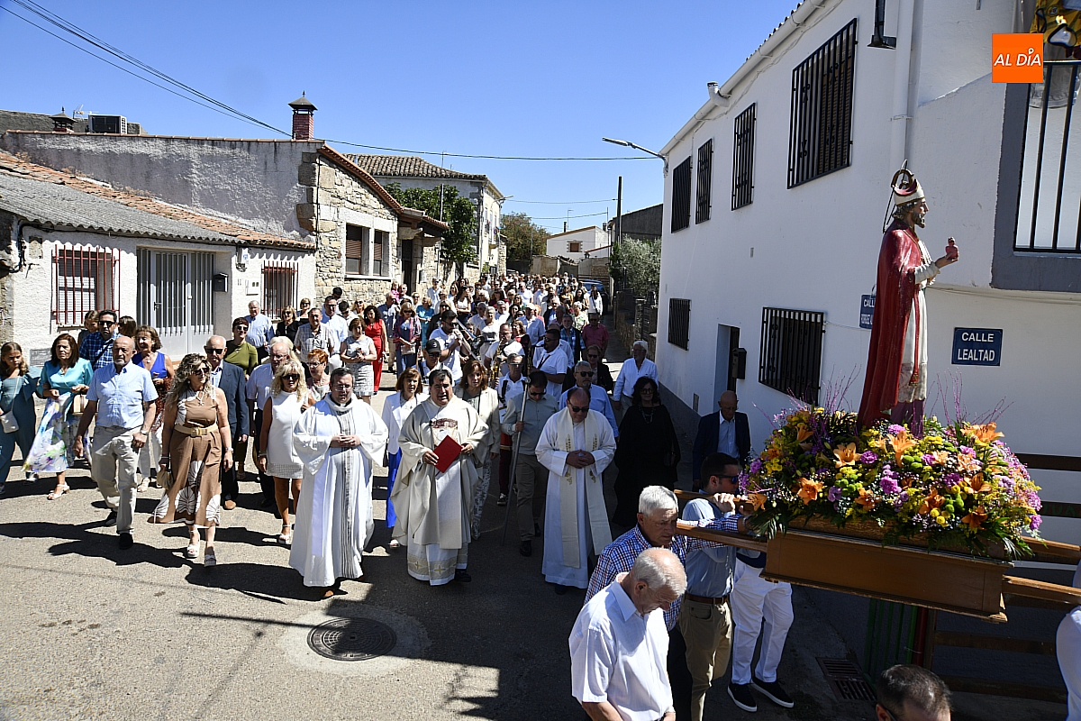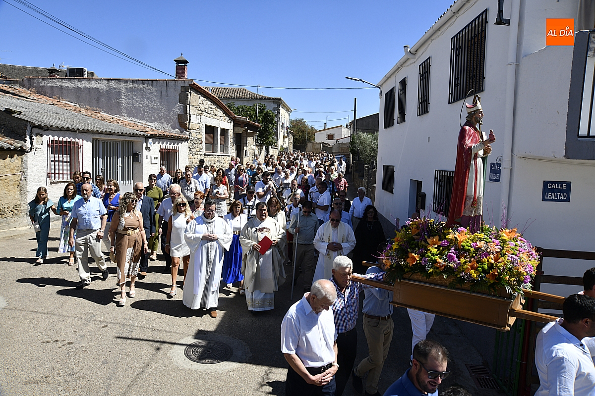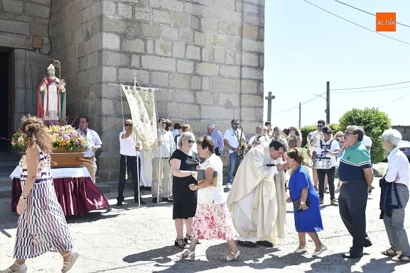 Al mediodía, los vecinos, a quienes se conoce con el afectuoso apelativo de cervatos, acudieron a la iglesia parroquial, engalanados con sus mejores trajes, para participar en la eucaristía oficiada por el párroco Juan Carlos Bernardos. Estuvo acompañado por los sacerdotes Miguel Ángel García y José Sánchez, representantes de los arciprestazgos de La Ribera y El Abadengo, todos ellos pertenecientes a la diócesis de Ciudad Rodrigo. La homilía, centrada en la figura del santo, dio paso a una procesión que recorrió las calles del pueblo, entre el tañido jubiloso de las campanas y las notas festivas de la charanga mirobrigense Al Rojo.
