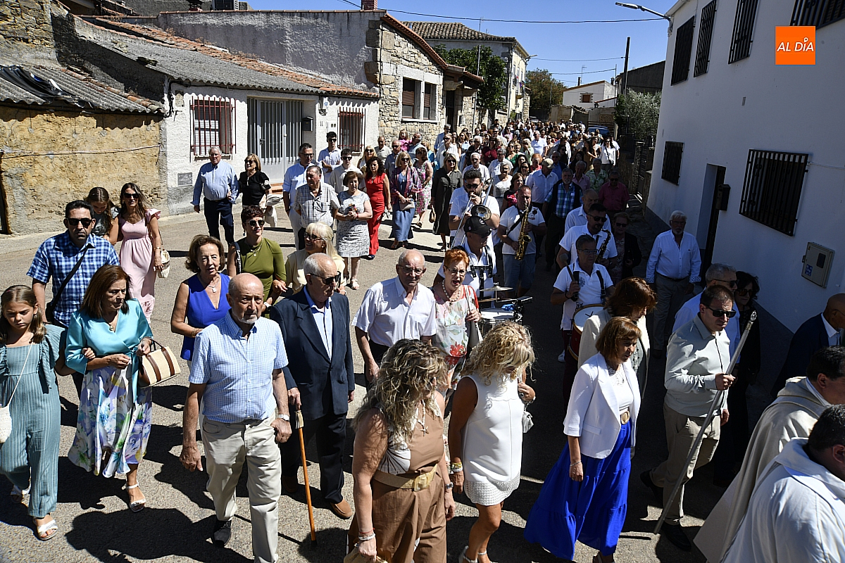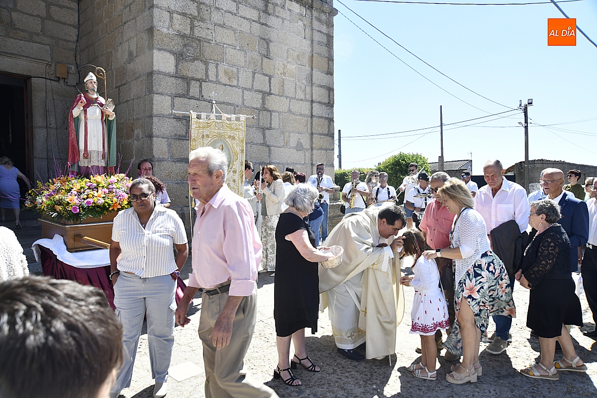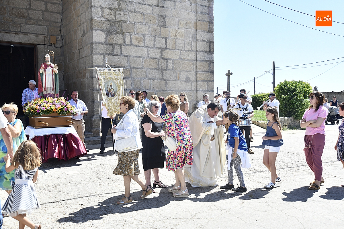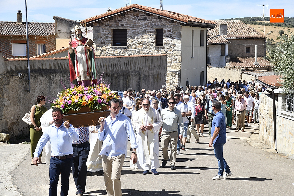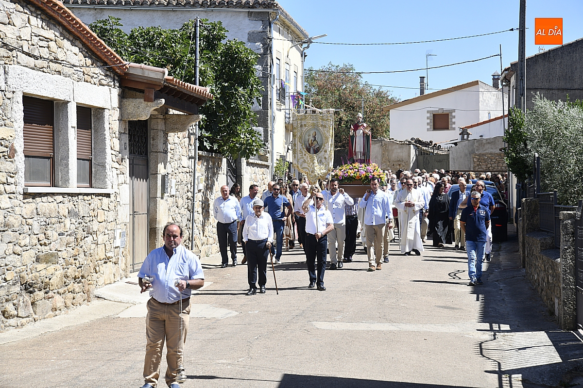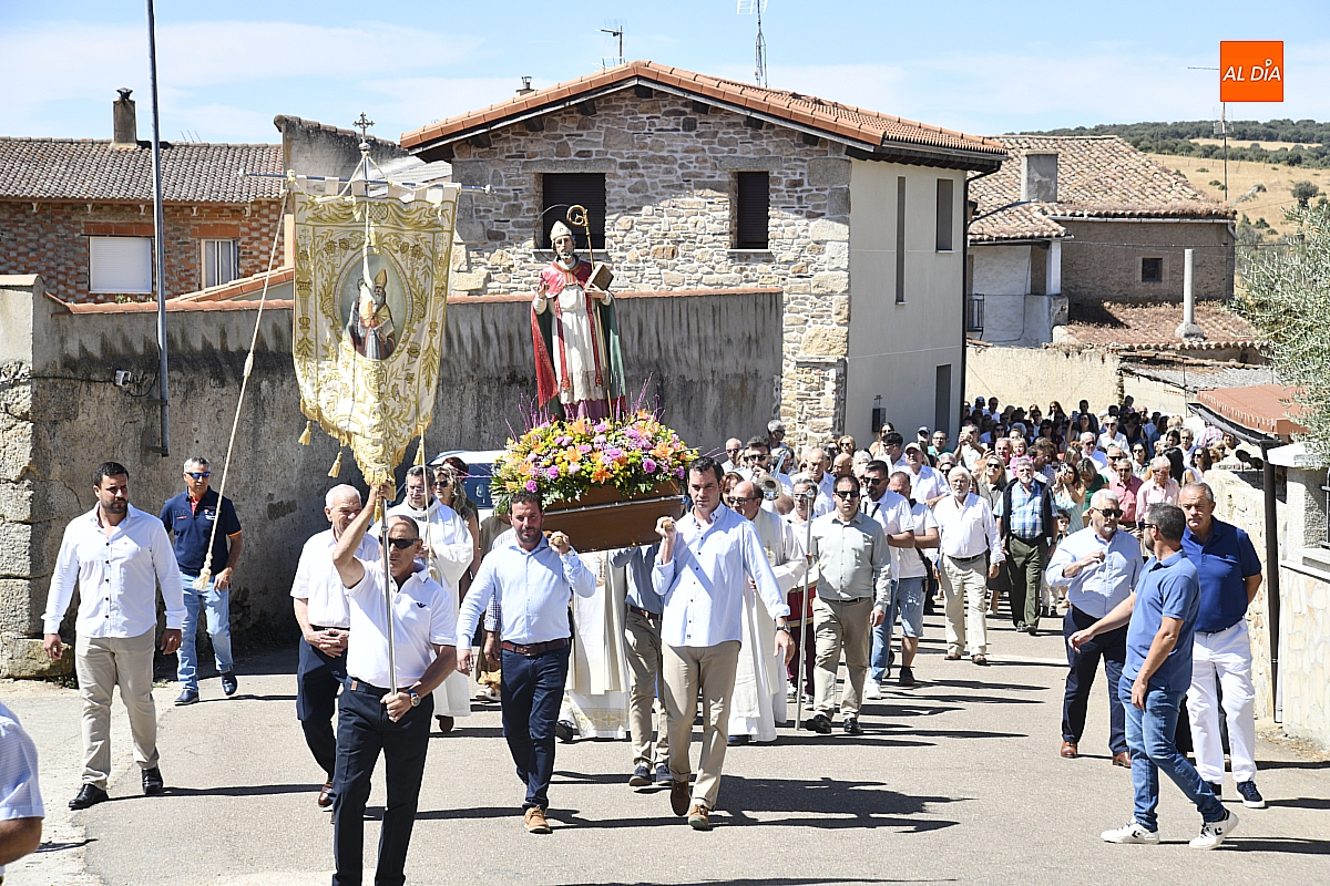Al mediodía, los vecinos, a quienes se conoce con el afectuoso apelativo de cervatos, acudieron a la iglesia parroquial, engalanados con sus mejores trajes, para participar en la eucaristía oficiada por el párroco Juan Carlos Bernardos. Estuvo acompañado por los sacerdotes Miguel Ángel García y José Sánchez, representantes de los arciprestazgos de La Ribera y El Abadengo, todos ellos pertenecientes a la diócesis de Ciudad Rodrigo. La homilía, centrada en la figura del santo, dio paso a una procesión que recorrió las calles del pueblo, entre el tañido jubiloso de las campanas y las notas festivas de la charanga mirobrigense Al Rojo.