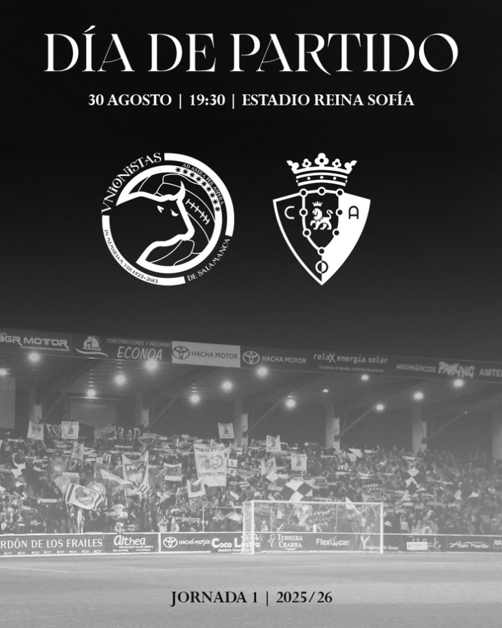 ¡Saludos y bienvenidos a la retransmisión en directo del Unionistas - Osasuna B! Desde SALAMANCArtv AL DÍA te contamos todo lo que pase en el partido y así no te pierdes absolutamente nada gracias a nuestro minuto a minuto. El balón comenzará a rodar en el Reina Sofía a partir de las 19:30 horas en la jornada 1 de Liga de Primera Federación.