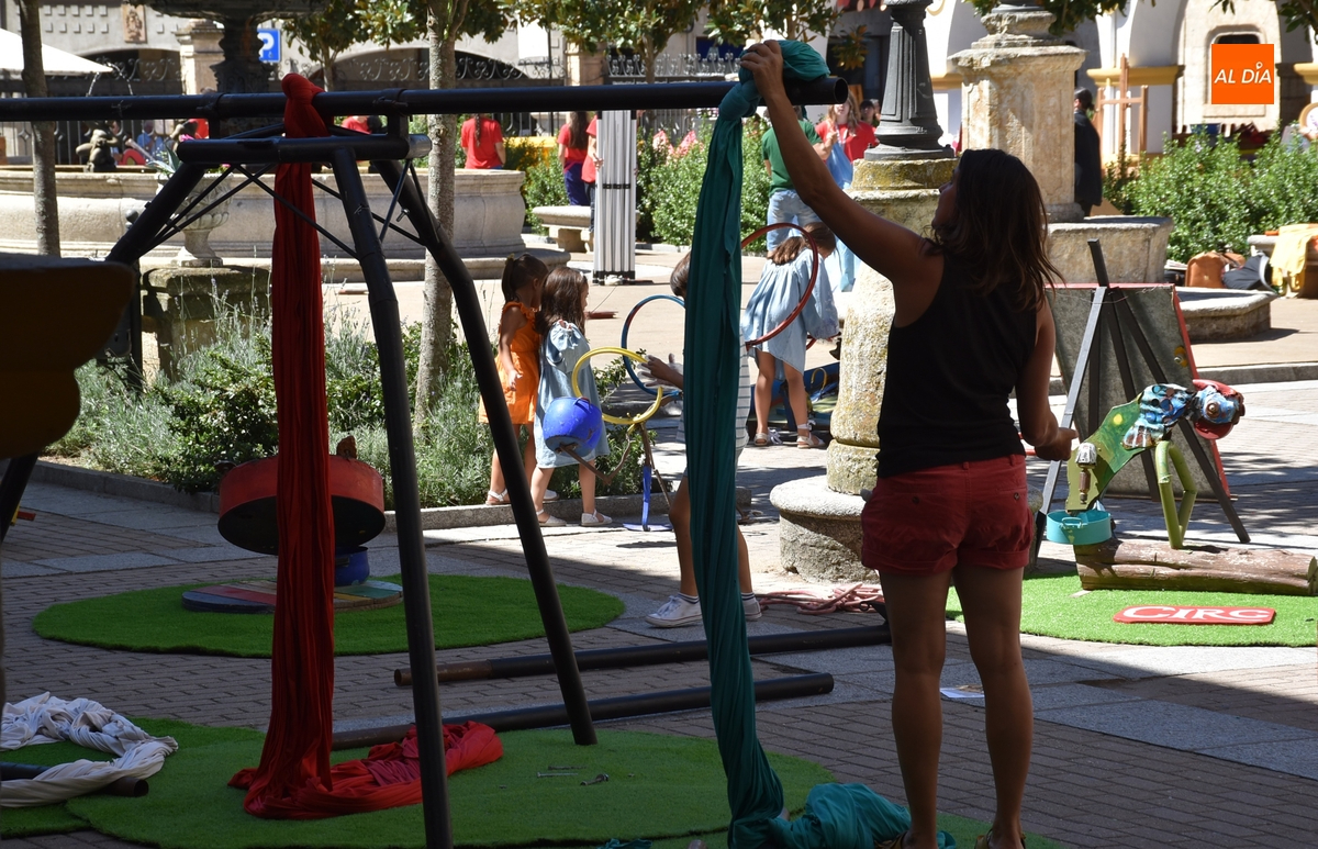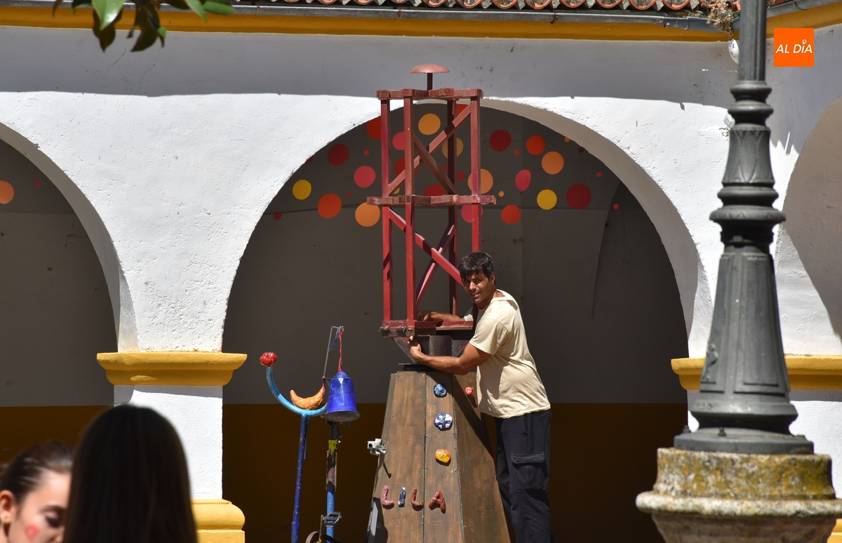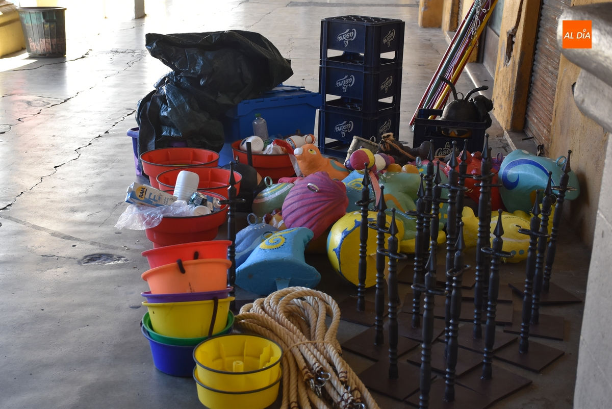 En ese momento, en el que ya se habían quitado los medallones con las imágenes gráficas anteriores del Divierteatro y la Feria de Teatro, se estaban poco a poco retirando los elementos de la instalación de Lîla juegos reciclados, esperando eso sí a que concluyese el pasacalles de Very Big Pulga para poder acceder con vehículos a la zona de la Plazuela del Buen Alcalde para cargarlos.