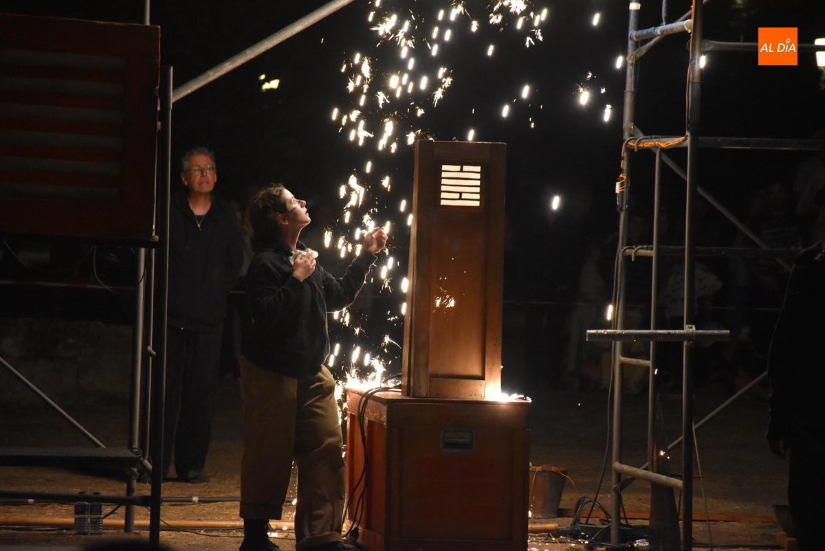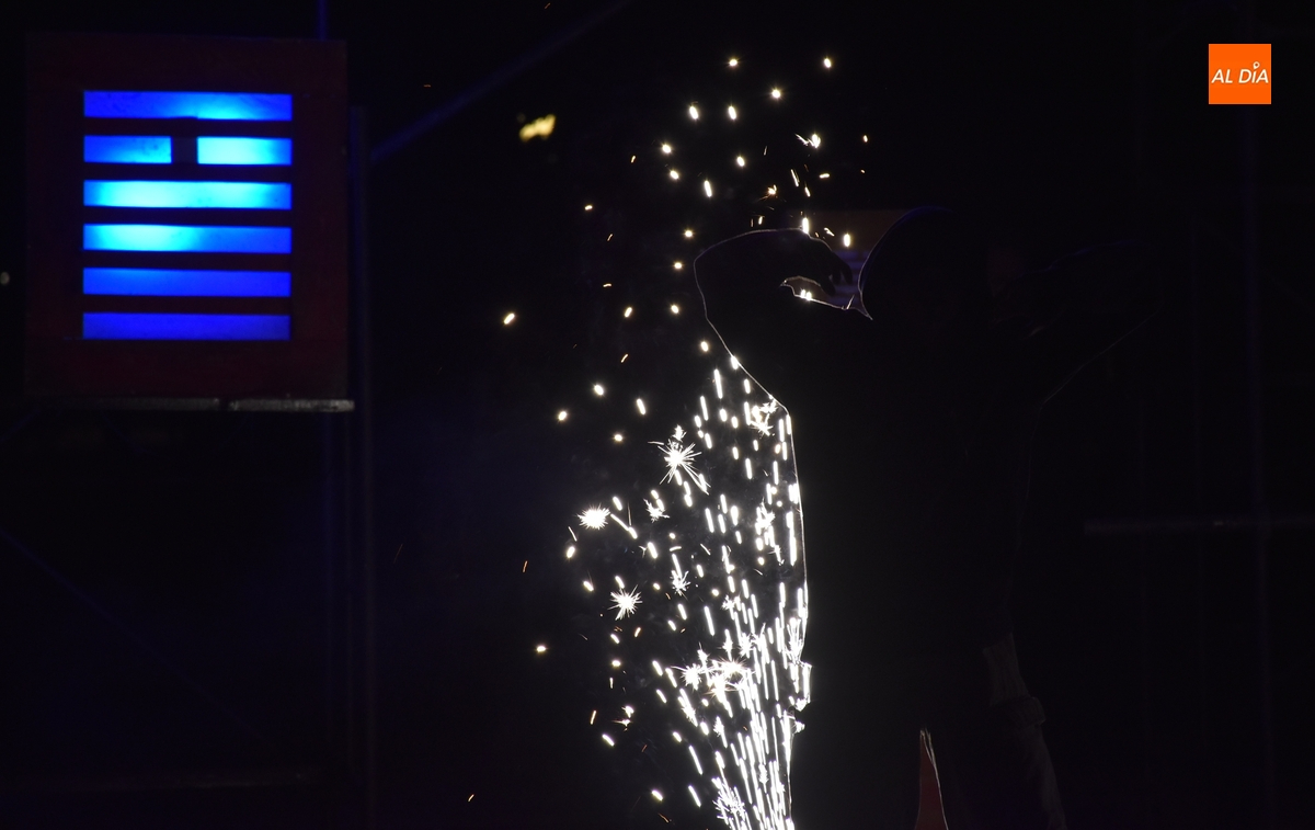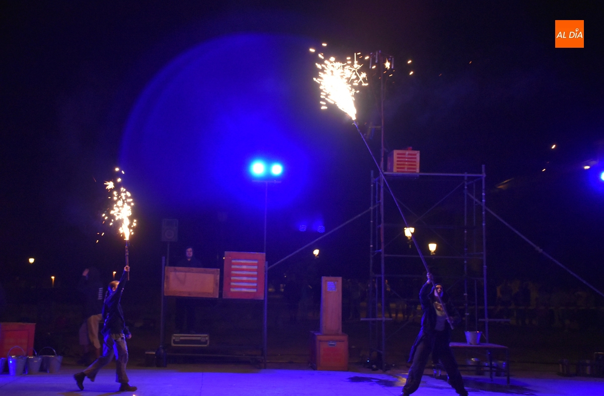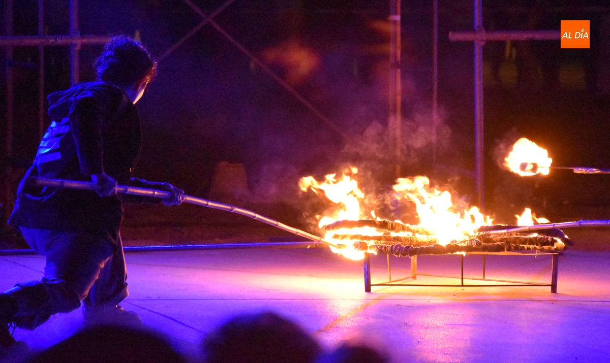 Pese a la suspensión del pasacalles previsto para el sábado, la Feria de Teatro de Castilla y León 2025 no se ha quedado del todo sin pirotecnia, gracias al espectáculo que se pudo presenciar en la noche del viernes en un recinto acotado como son los Jardines de Bolonia. Eso sí, el verdadero protagonista de la velada fue el puro fuego, que de hecho da nombre en catalán, Foc, a este montaje perteneciente a la compañía L’Avalot, que lo estuvo preparando en el lugar desde primera hora de la mañana.