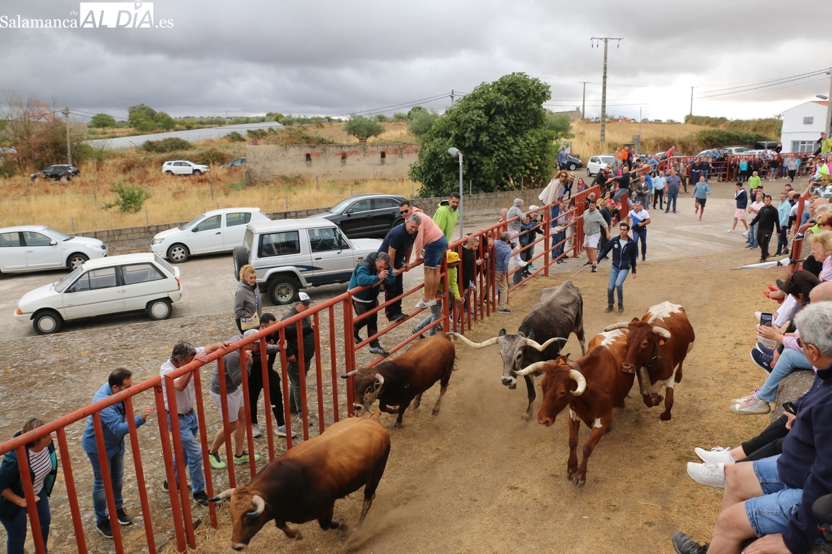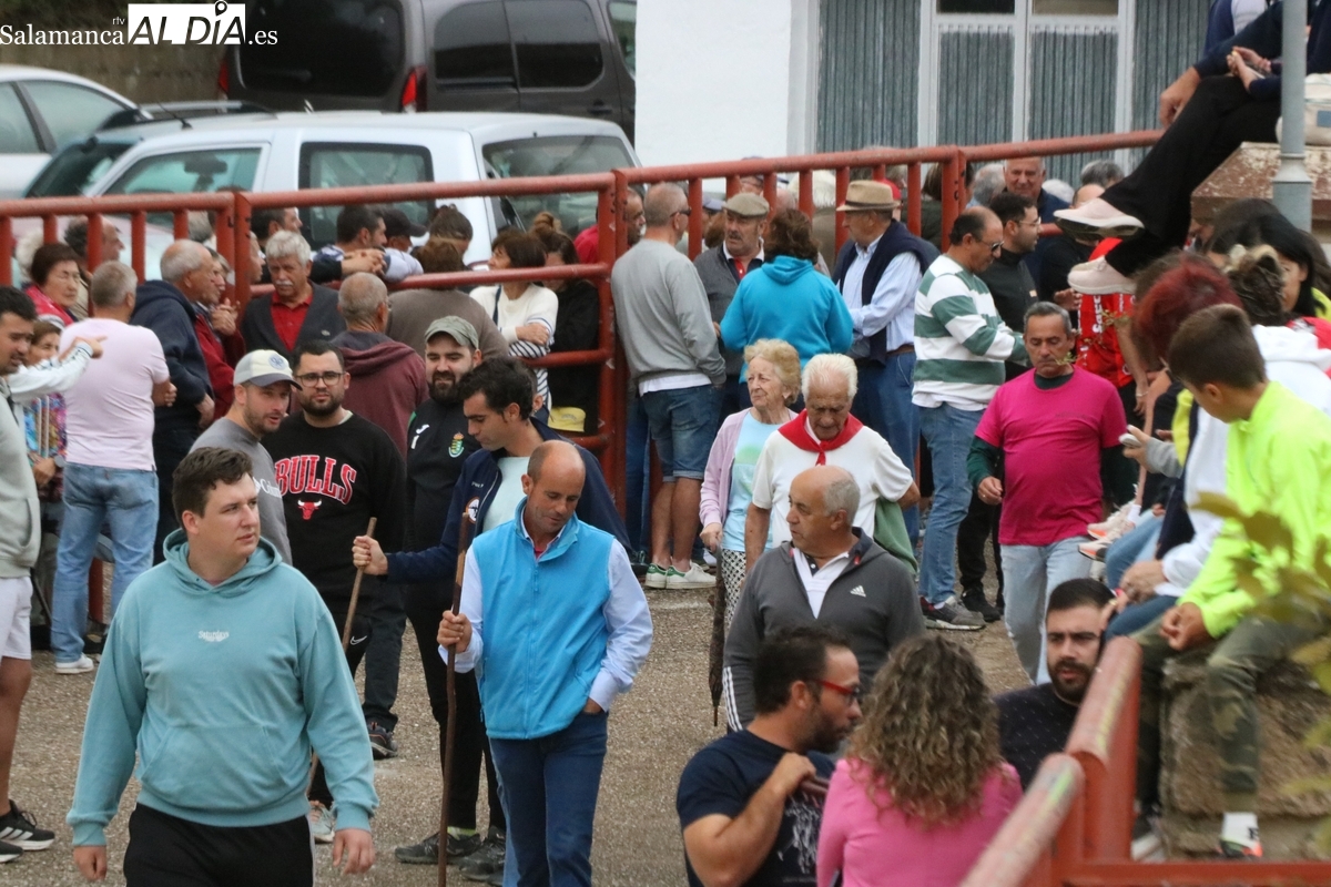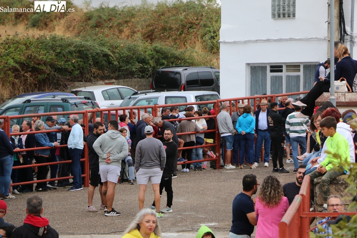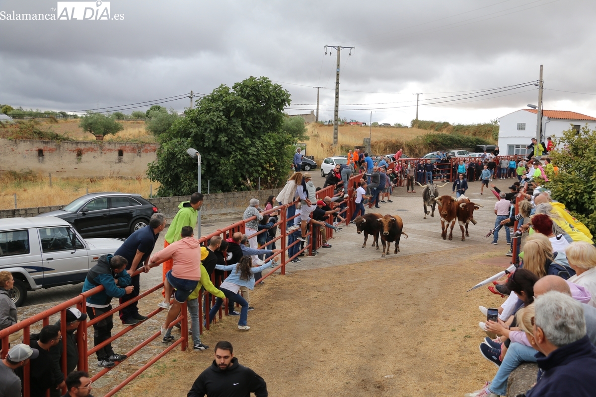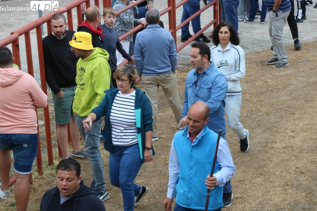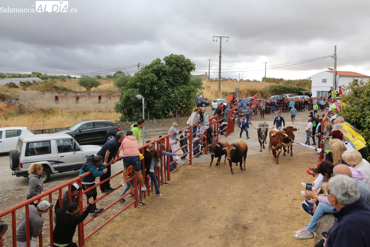Con bastante público de localidades próximas, como Villarino y Aldeadávila, aunque también incluso de otras alejadas como el municipio zamorano de Fermoselle, de manera puntual salían de toriles los tres mansos para realizar el recorrido en sentido inverso hasta el camión. A continuación salían a la calle los dos primeros novillos, todos ellos de capa castaña.