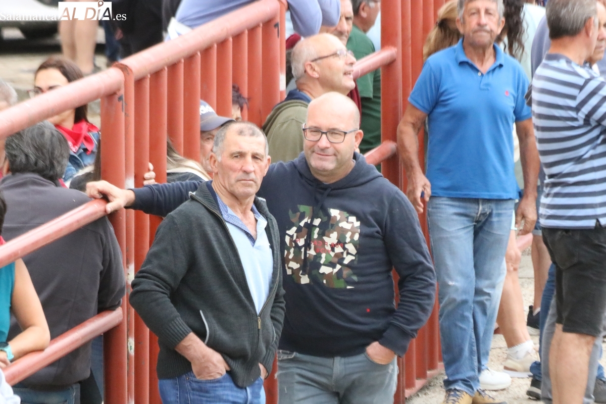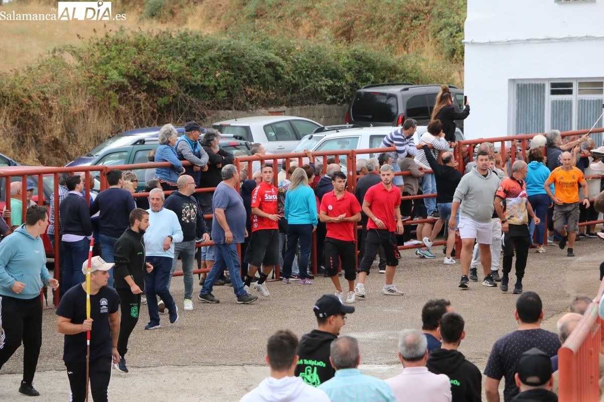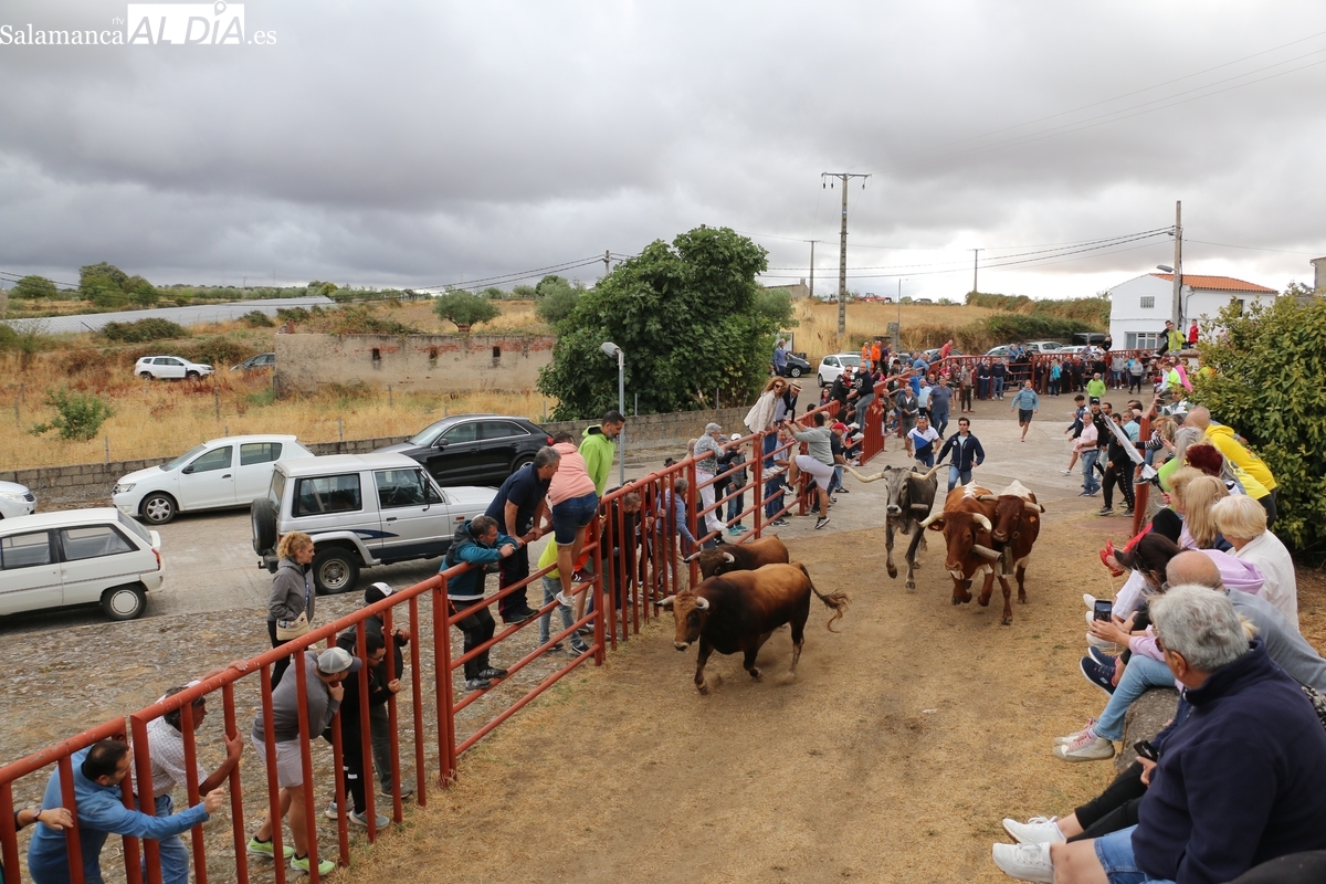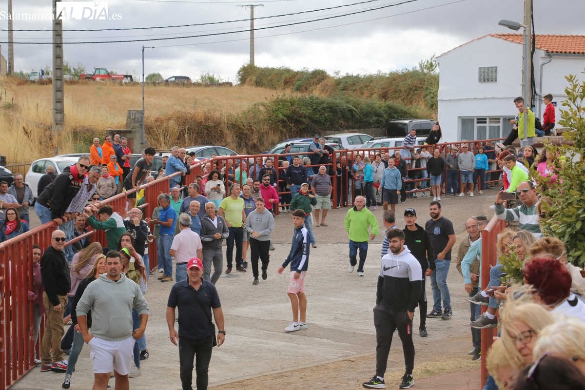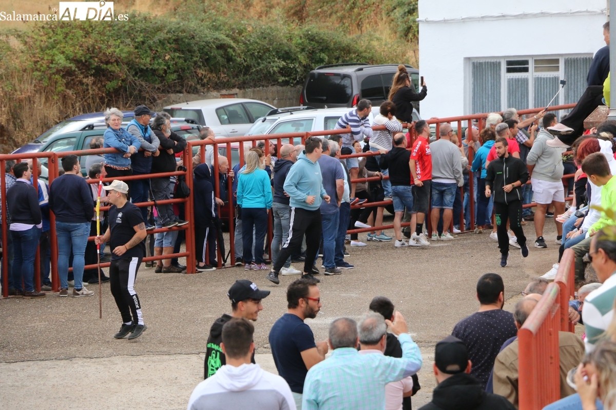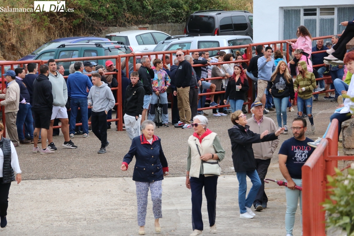 Con bastante público de localidades próximas, como Villarino y Aldeadávila, aunque también incluso de otras alejadas como el municipio zamorano de Fermoselle, de manera puntual salían de toriles los tres mansos para realizar el recorrido en sentido inverso hasta el camión. A continuación salían a la calle los dos primeros novillos, todos ellos de capa castaña.