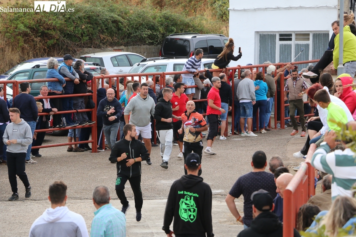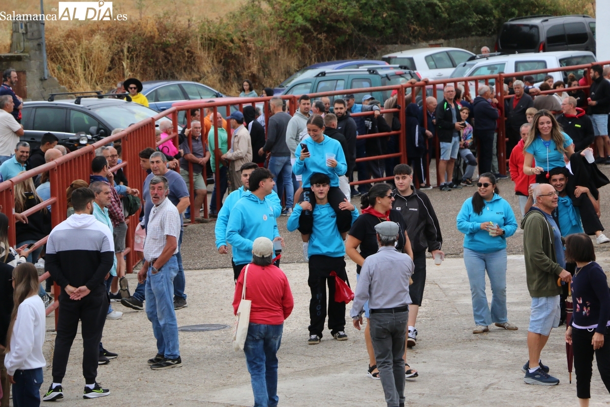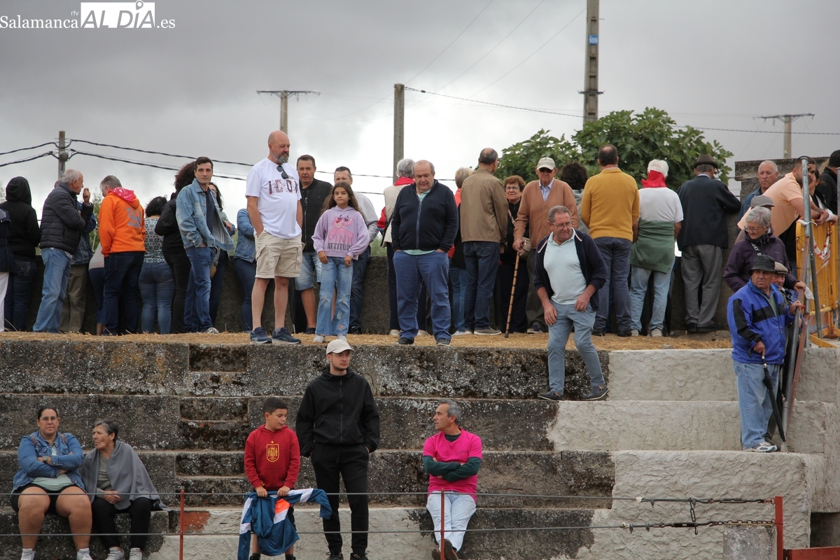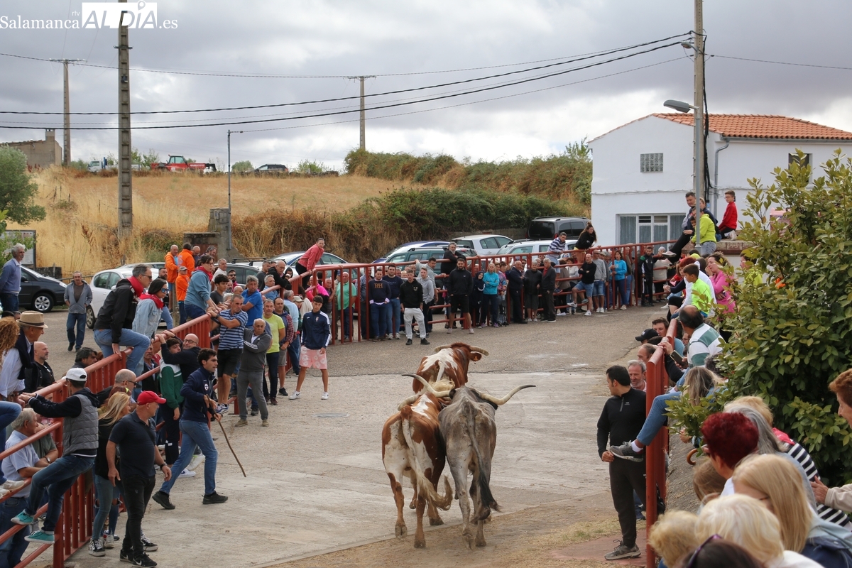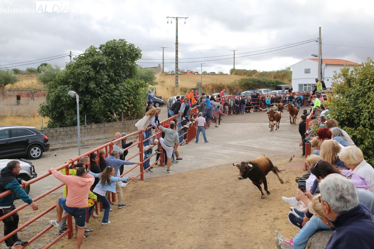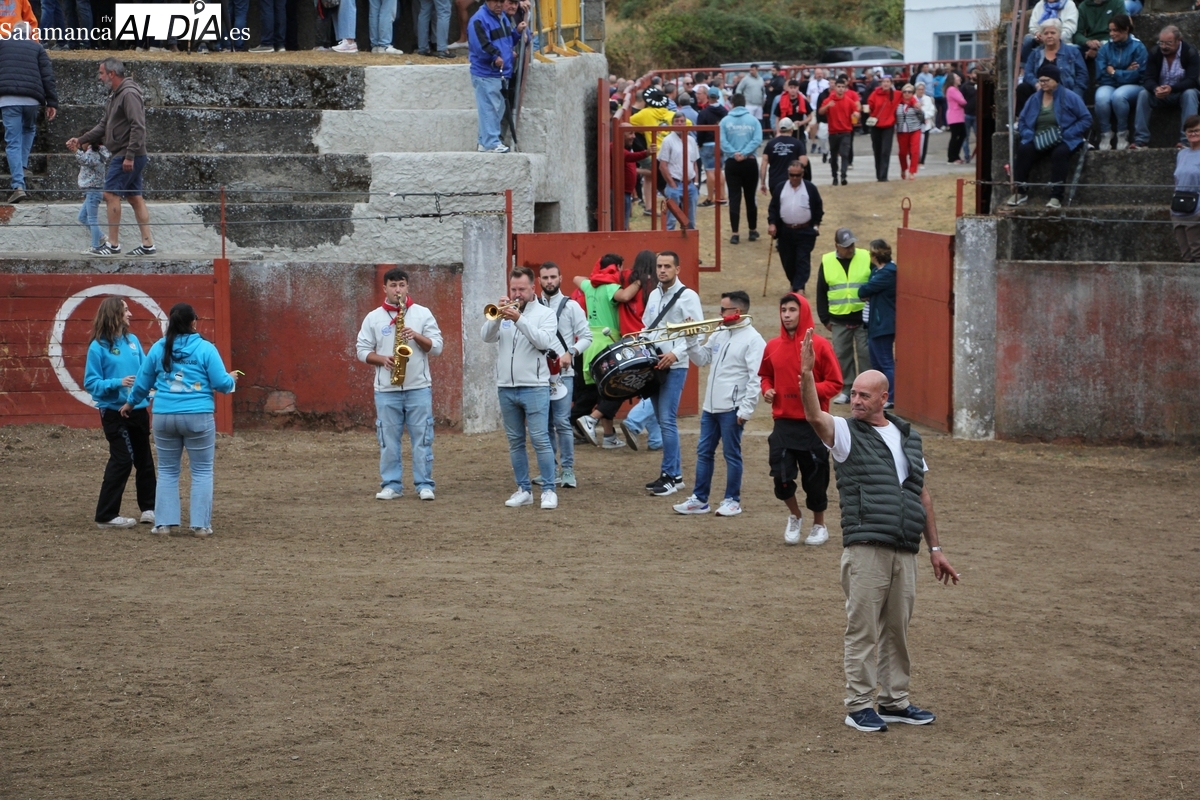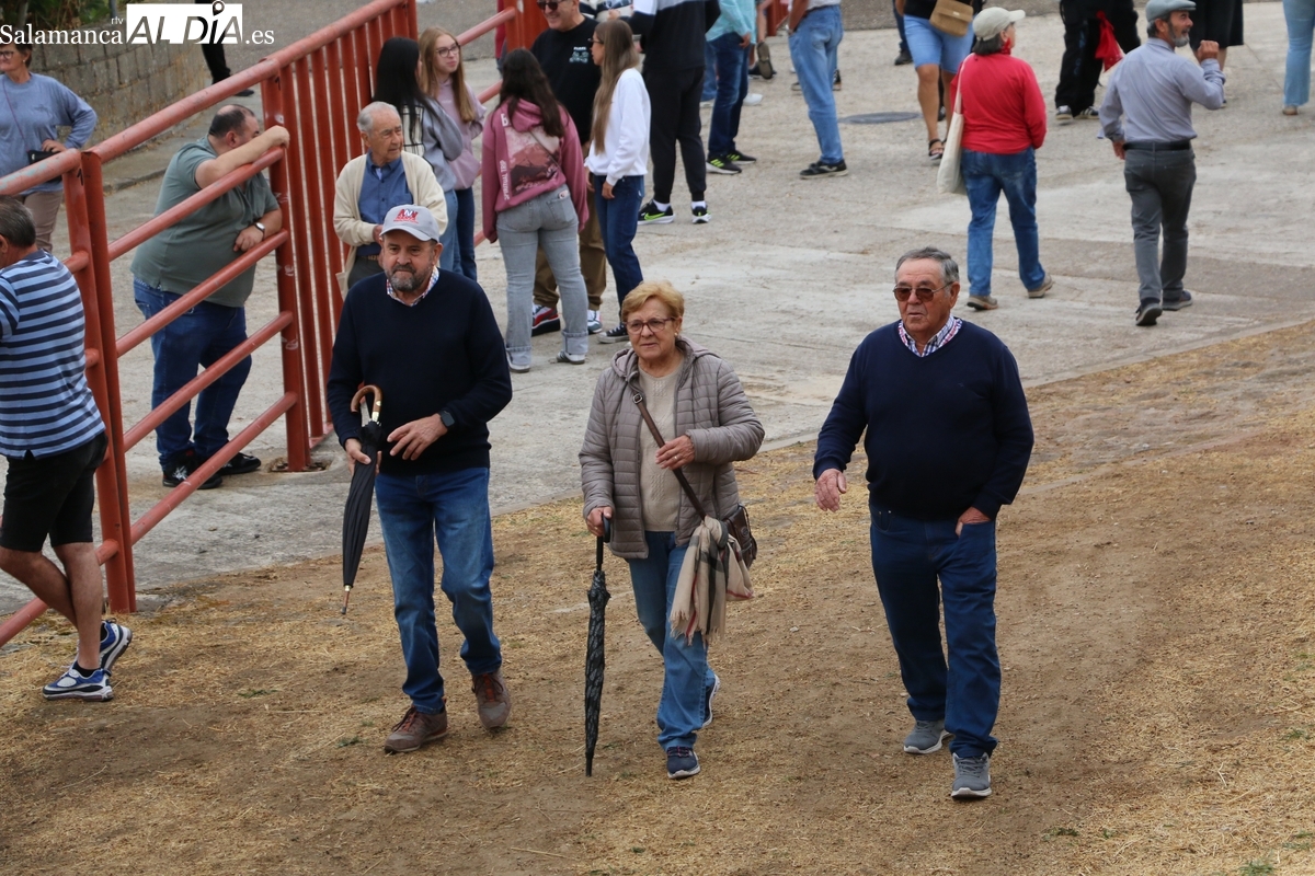 Con bastante público de localidades próximas, como Villarino y Aldeadávila, aunque también incluso de otras alejadas como el municipio zamorano de Fermoselle, de manera puntual salían de toriles los tres mansos para realizar el recorrido en sentido inverso hasta el camión. A continuación salían a la calle los dos primeros novillos, todos ellos de capa castaña.