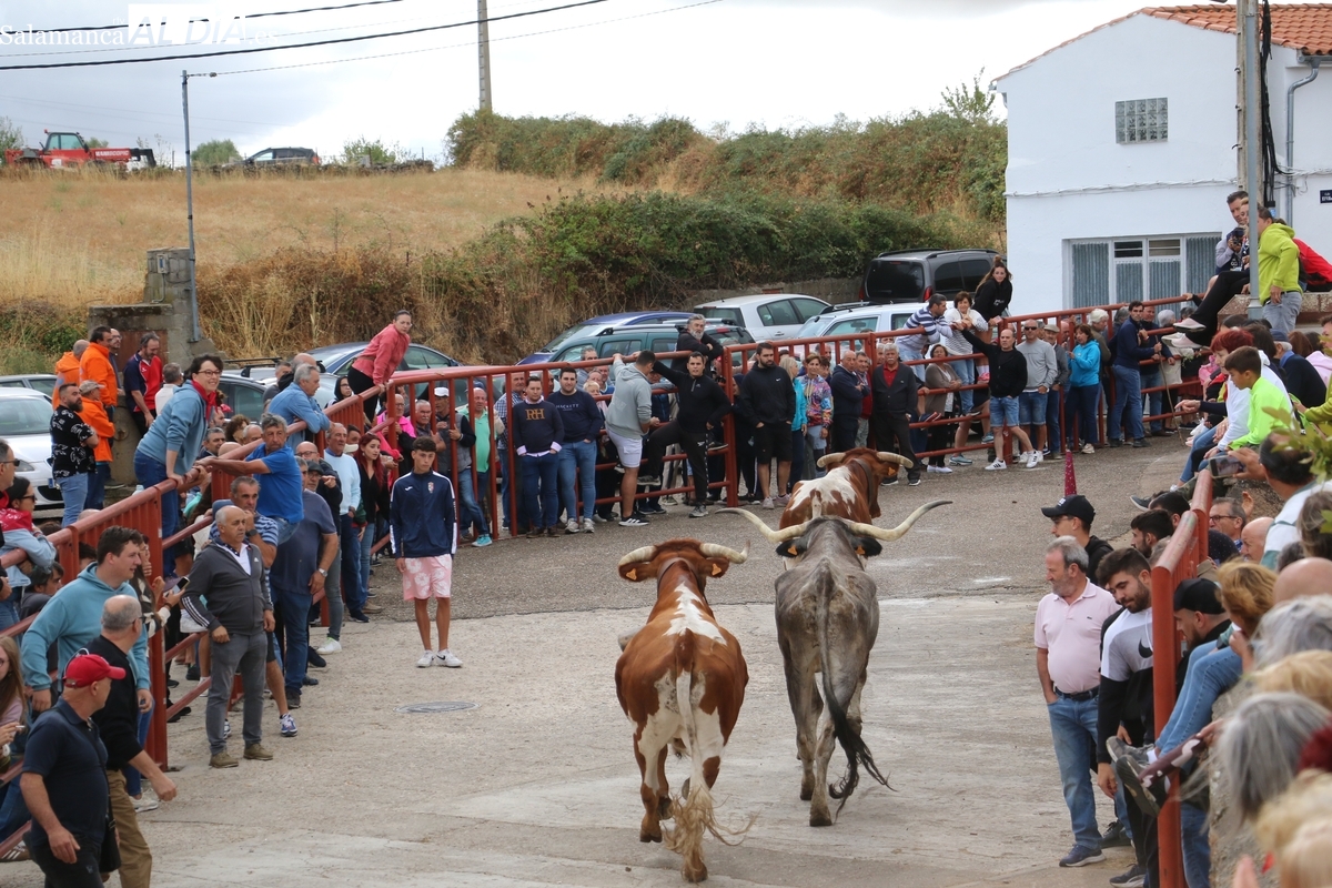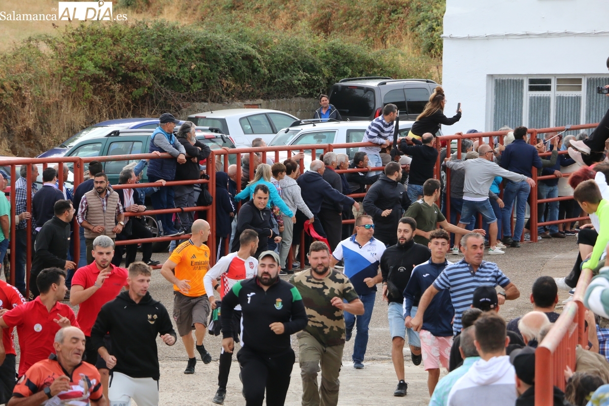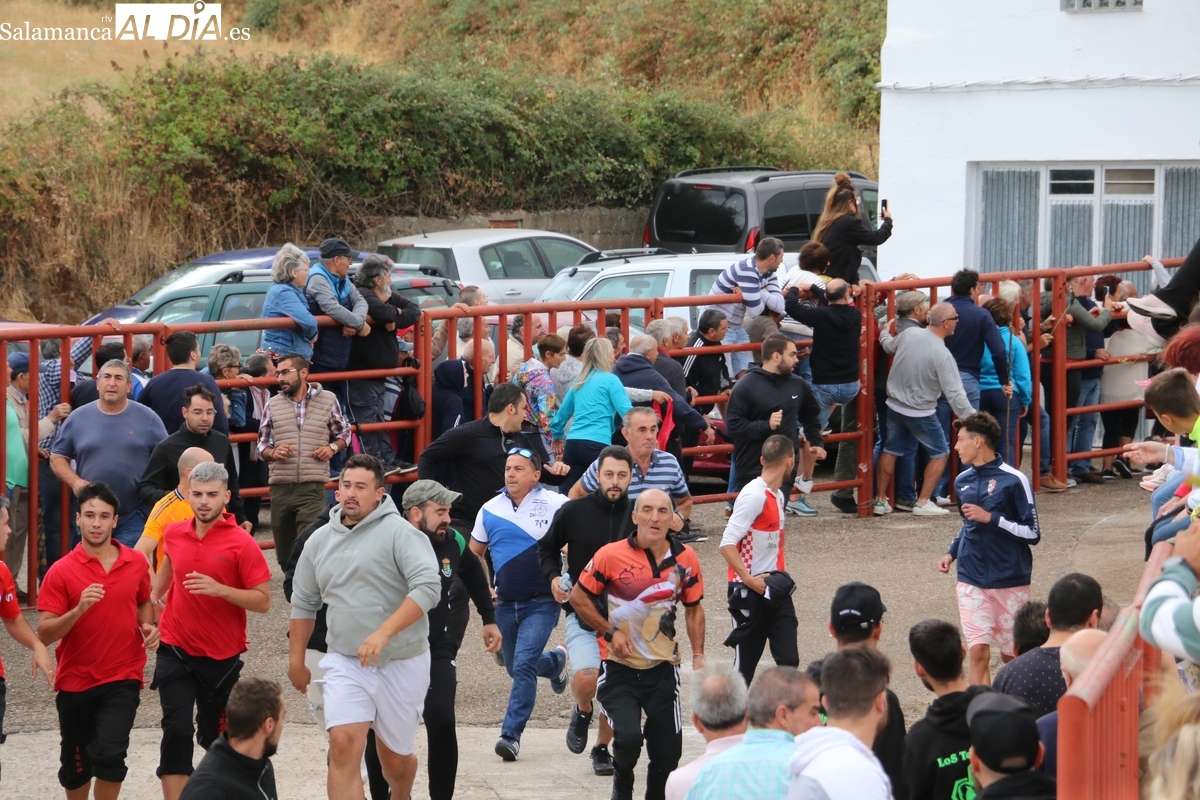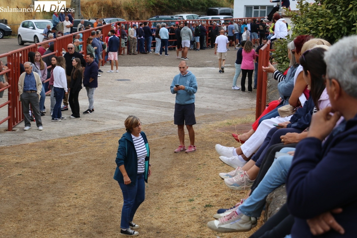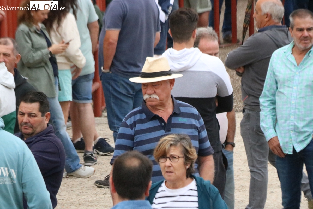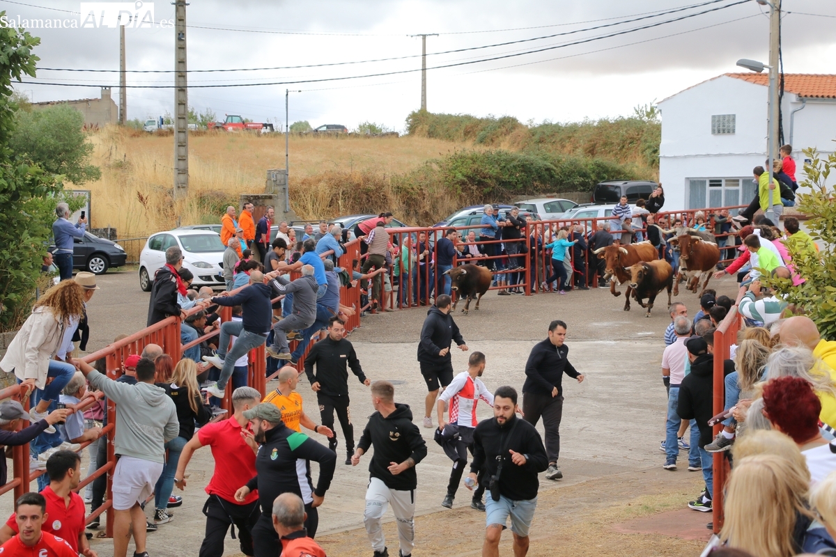 Con bastante público de localidades próximas, como Villarino y Aldeadávila, aunque también incluso de otras alejadas como el municipio zamorano de Fermoselle, de manera puntual salían de toriles los tres mansos para realizar el recorrido en sentido inverso hasta el camión. A continuación salían a la calle los dos primeros novillos, todos ellos de capa castaña.