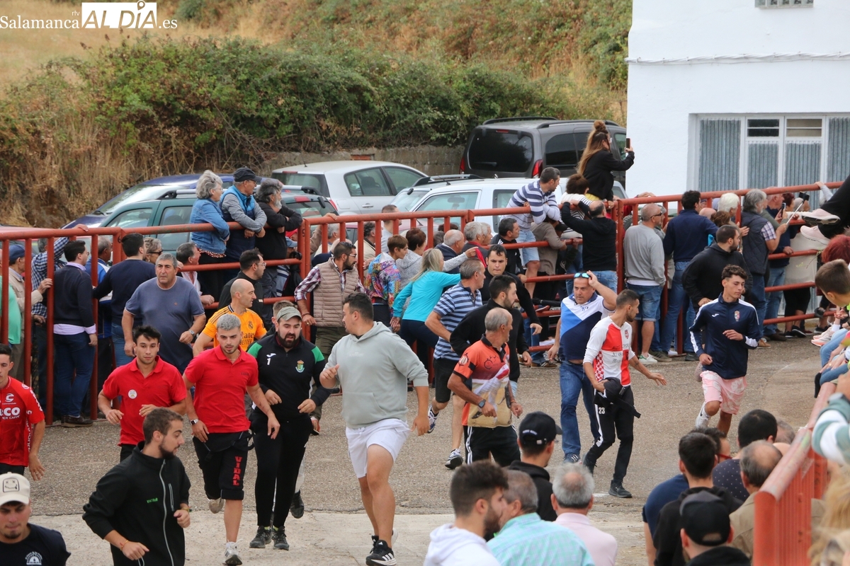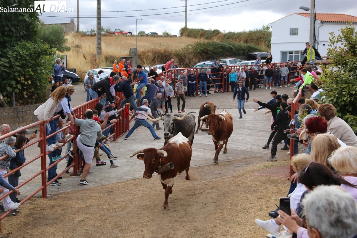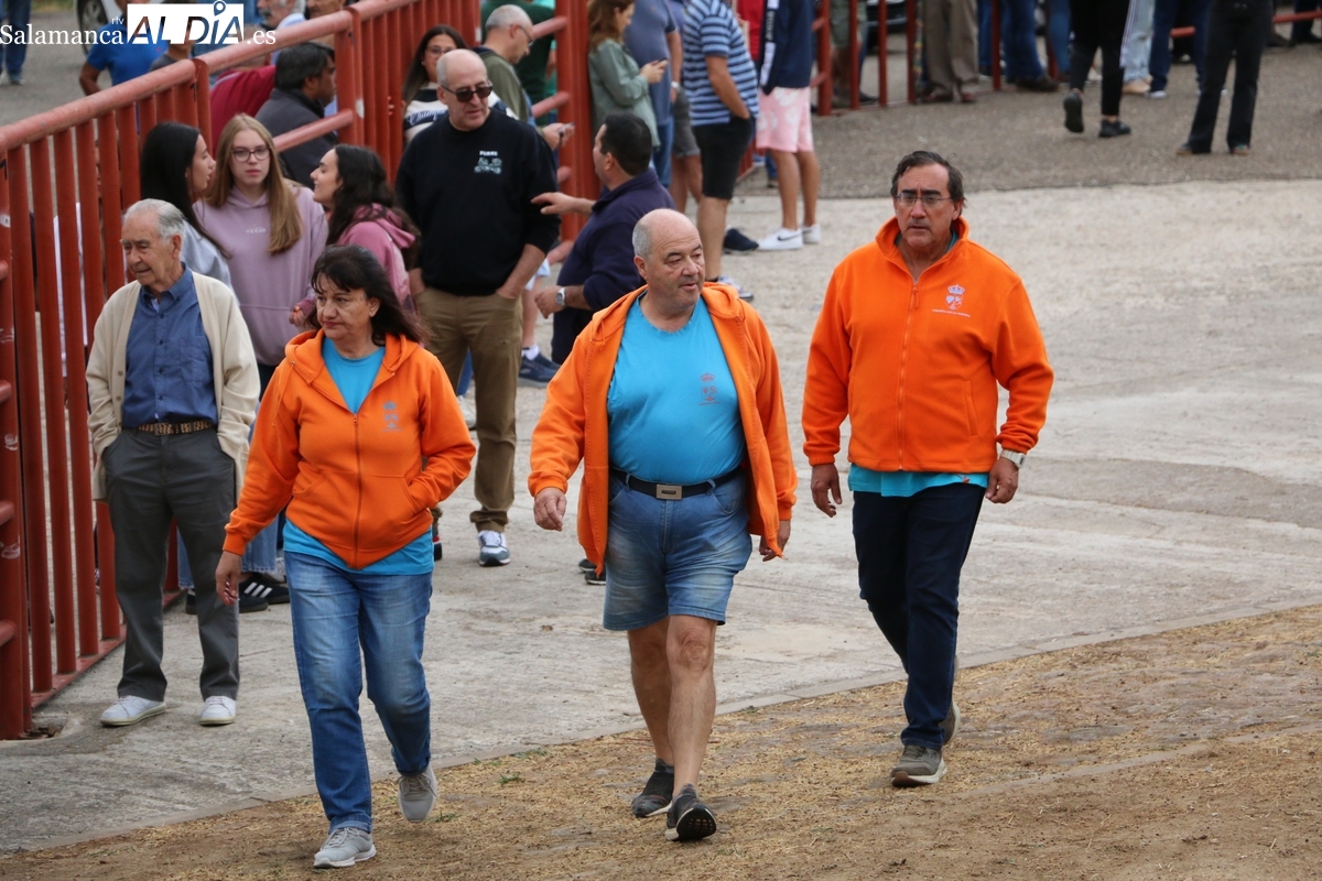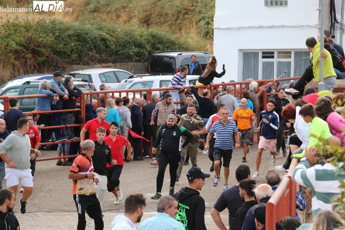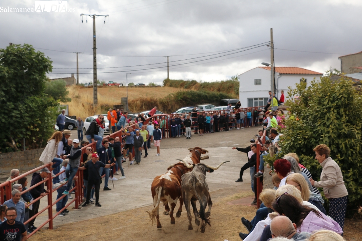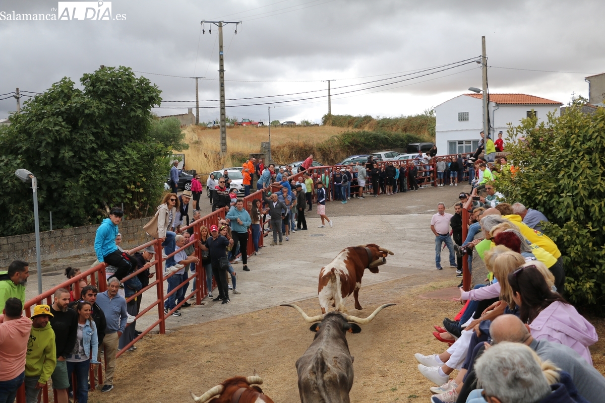 Con bastante público de localidades próximas, como Villarino y Aldeadávila, aunque también incluso de otras alejadas como el municipio zamorano de Fermoselle, de manera puntual salían de toriles los tres mansos para realizar el recorrido en sentido inverso hasta el camión. A continuación salían a la calle los dos primeros novillos, todos ellos de capa castaña.