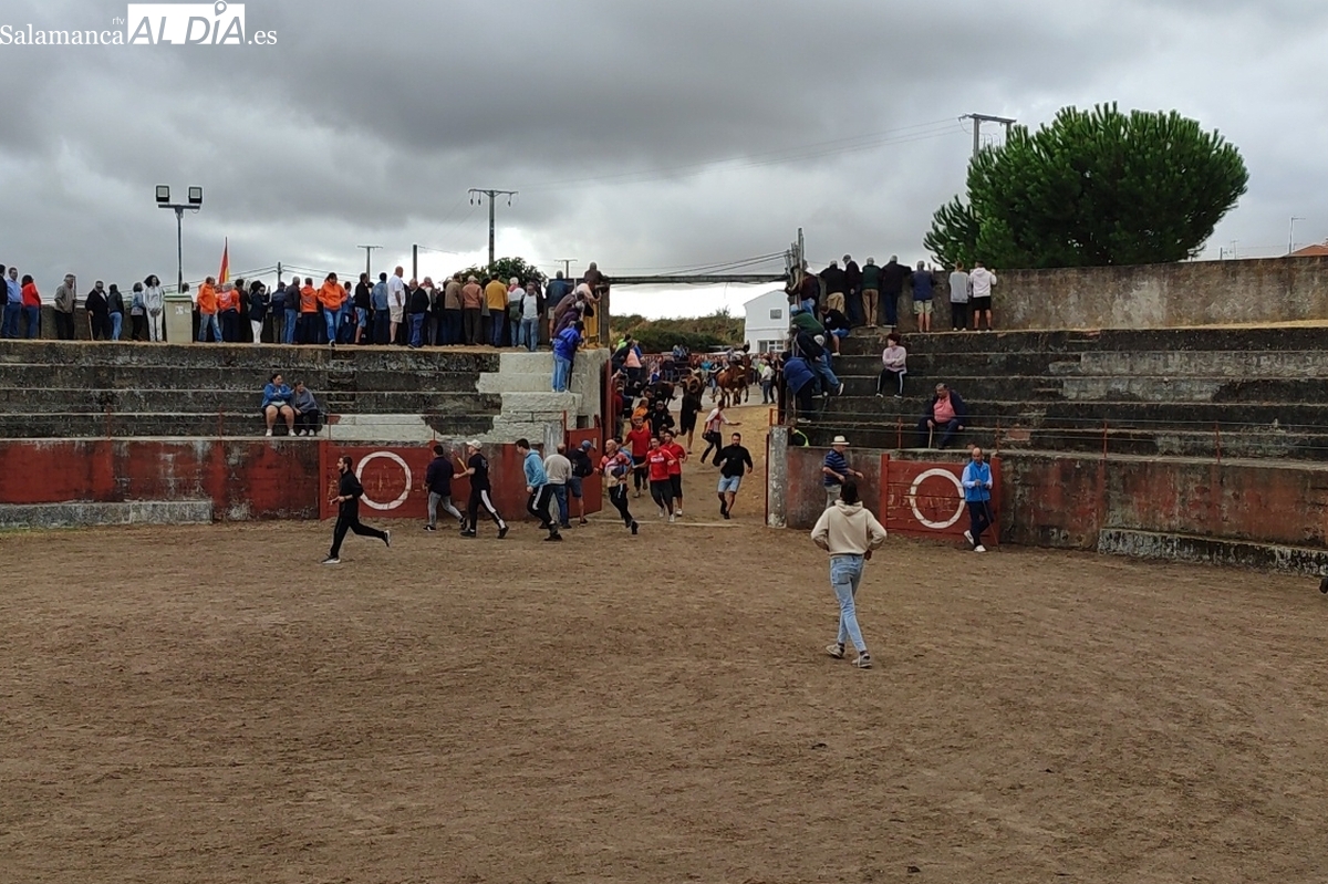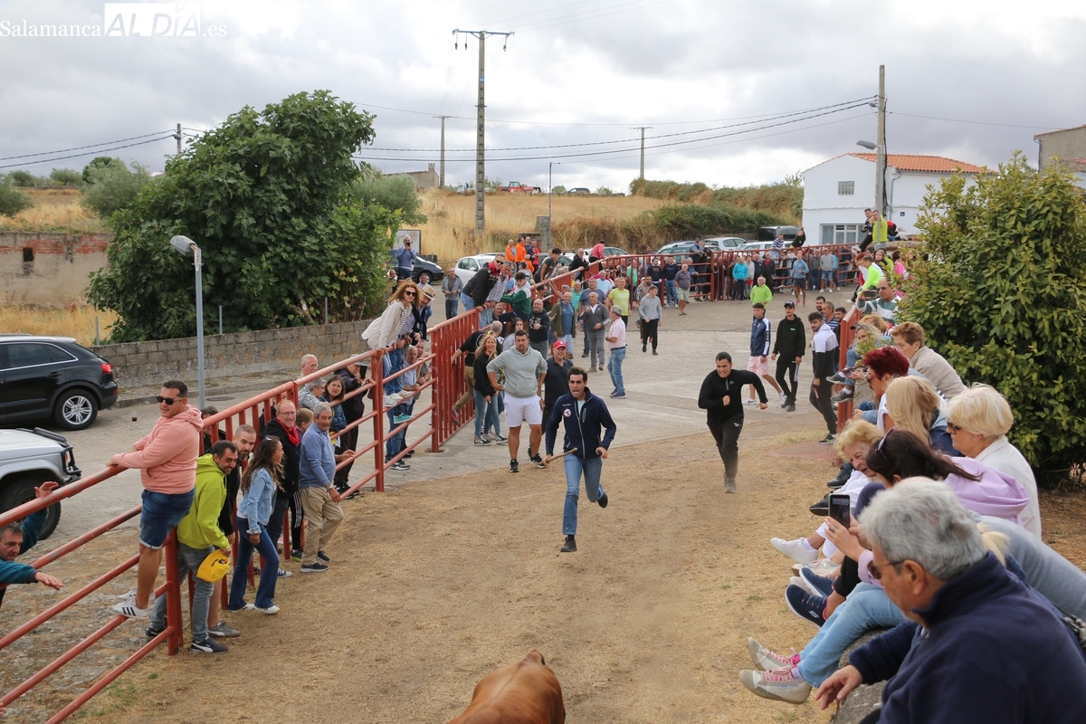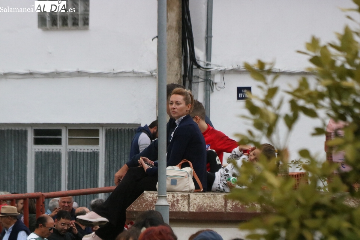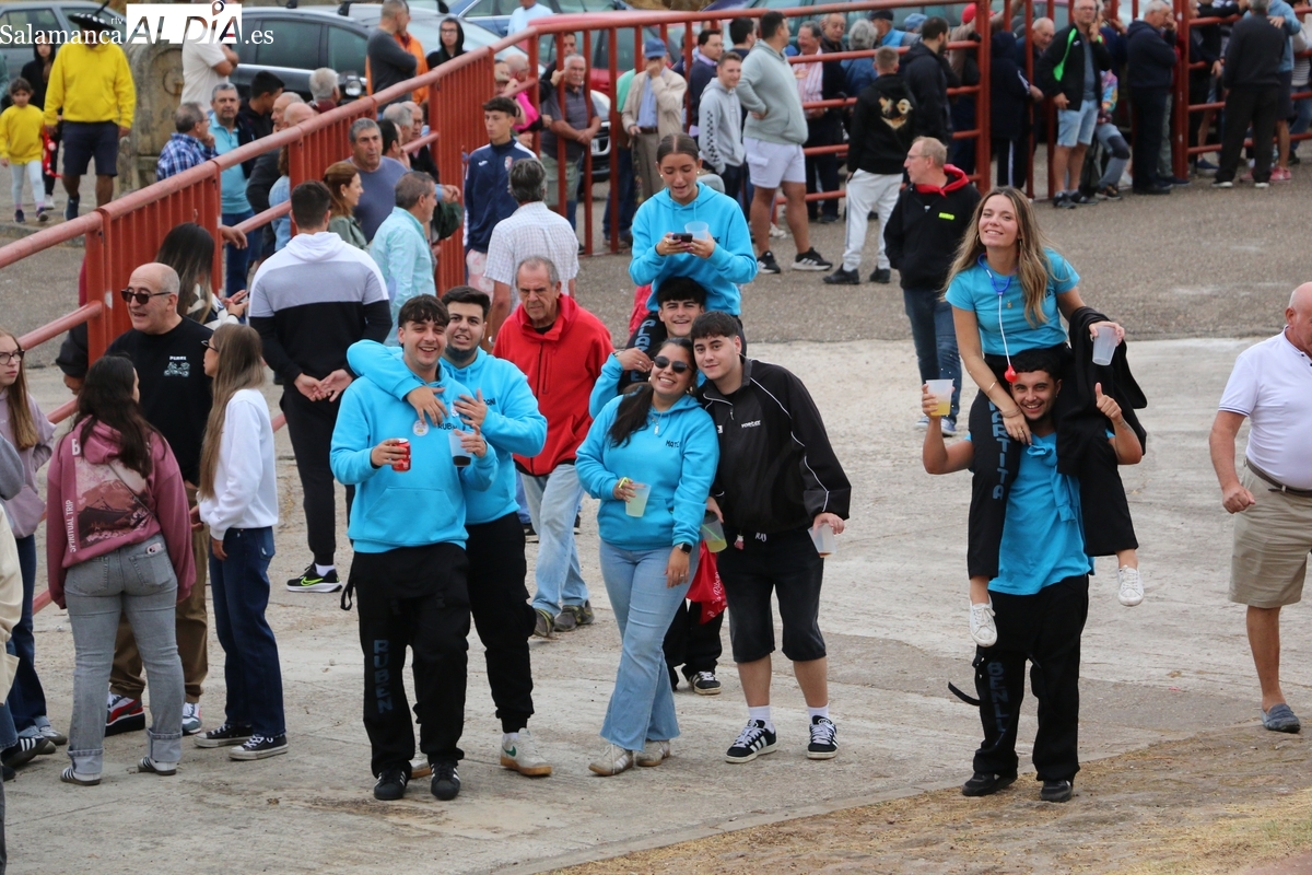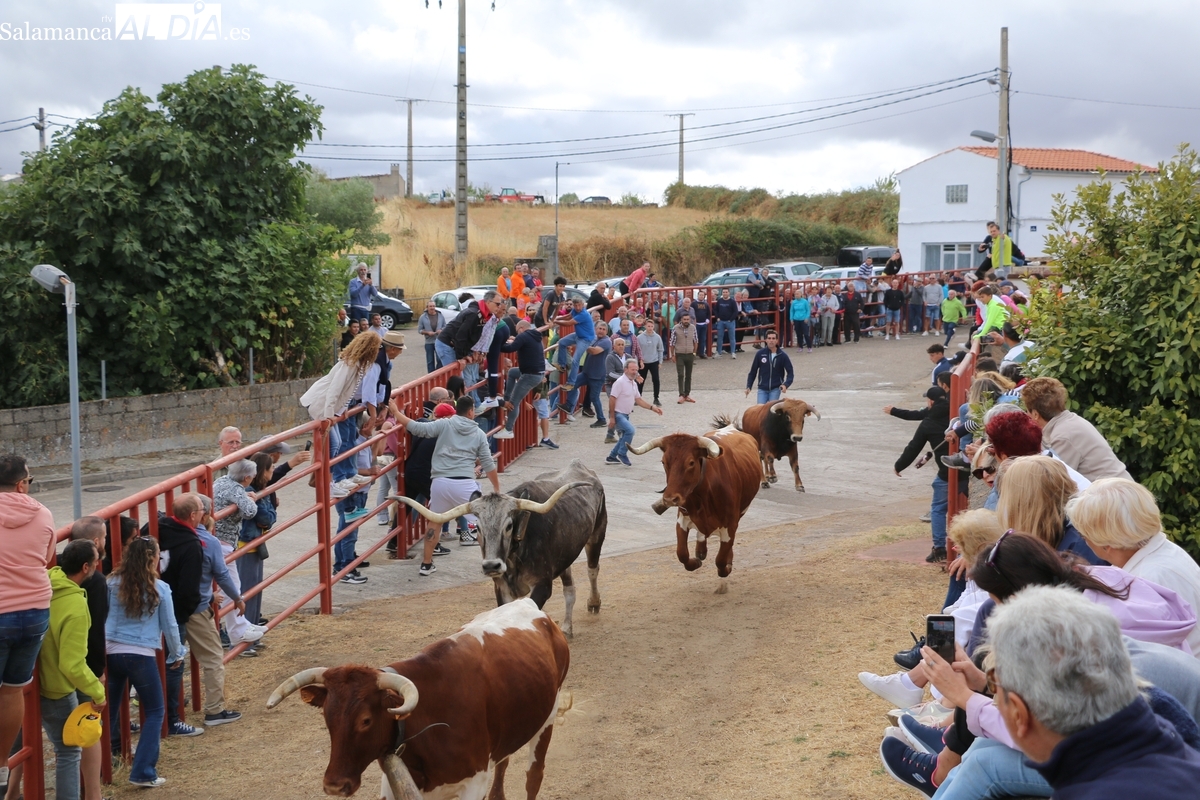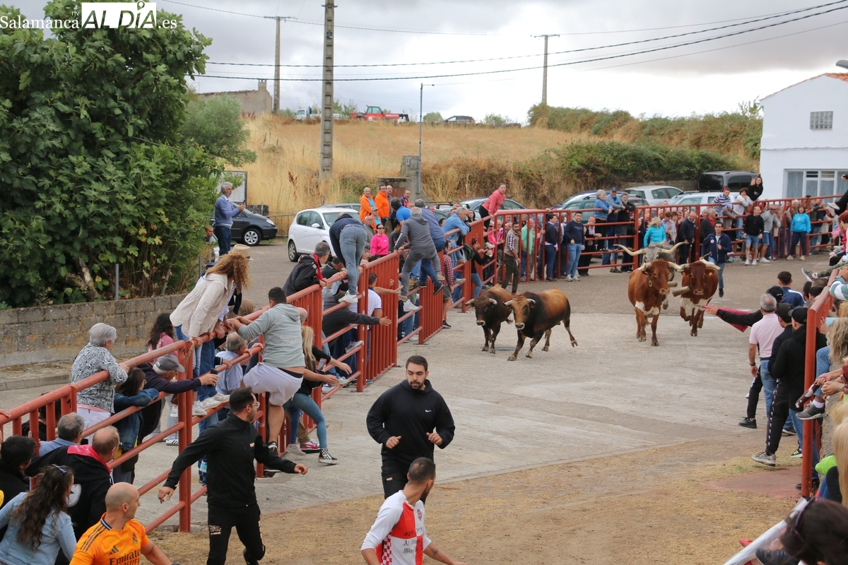 Con bastante público de localidades próximas, como Villarino y Aldeadávila, aunque también incluso de otras alejadas como el municipio zamorano de Fermoselle, de manera puntual salían de toriles los tres mansos para realizar el recorrido en sentido inverso hasta el camión. A continuación salían a la calle los dos primeros novillos, todos ellos de capa castaña.