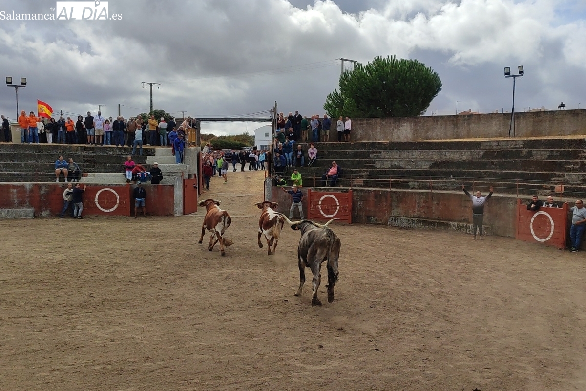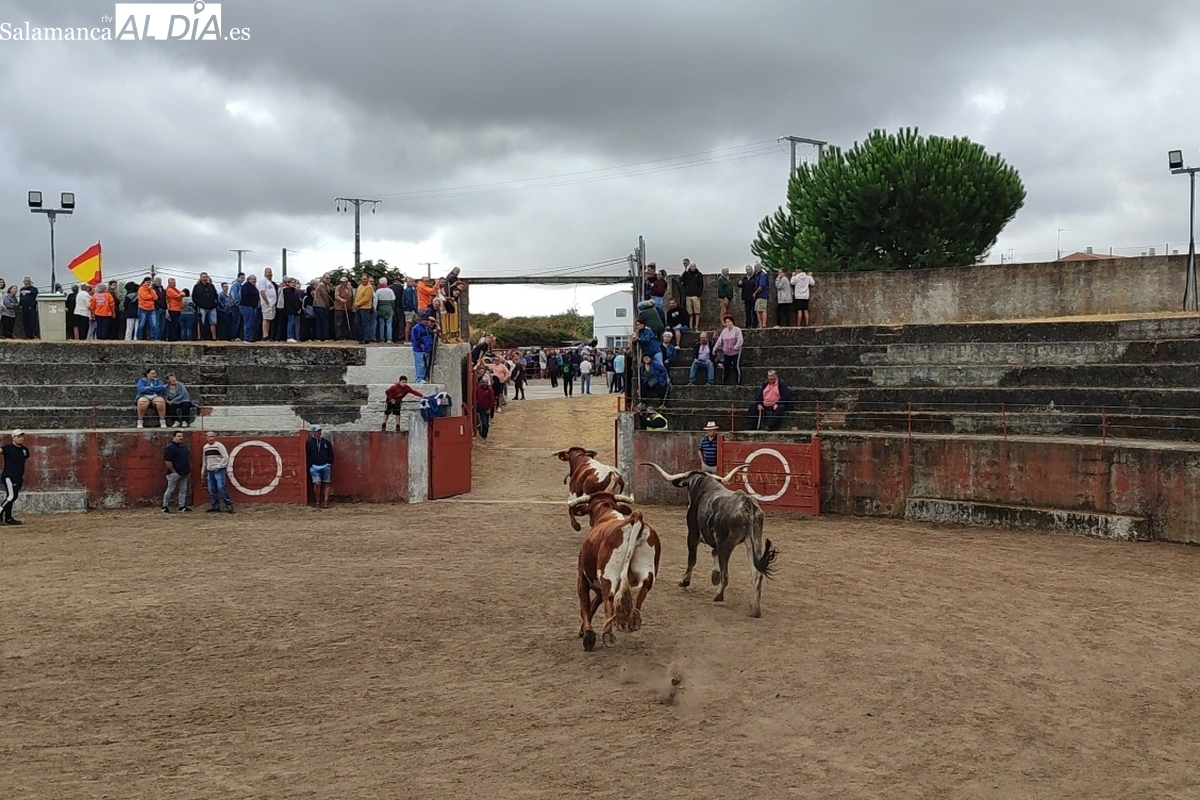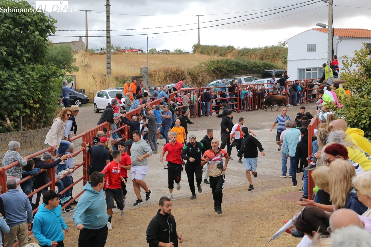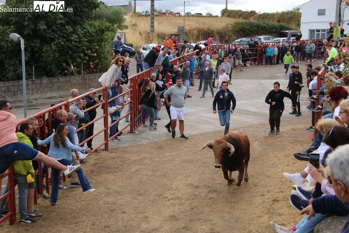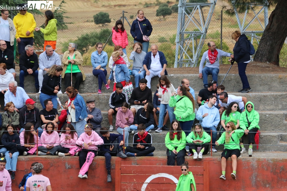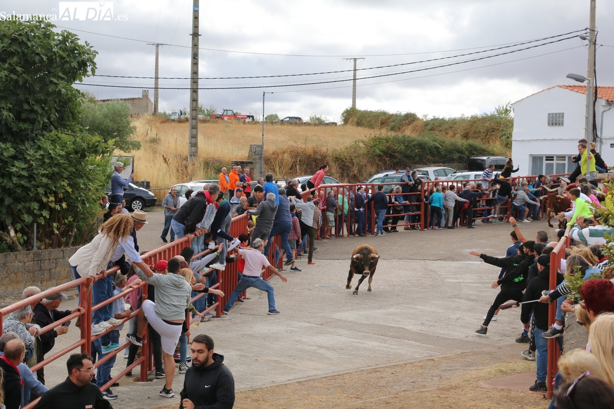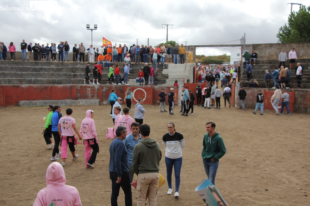 Con bastante público de localidades próximas, como Villarino y Aldeadávila, aunque también incluso de otras alejadas como el municipio zamorano de Fermoselle, de manera puntual salían de toriles los tres mansos para realizar el recorrido en sentido inverso hasta el camión. A continuación salían a la calle los dos primeros novillos, todos ellos de capa castaña.