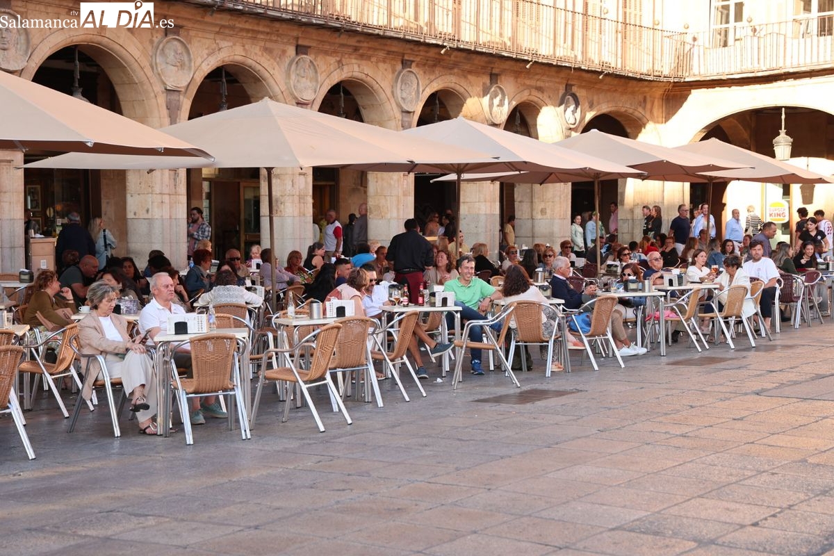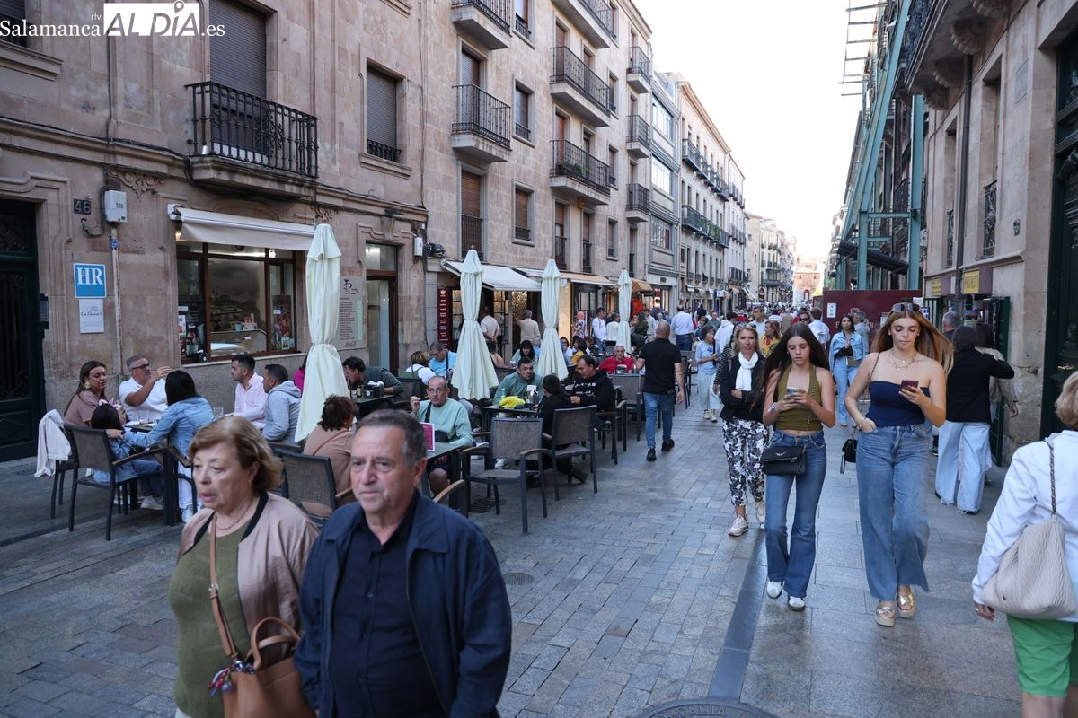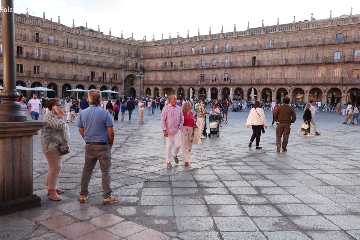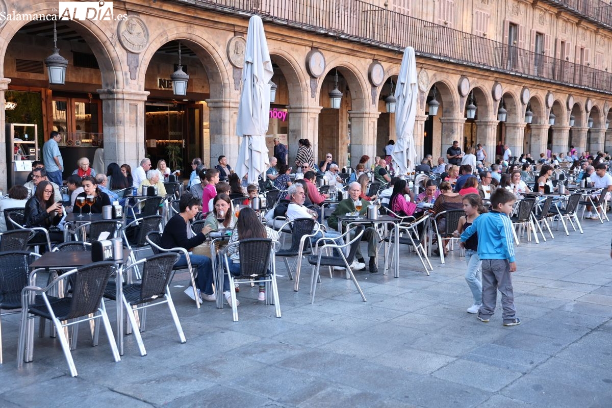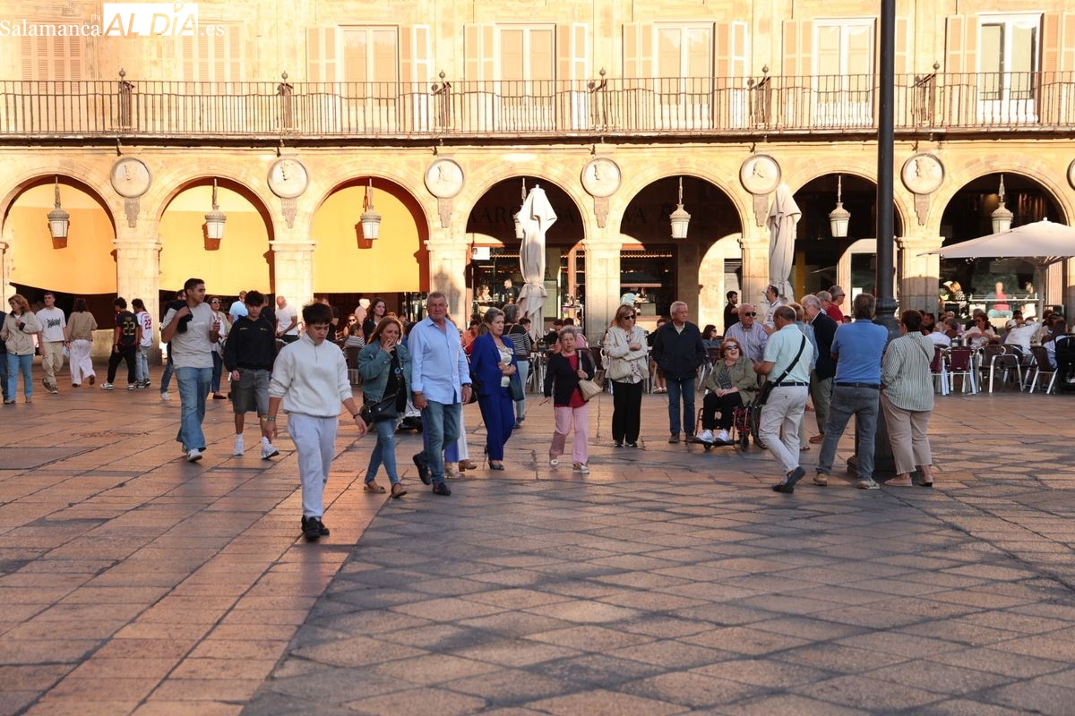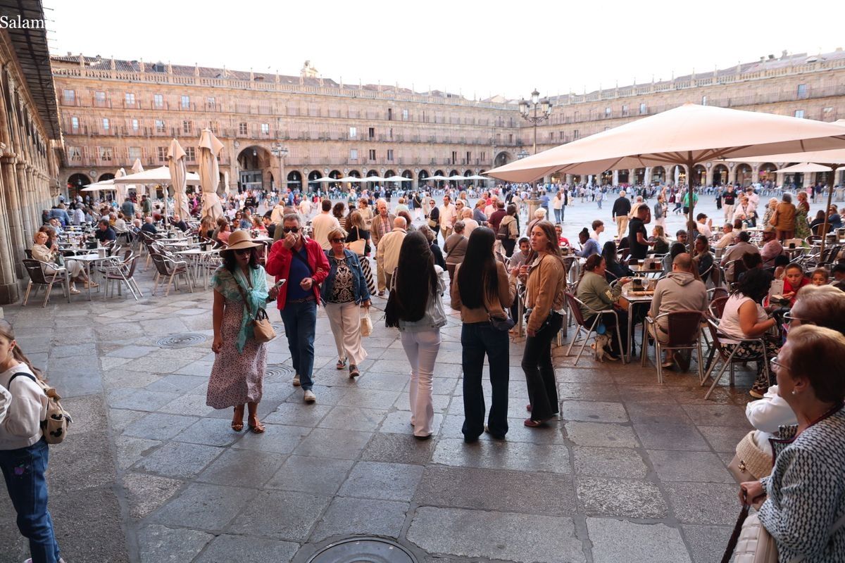 Desde primera hora de la tarde, las terrazas de la Plaza Mayor y las principales vías peatonales como la calle Toro o la Rúa Mayor han acogido a salmantinos y a los últimos turistas que apuran sus vacaciones. Sin embargo, el ambiente, aunque positivo, no ha alcanzado la intensidad de fines de semana anteriores.