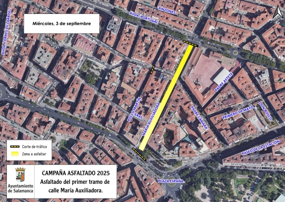 Mañana miércoles, 3 de septiembre, se producirán cortes de tráfico y desvíos en la calle María Auxiliadora, entre las avenidas de Portugal y Mirat, afectando al recorrido de las líneas de autobús 3 y 6, que se desviarán a través de la avenida de Portugal y el paseo de la Estación para retomar su recorrido habitual hacia la Plaza de España o hacia la avenida de Federico Anaya en función del sentido de circulación.