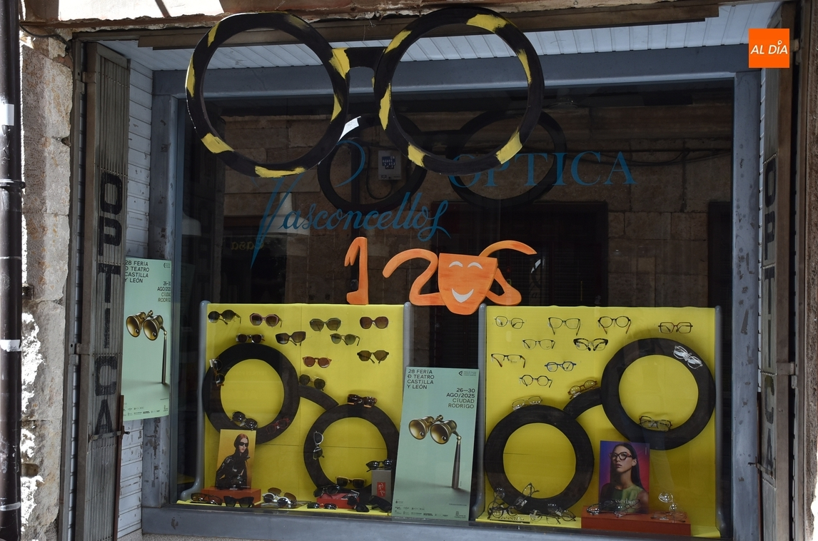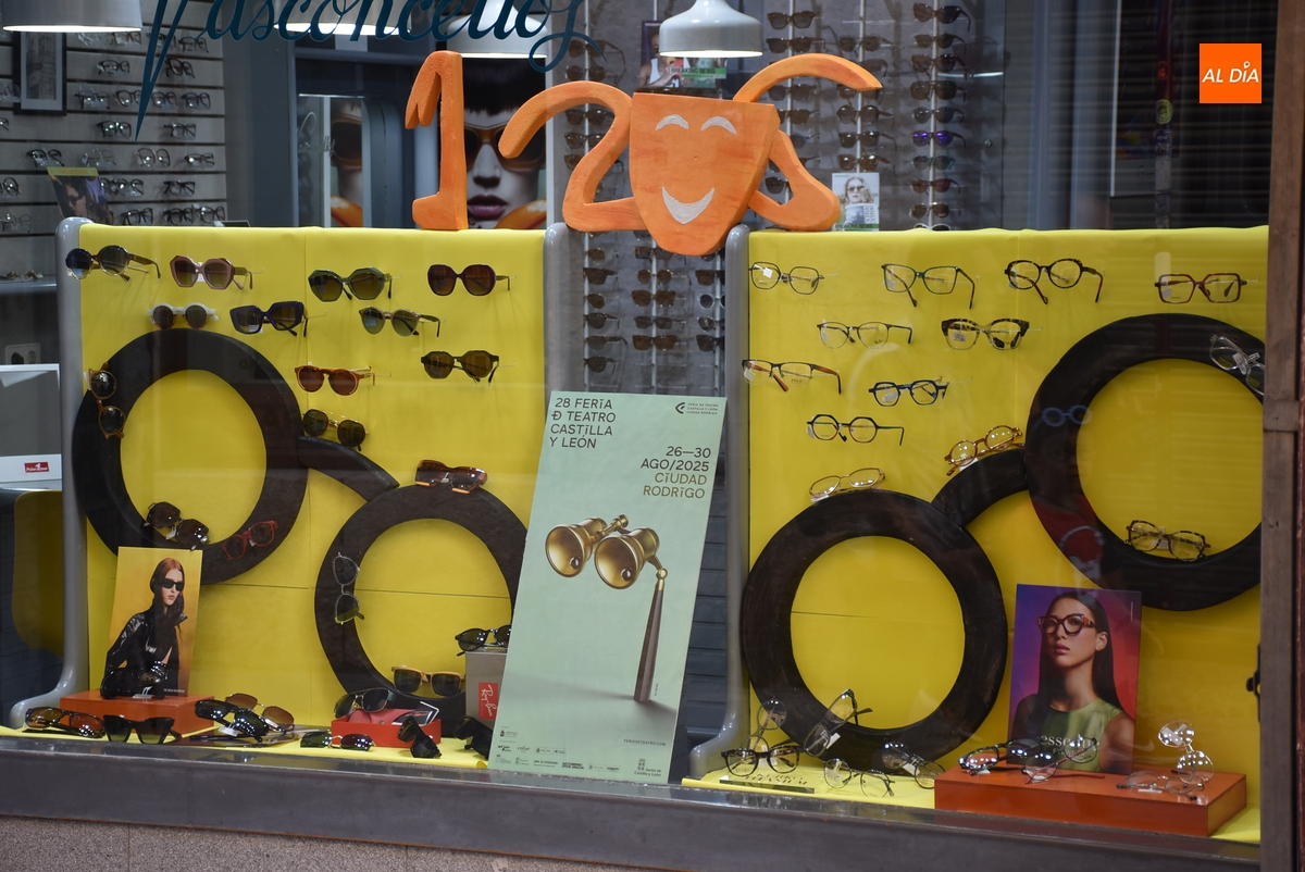 La Óptica Vasconcellos de Ciudad Rodrigo se sumó durante la semana pasada al espíritu de la Feria de Teatro de Castilla y León con un llamativo elemento decorativo en su fachada al hilo de la temática del propio negocio.