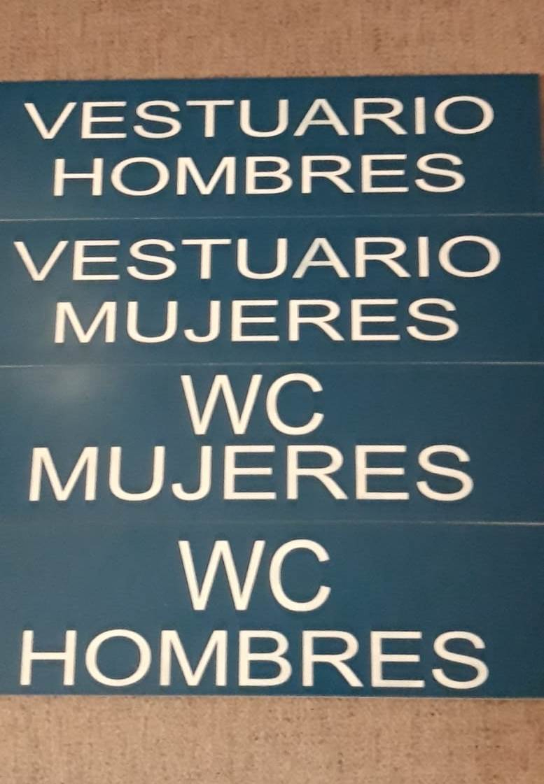 Un usuario coloca rótulos para acabar con las confusiones en los aseos-vestuarios de El Picón
