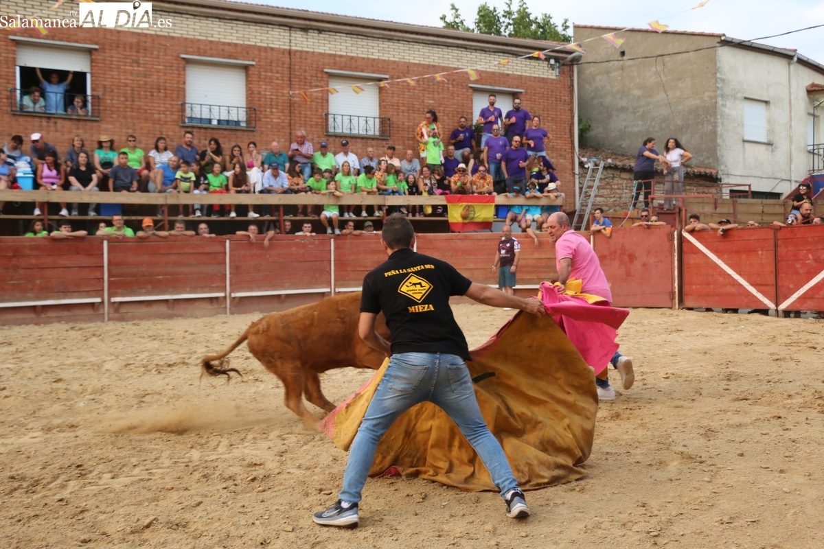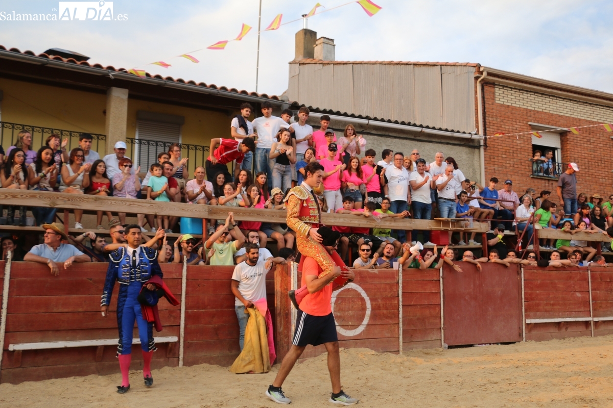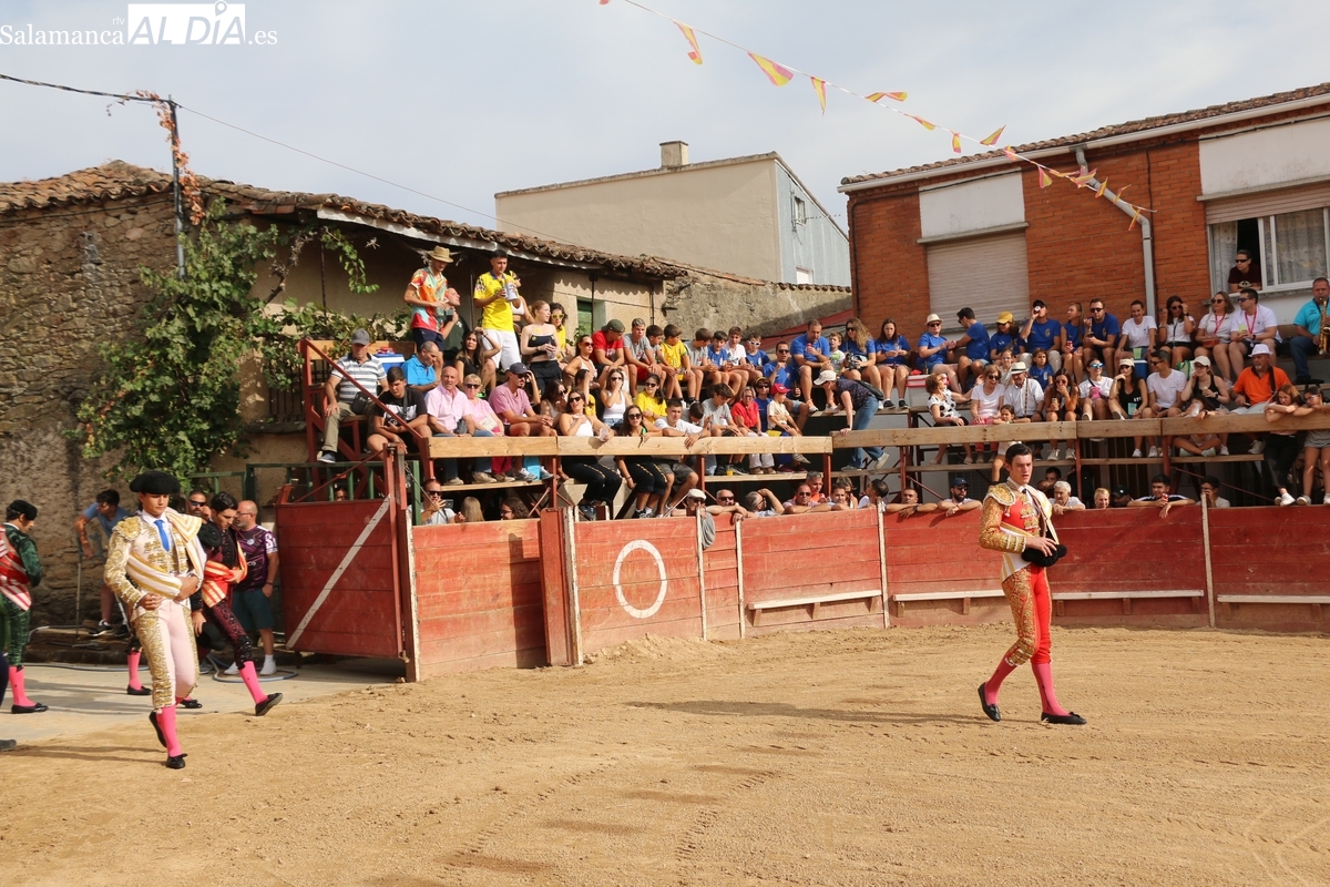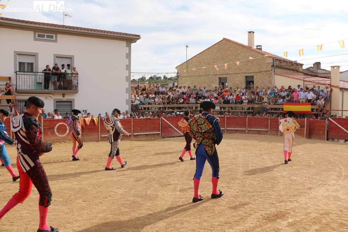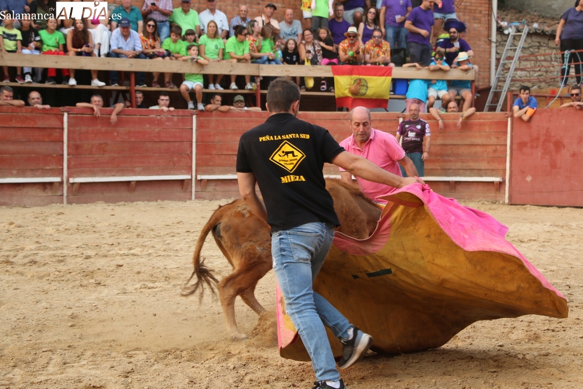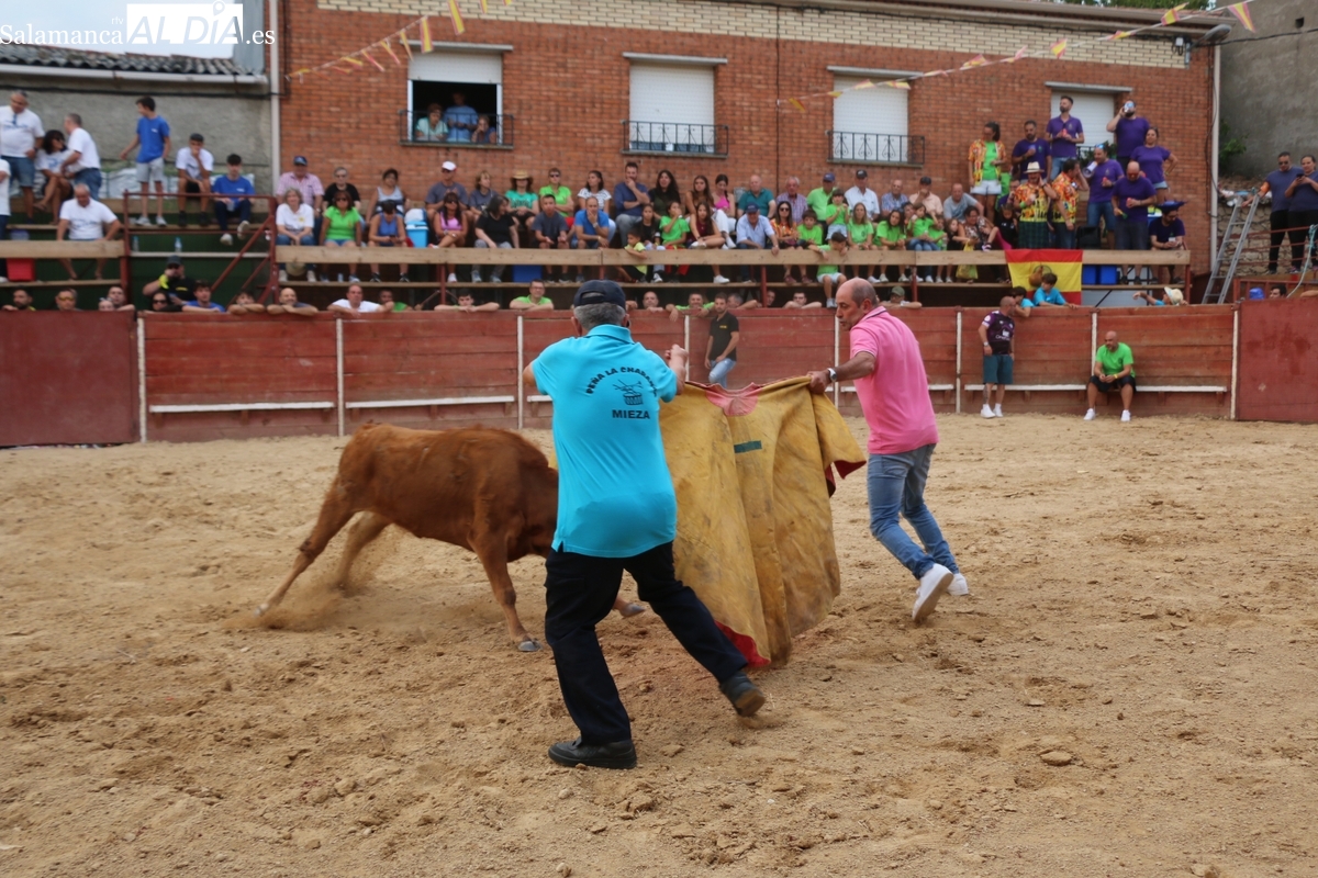 Intensa tarde taurina la que se ha vivido este sábado en Mieza con motivo de sus fiestas de las Madrinas en honor a la Virgen del Árbol, y en la que se celebró una novillada con la actuación de los alumnos de la Escuela de Tauromaquia de Salamanca, Emilio García Torres y Noel García, además de una divertida capea para disfrute de los aficionados.