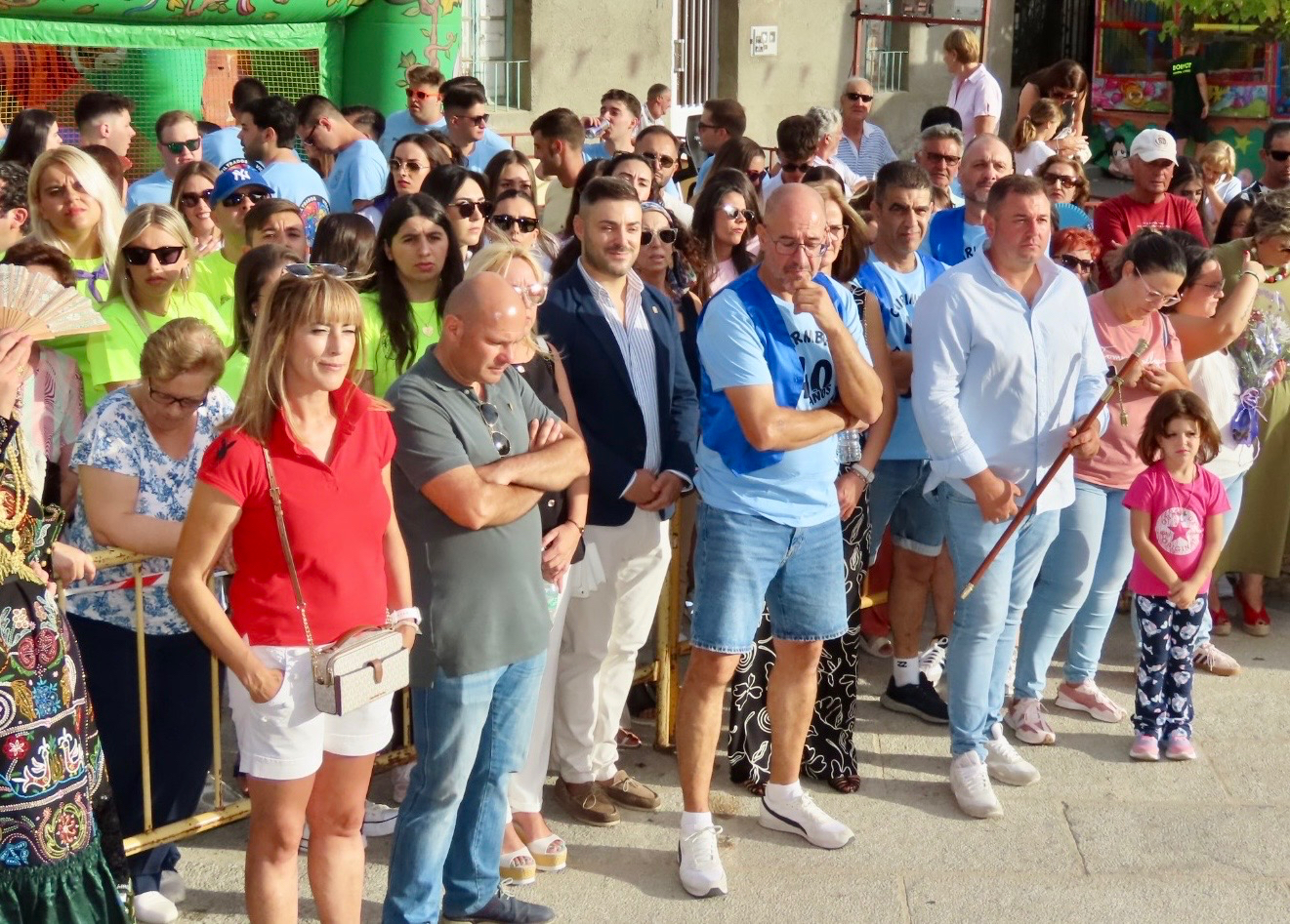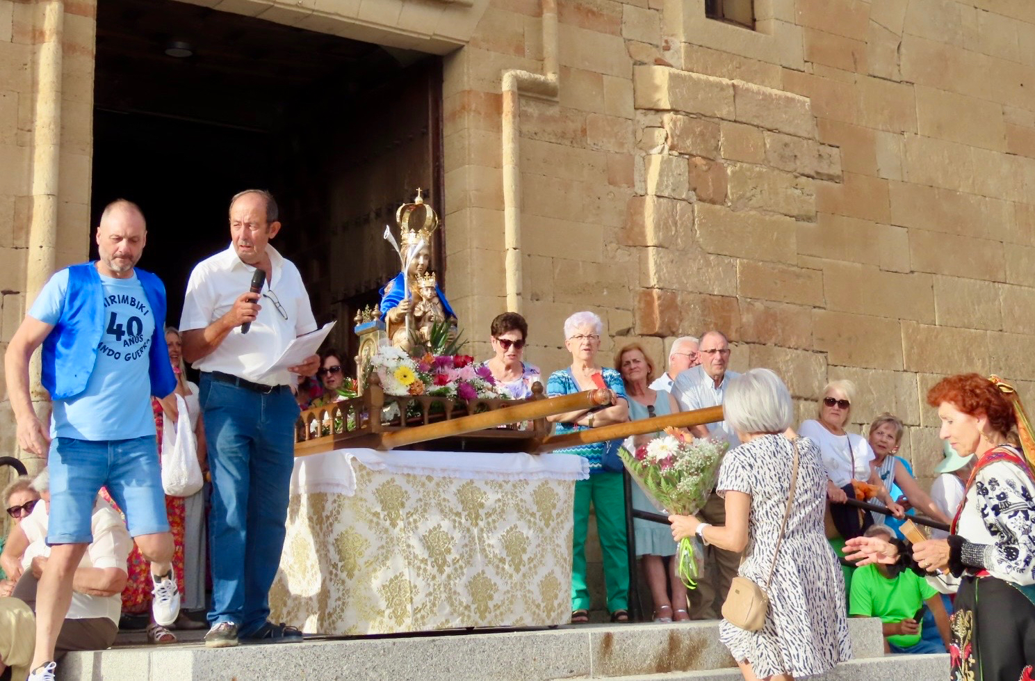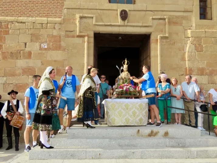 La segunda gran cita de la tarde se vivía en la iglesia parroquial, donde un año más ha tenido lugar la multitudinaria e histórica ofrenda floral a la Virgen de la Vega. La patrona, presidiendo los accesos al templo, ha recibido un año más el masivo cariño de los villorejos, algo transformado en flores que ya la arropan.