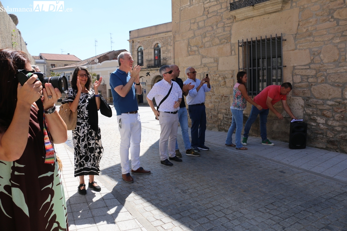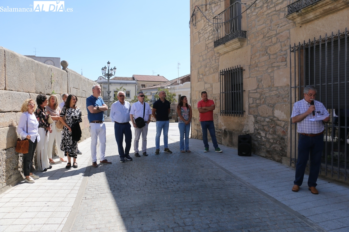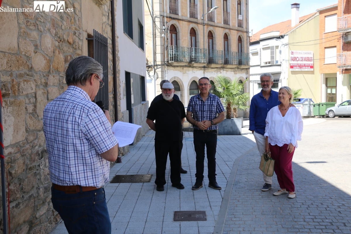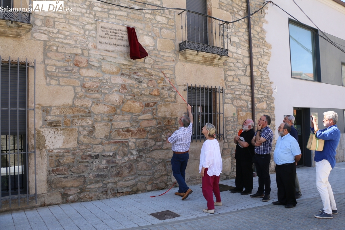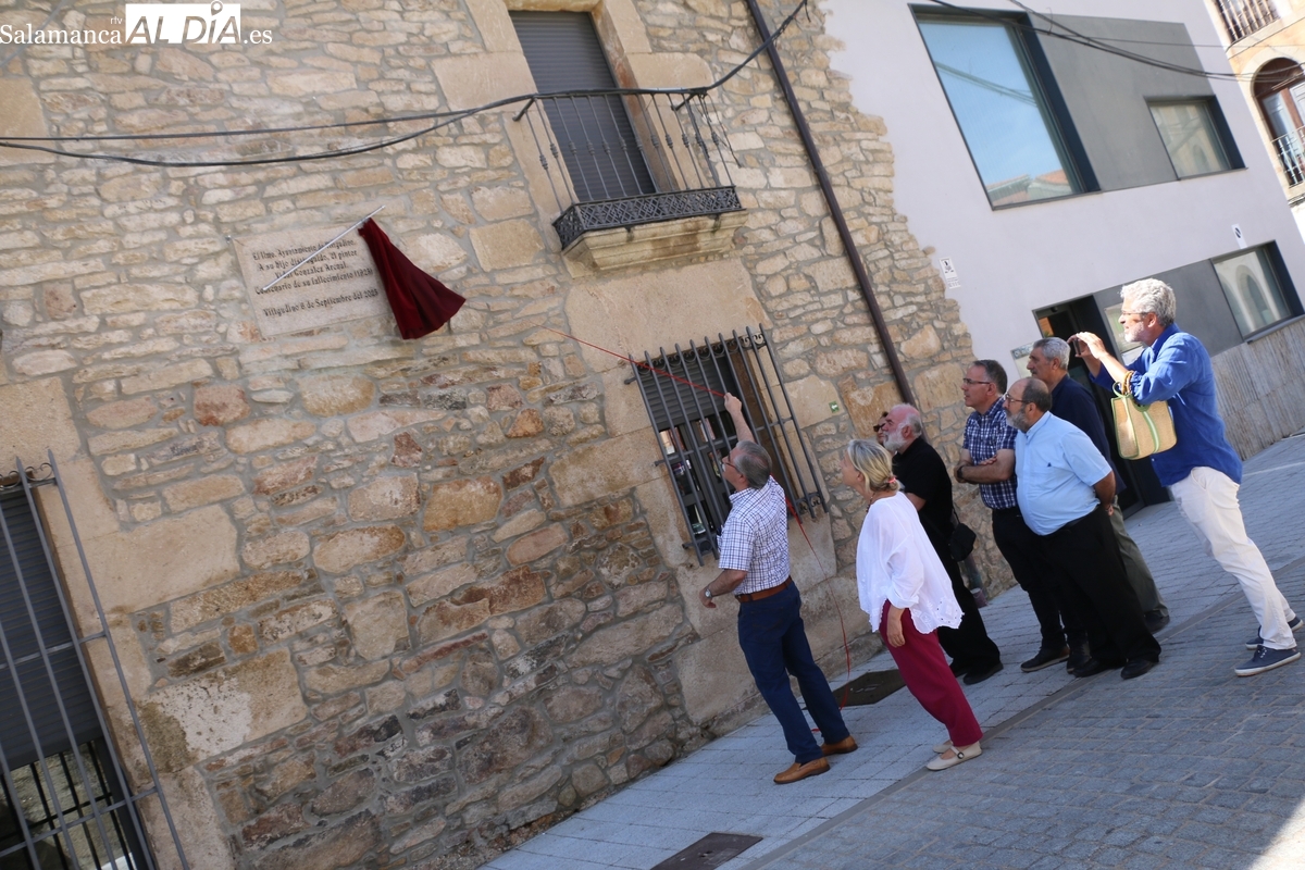Tras el acto en la iglesia, la comitiva se ha trasladado a la Plaza de España, donde el teniente de alcalde, José Antonio Pérez Blanco, ha pronunciado un discurso antes de descubrir la placa. Ha recordado que Vitigudino ya reconoció a su ilustre vecino hace 100 años, tras su muerte, al nominar la calle de la fachada principal de la Casa Consistorial con su nombre. Pérez Blanco ha resaltado la "dimensión humana de su persona", forjada en sus vivencias en Vitigudino y Guadramiro, y su faceta de entrega desinteresada, especialmente en su labor docente en la Escuela de San Eloy de Salamanca, que acogía a "niños de origen humilde". "Su lema era: todo pensionado debe sacrificarse por el pueblo que le ha ayudado. Sin duda, él lo practicó", ha concluido emocionado.