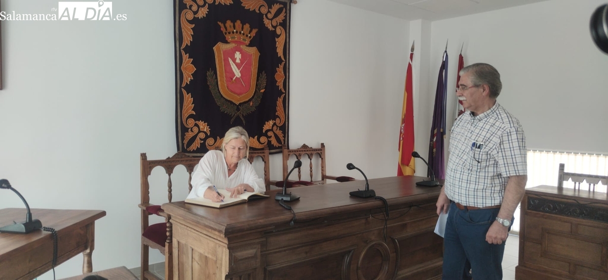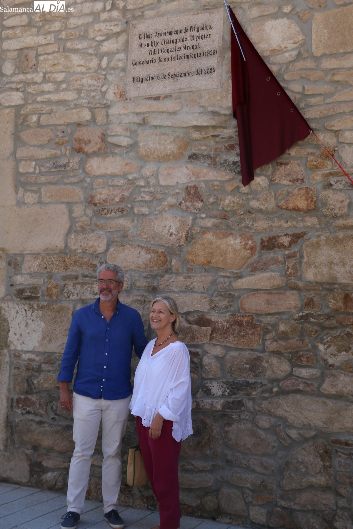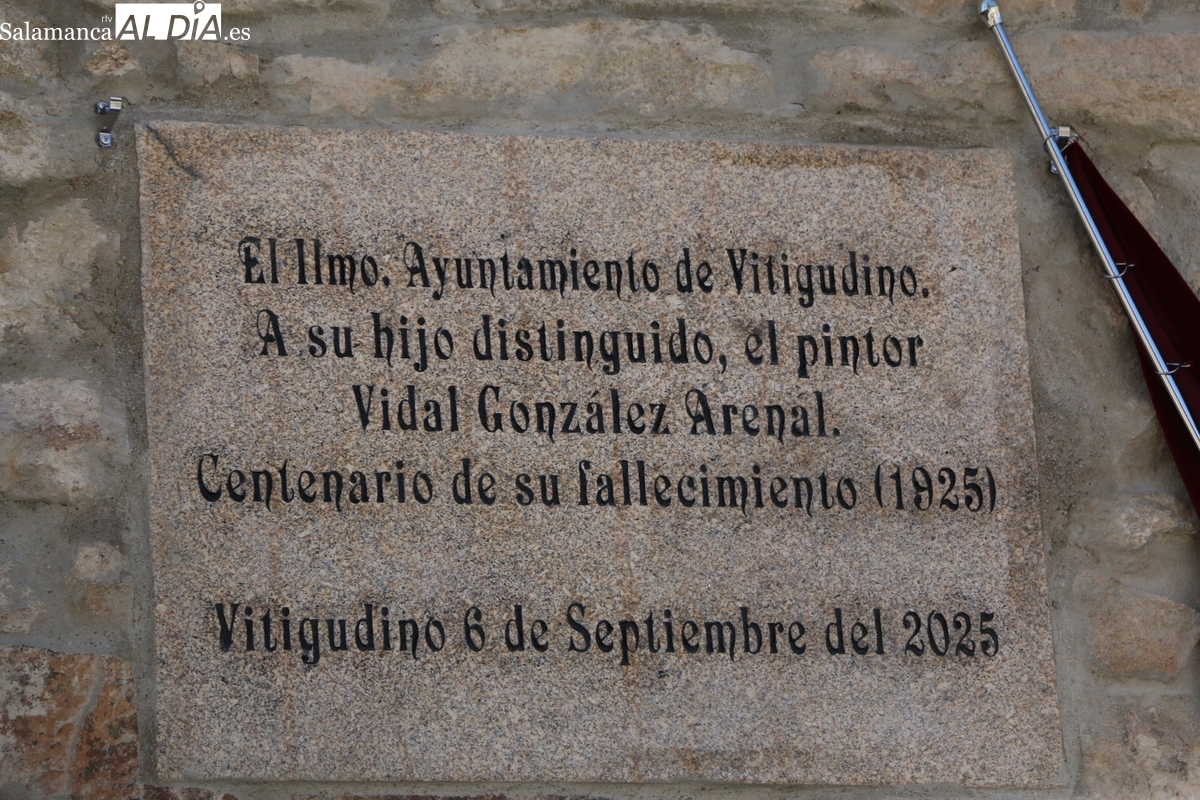 Finalizada el descubrimiento de la placa, en la que reza: "El Ilmo. Ayuntamiento de Vitigudino, a su hijo distinguido, el pintor Vidal González Arenal, por el centenario de su fallecimiento (1925). Vitigudino, 6 de septiembre de 2025", la representante de la familia, Marta García, estampó su firma en el libro de visitas del Ayuntamiento.