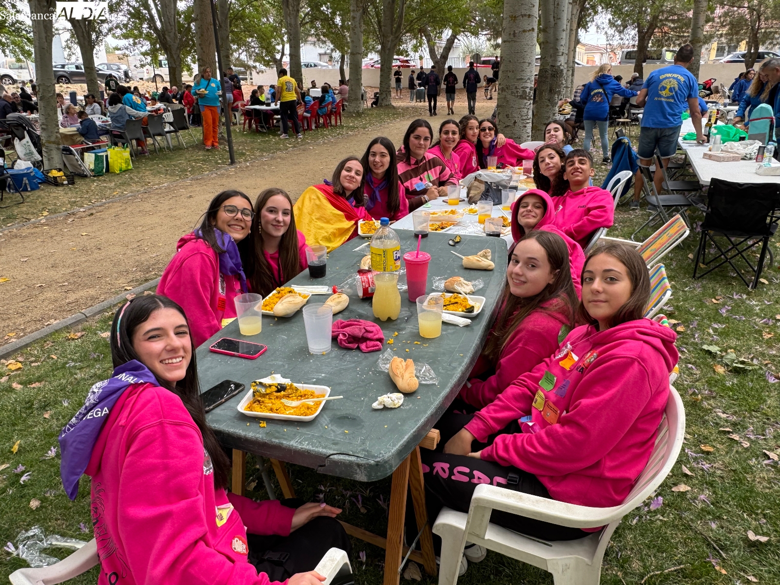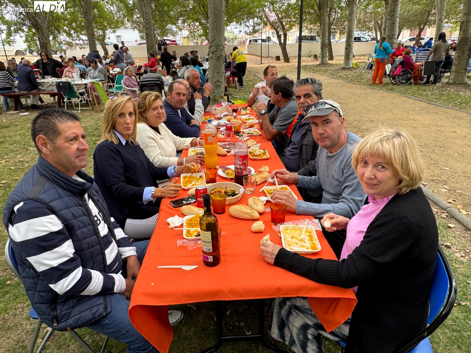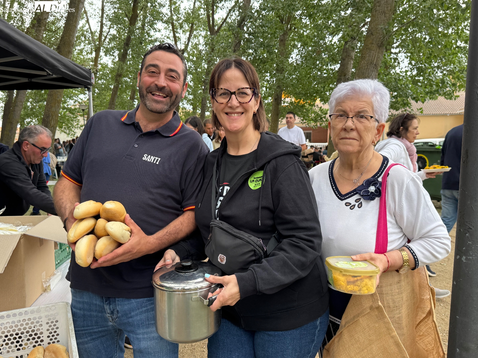 Desde las dos y media de la tarde comenzaban a formarse largas colas en la carpa y las mesas en las que se han ido disponiendo los platos de paella, acompañados por bebida y pan. Ya con ello en la mano, los villorejos se han organizado en mesas y sillas de campo, ocupando todo el recinto, que se llenaba de vida y ambiente en este tradicional acto.