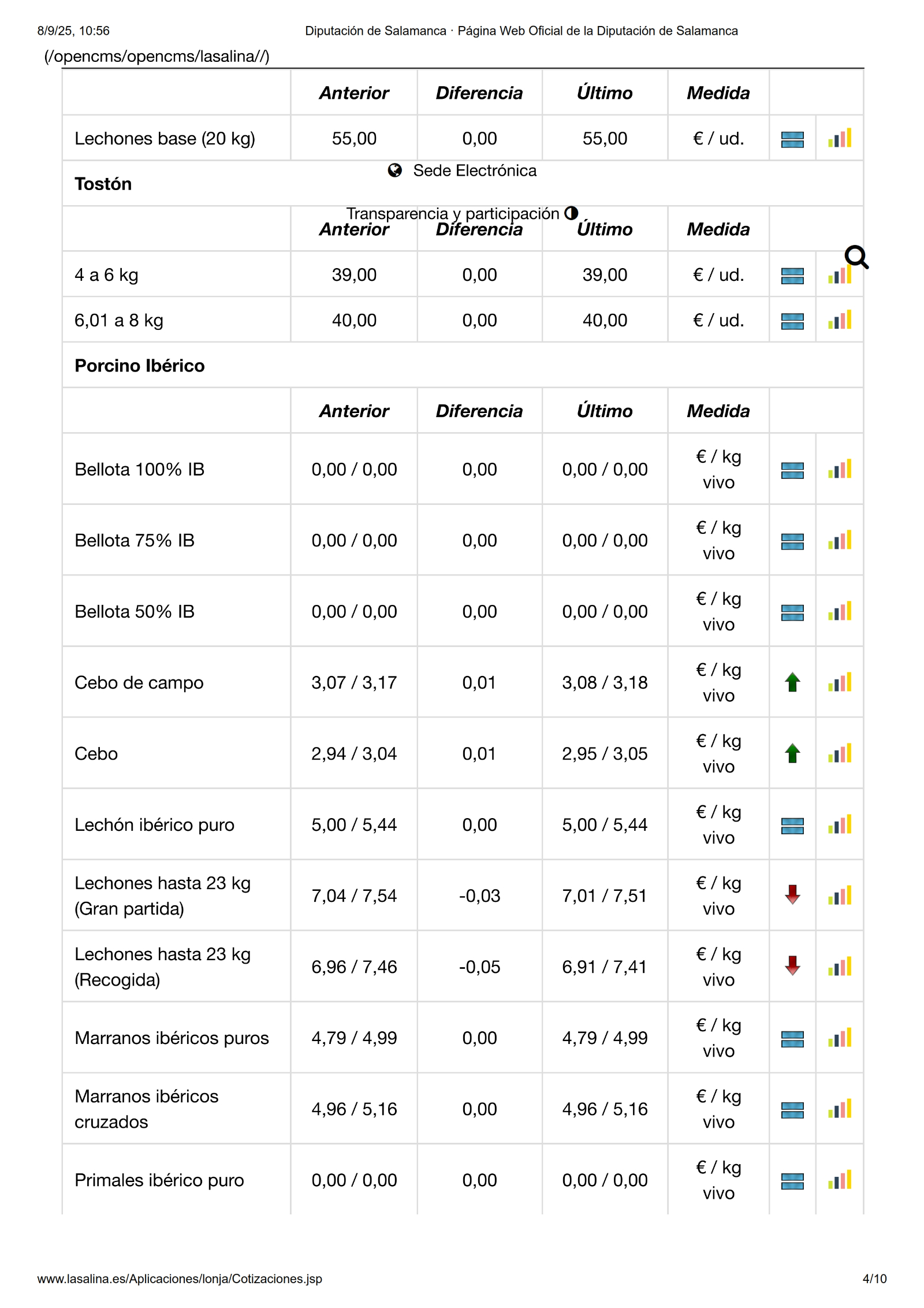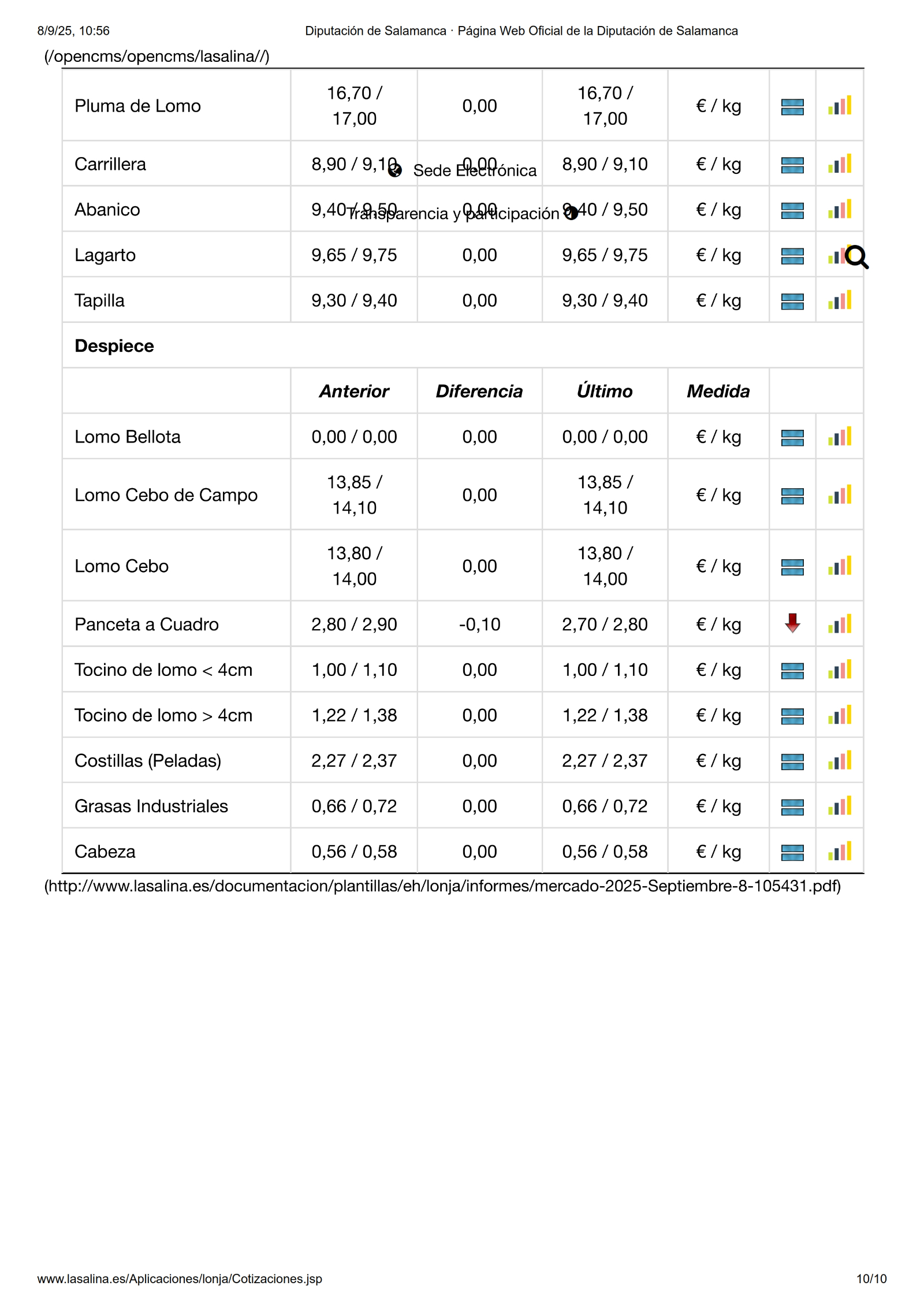 Por último, en la Mesa de despiece de ibérico, jamones y paletas en sangre de cebo y paletas de cebo de campo, suben 0,01 €/kg. Al contrario, el magro extra cae -0,15 €/kg por -0,10 €/kg la panceta a cuadro.