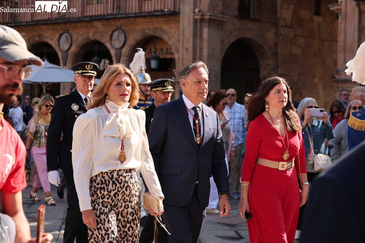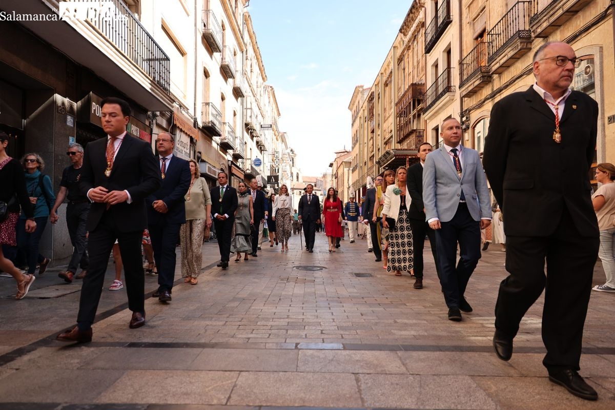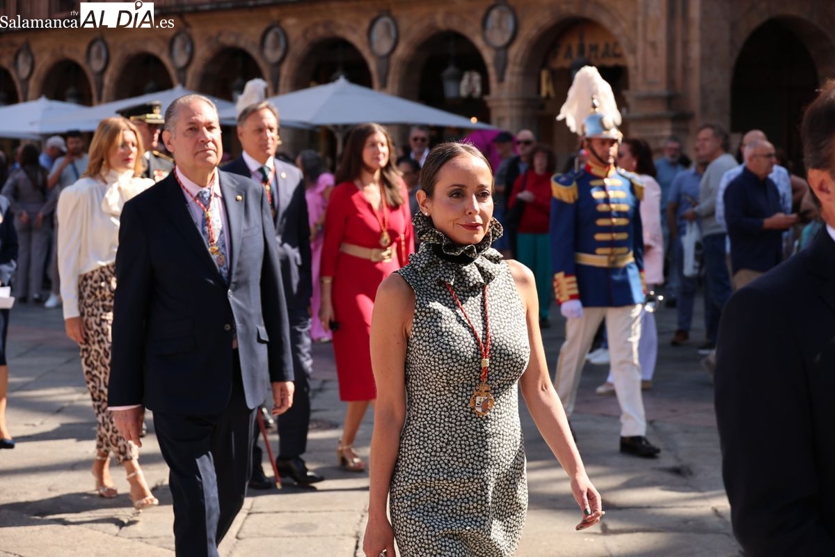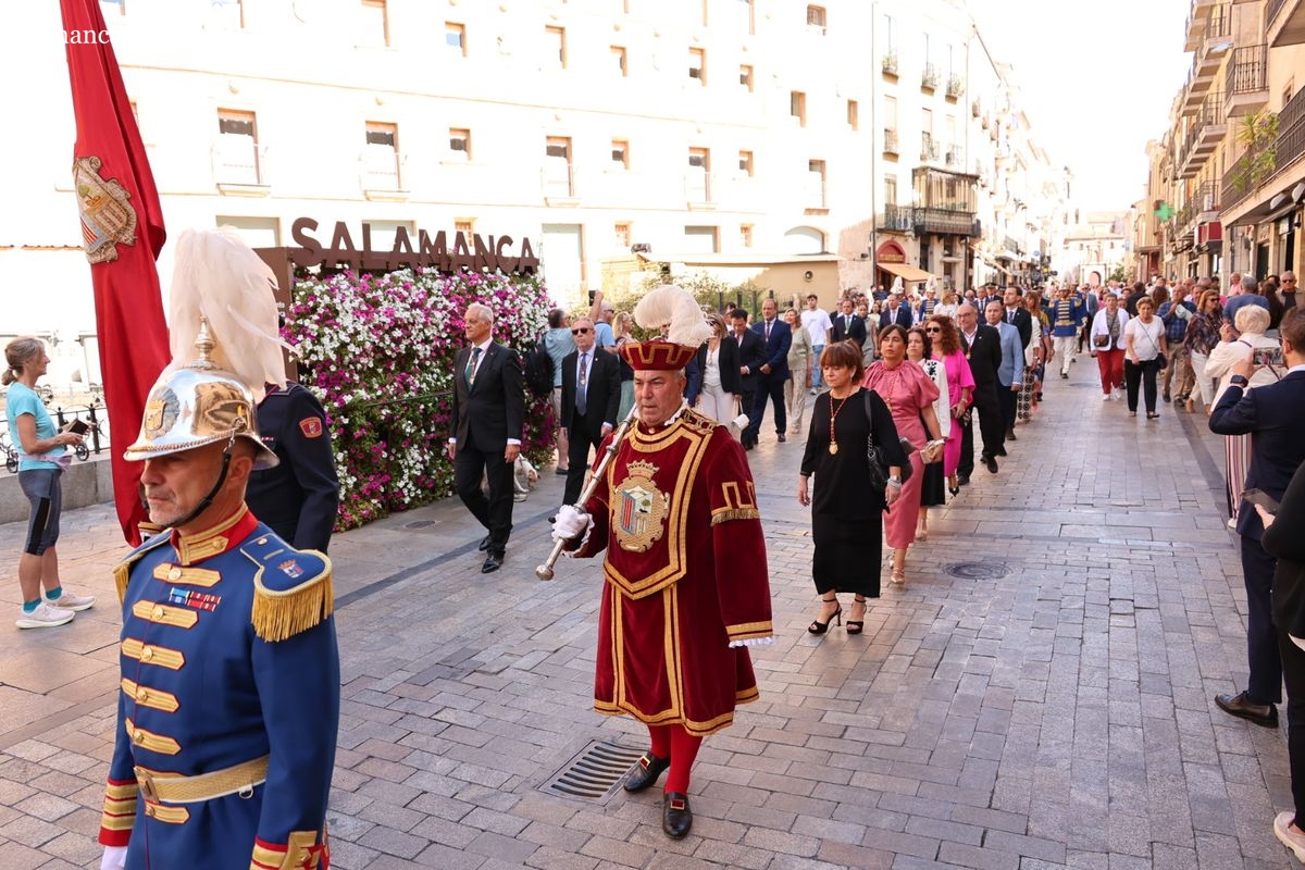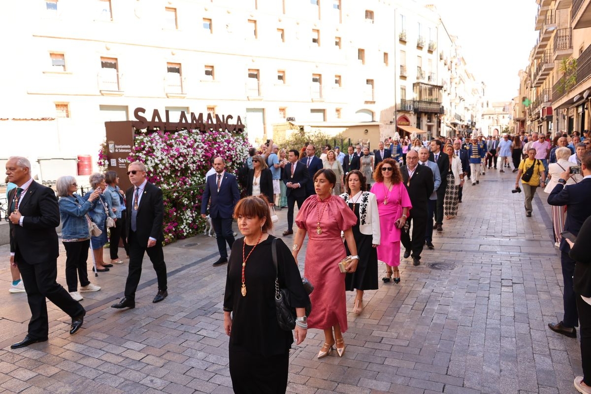 El desfile ha recorrido las calles del centro de la ciudad, ofreciendo una imagen de solemnidad y tradición. Los ediles del consistorio salmantino lucieron para la ocasión elegantes trajes, portando visiblemente las medallas que les acreditan como concejales de la ciudad.